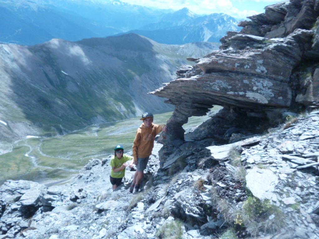 salita effettuata dal vallone di Almiane anzichè dalla valfredda dove si erano addensate, contro ogni previsione meteo, dense nubi. forse la scelta non è stata la migliore possibile, forse meglio le nuvole che una pietraia infinta percorsa in traverso per prendere quota al fine di evitare uno lungo sviluppo con salita finale; anche questa forse non si è rivelata la scelta migliore; considerata la presenza di due grandi lingue di neve sul fondo valle (utilizzate in discesa) forse era meglio percorrere tutta la valle e poi risalire gli ultimi 400mt scarsi per raggiungere il colletto alla base della punta, utilizzando le strisce di neve, decisamente più agevoli da risalire; (considerato anche che avevamo a disposizione i ramponi leggeri da escursione, quelli con struttura in silicone e 10 punte per intenderci ottimi per questi semplici nevai); tutto questo per dire che la salita da valfredda puntando a Testa del Coin è probabilmente più agevole; dal colletto un dislivello di 70 mt ci separa dalla cima; ora, non è molto chiaro qual’è la cima; due facili passi conducono ad una prima punta dove qualcuno ha lasciato nastri e bandierine avvolte intorno ad un ometto gigante; ma l’altimetro segna 3025mt quindi la punta dovrebbe essere il successiivo torrione; proseguiamo altri due passi facili e un po’esposti (tra questi il passaggio del “masso sospeso” come da foto)e si giunge su di un altra cima; qui l’altimetro segna 3050mt; in teoria quindi la vetta come da IGC n°104; non ci sono ometti, paletti, croci o quant’altro possa segnare solitamente una cima; prestiamo fede all’altimetro e assumiamo di essere arrivati, anche per l’avvicinarsi rapido di nuovole nere dal Seguret e da cima del Vallonetto.