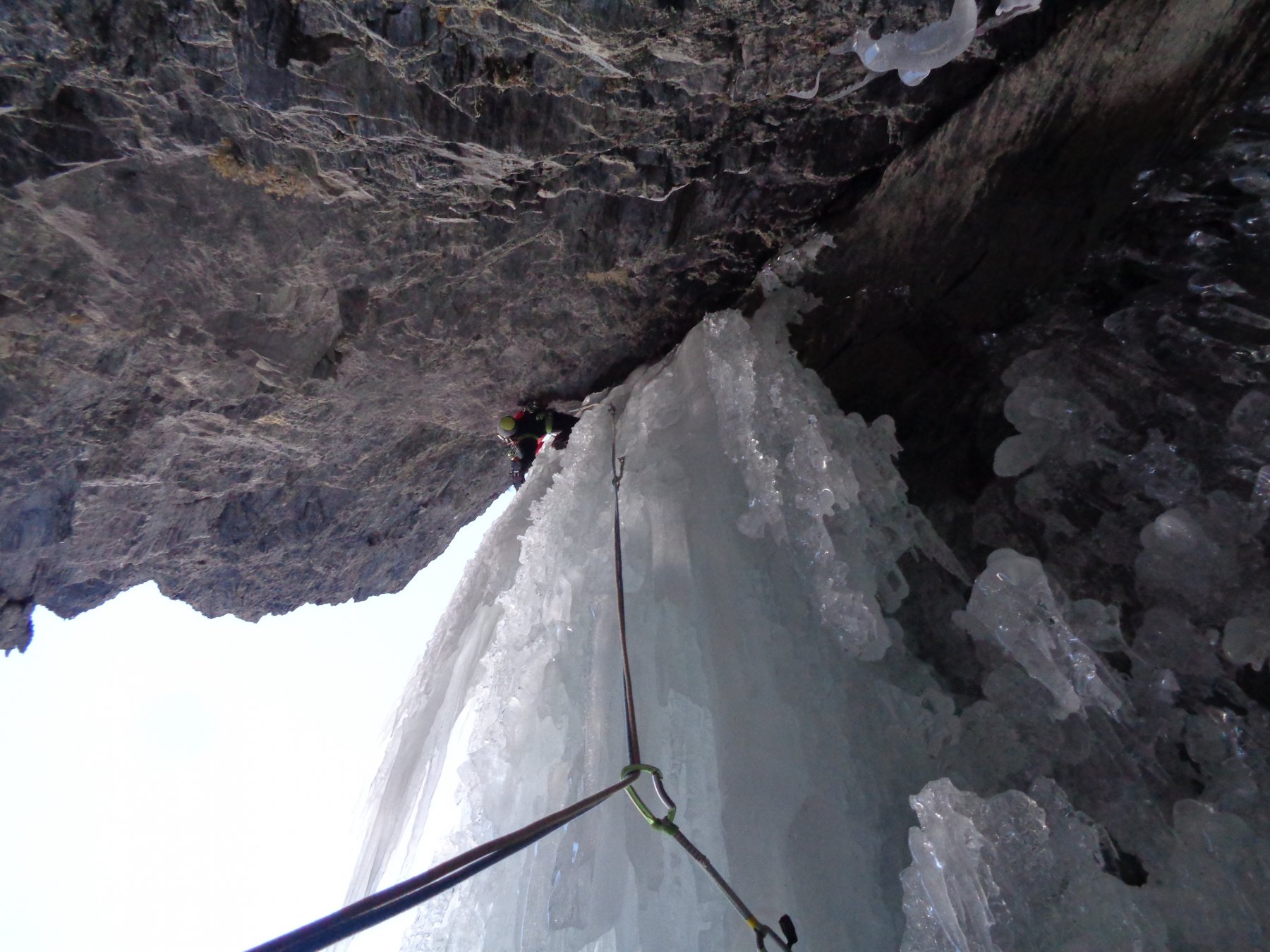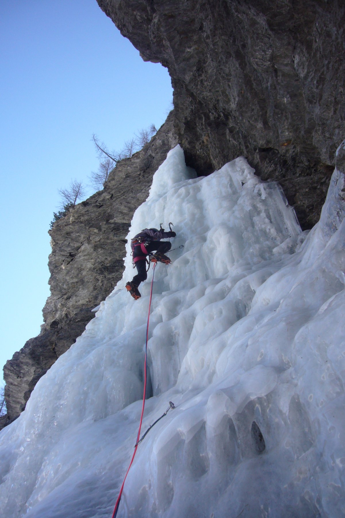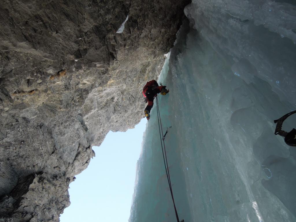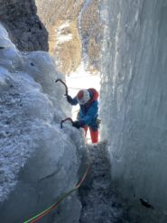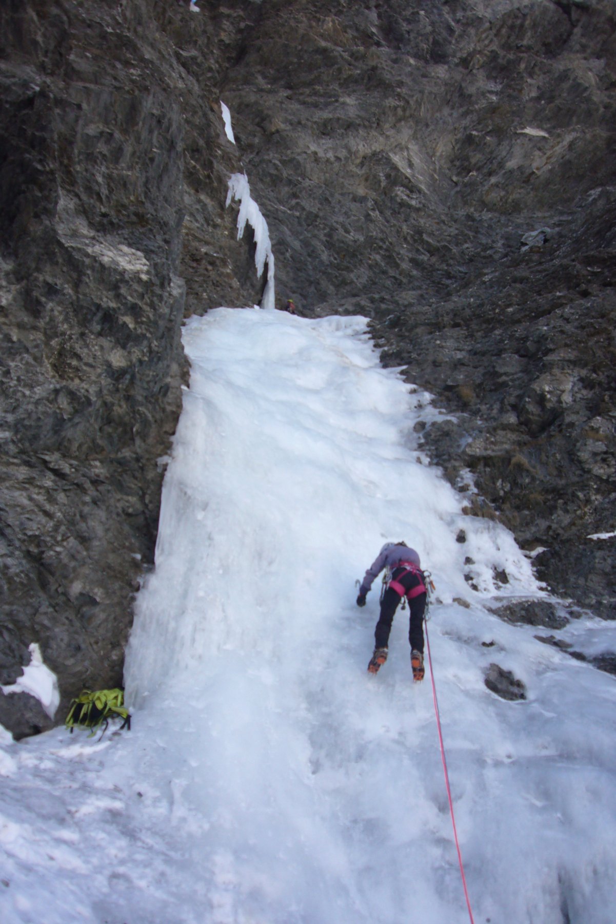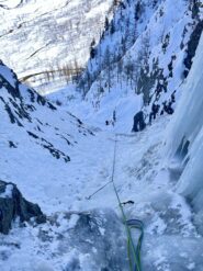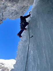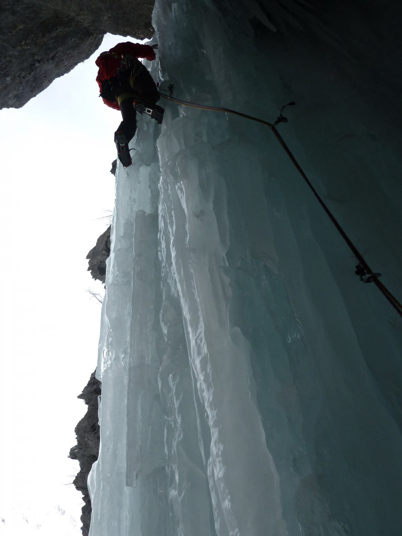 - L3: generalmente si sale sulla dx, tra roccia e ghiaccio, fino al tetto dello strapiombo. Quindi si traversa sx (90°) e si esce nella goulotte sommitale.