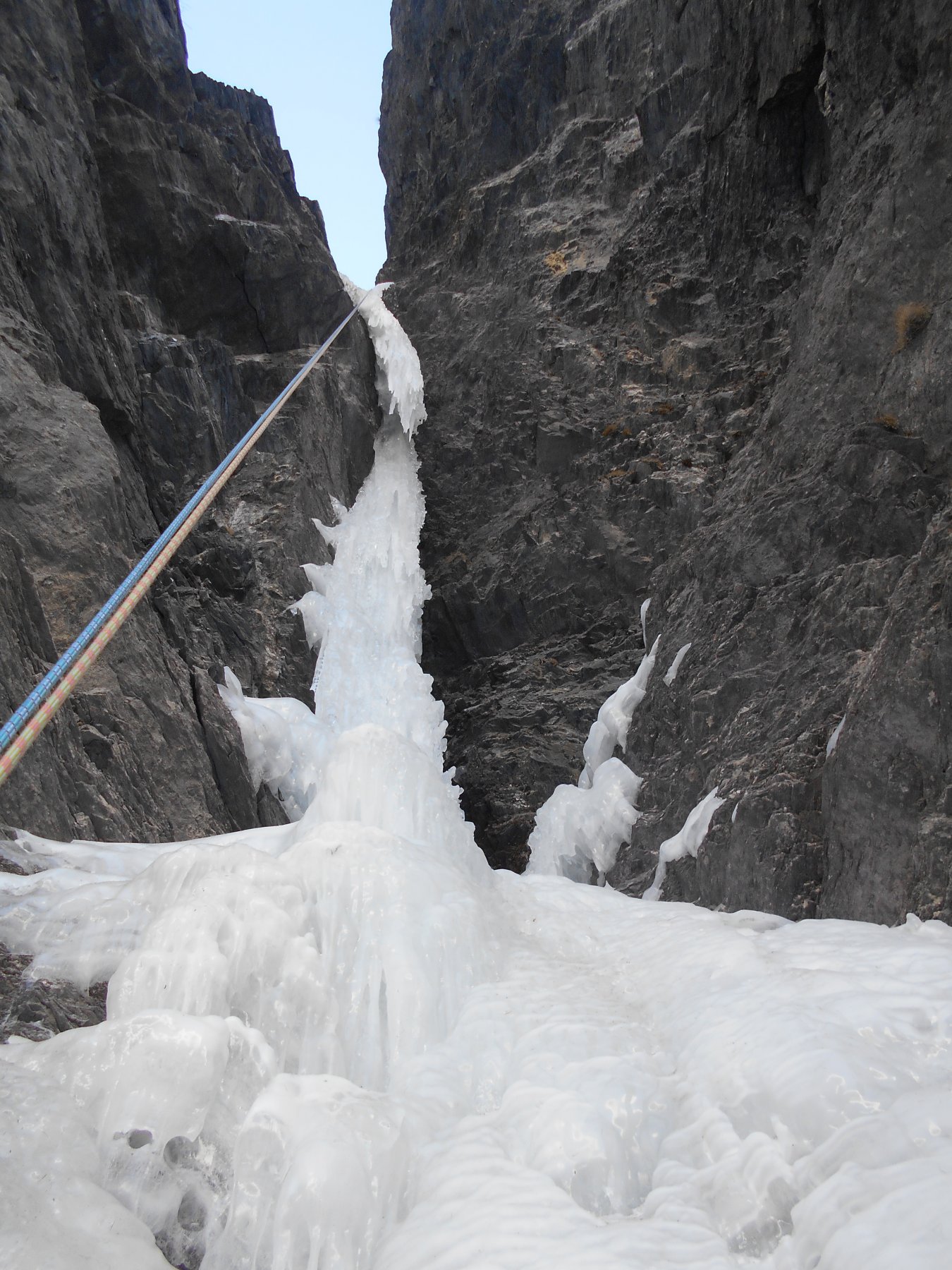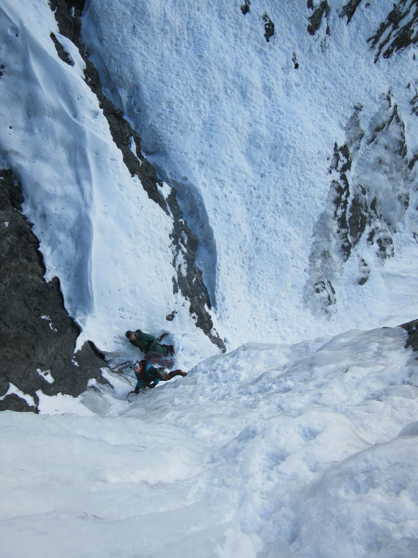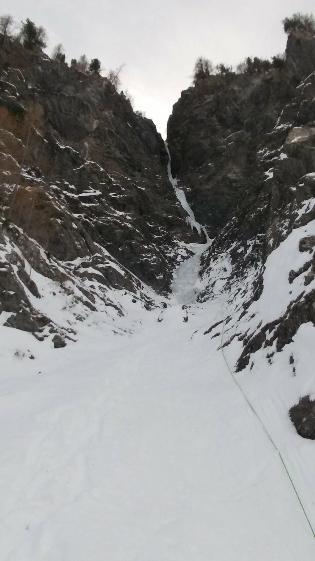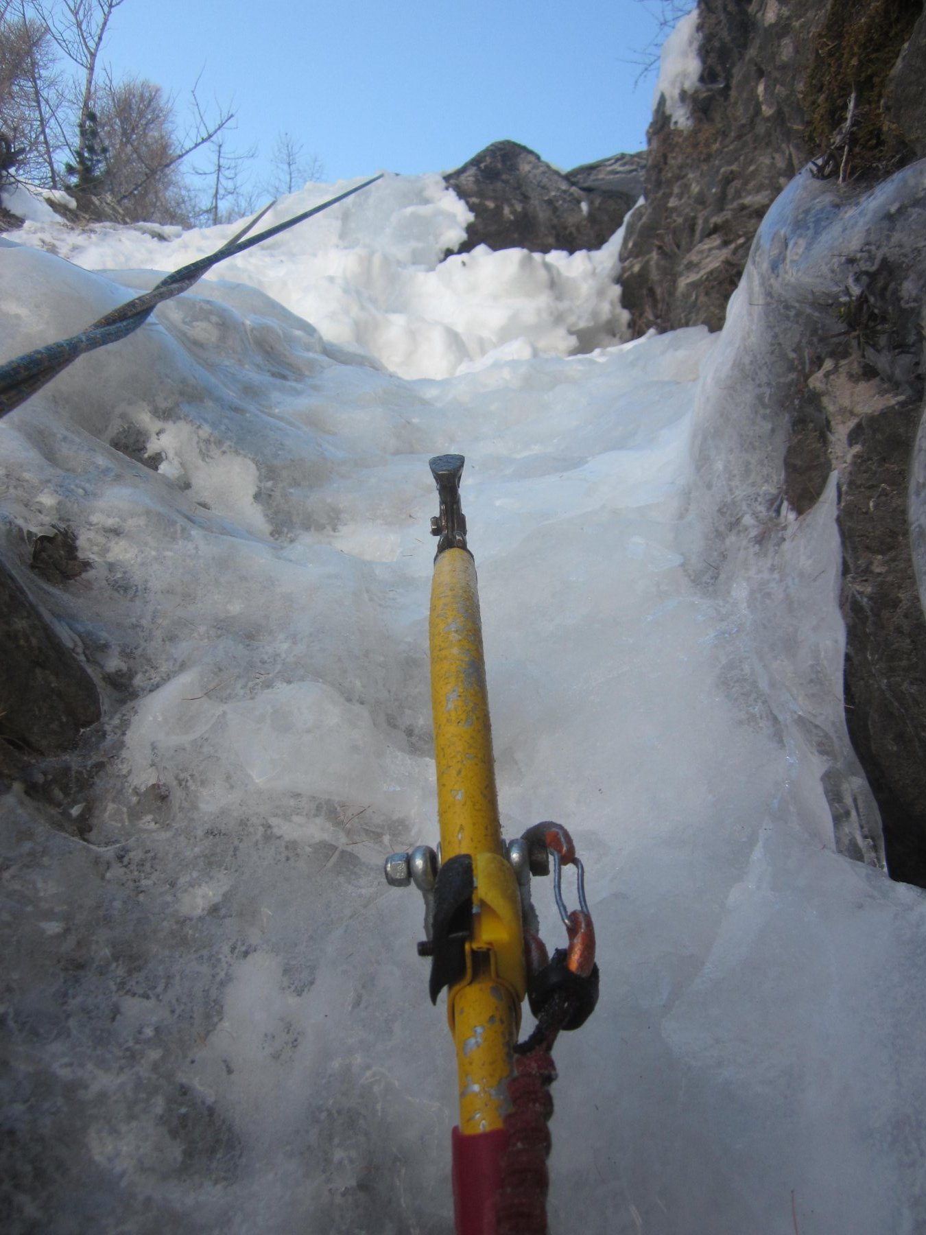 - L3: generalmente si sale sulla dx, tra roccia e ghiaccio, fino al tetto dello strapiombo. Quindi si traversa sx (90°) e si esce nella goulotte sommitale.
