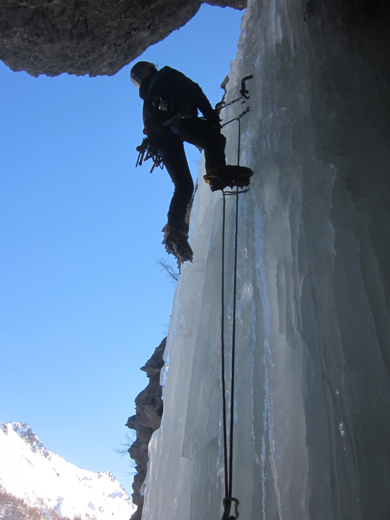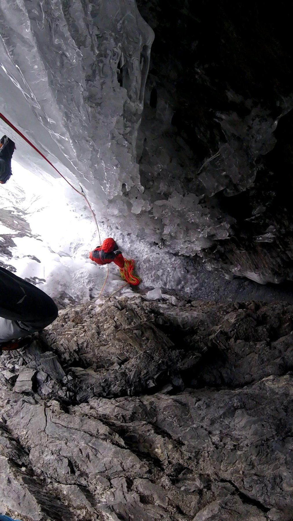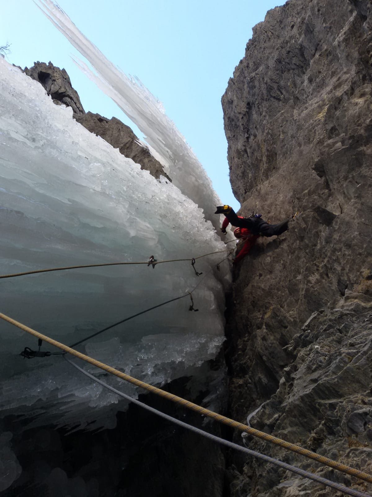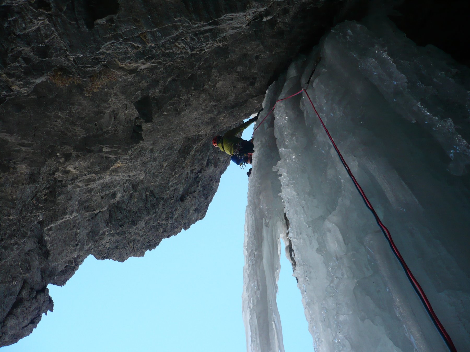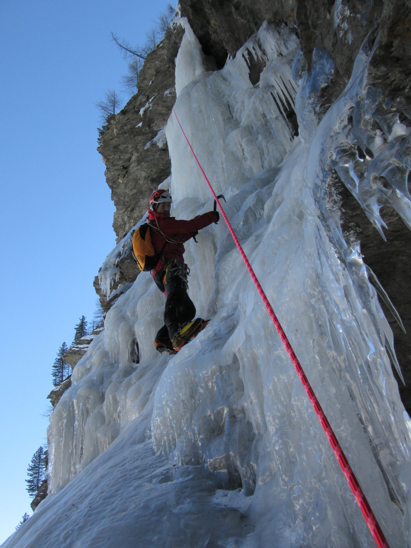 - L3: generalmente si sale sulla dx, tra roccia e ghiaccio, fino al tetto dello strapiombo. Quindi si traversa sx (90°) e si esce nella goulotte sommitale.