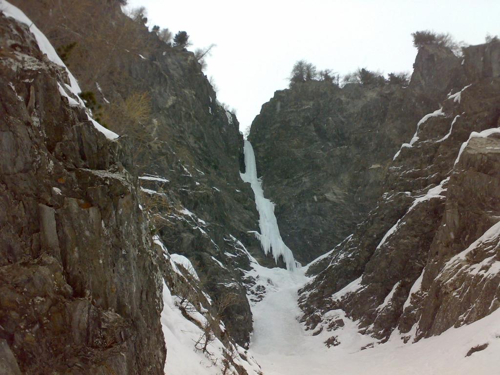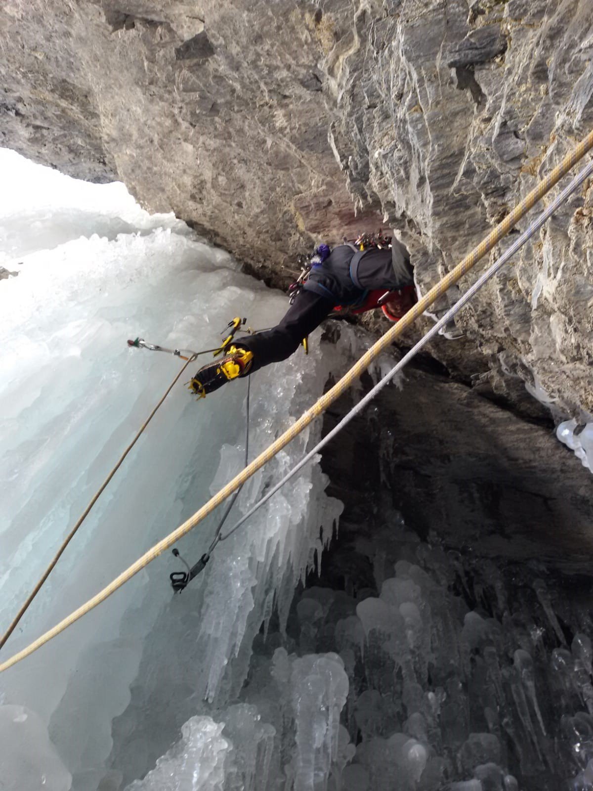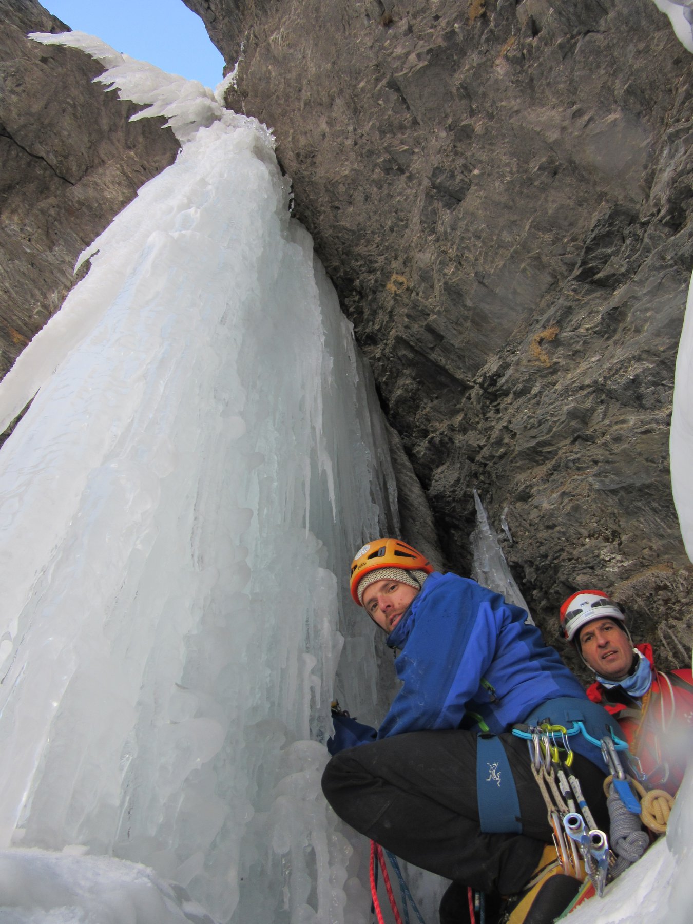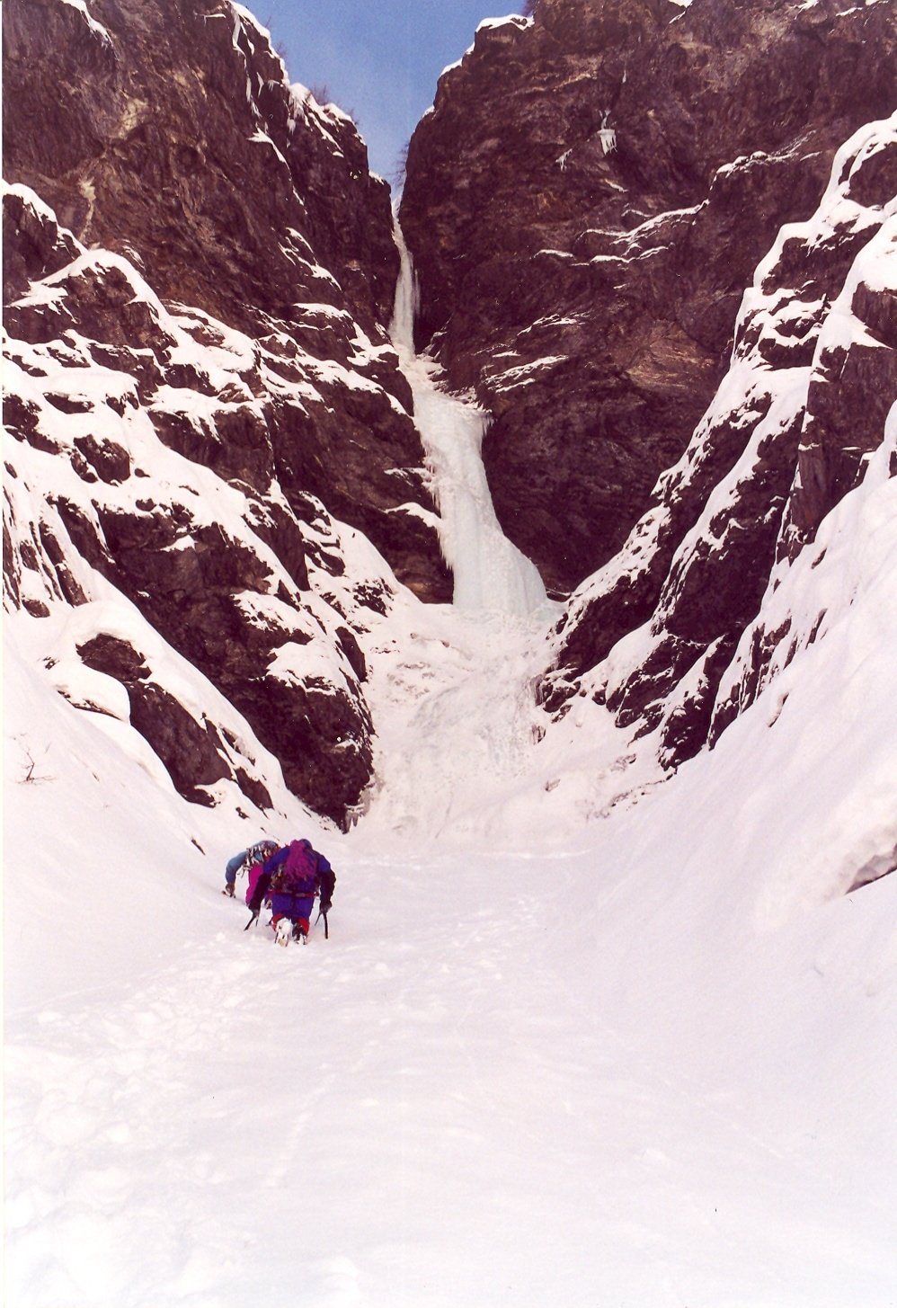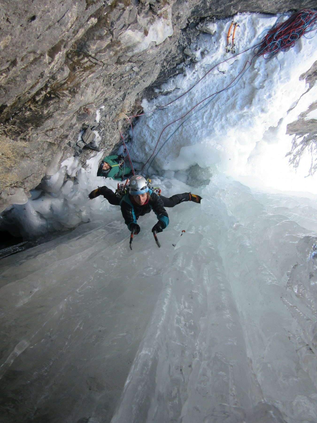 - L3: generalmente si sale sulla dx, tra roccia e ghiaccio, fino al tetto dello strapiombo. Quindi si traversa sx (90°) e si esce nella goulotte sommitale.
