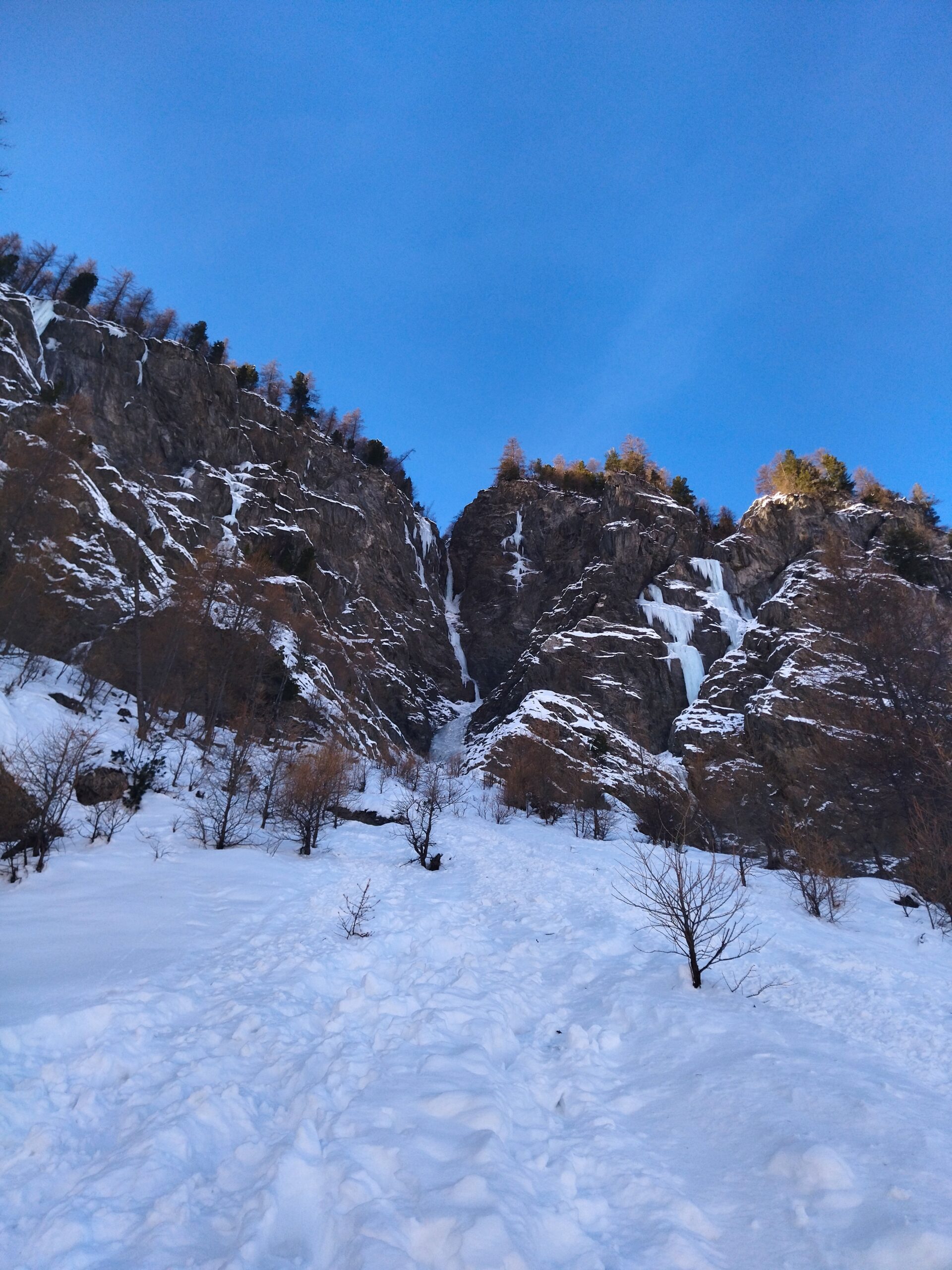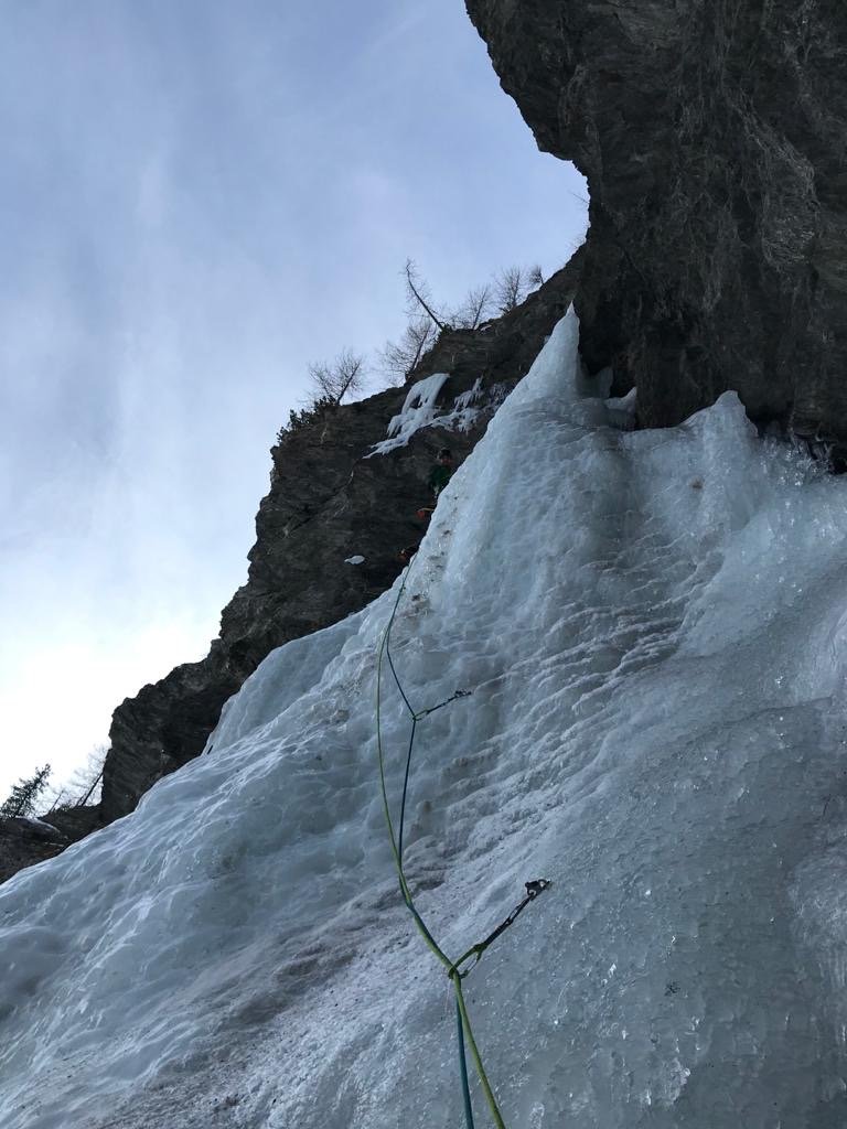 La cascata presenta 3 tiri di cui l'ultimo è il più impegnativo. Le soste sono tutte presenti a fix sulla dx salendo, la terza su albero.