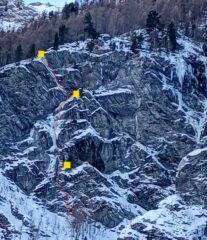 L1: attaccare nel diedro sotto la bolla di ghiaccio (15m a dx della verticale della cascata), salire il ghiaccio traversare un paio di metri a sx e salire i due strapiombini fessurati, piegare leggermente a dx nella nicchia sosta su gigaspuntone, M5+ 30m