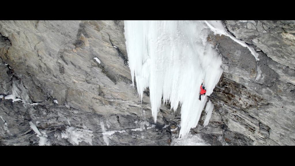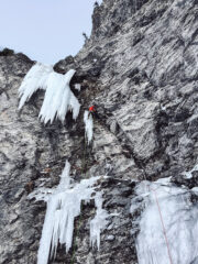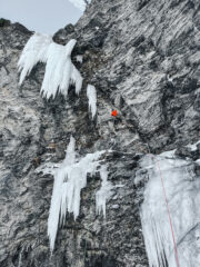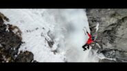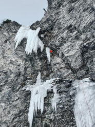 Un facile scivolo ghiacciato conduce a una sezione di dry su buoni agganci e incastri, con qualche tacca e piede più sfuggente. Si traversa a sinistra sulla prima medusa che si rimonta con passi delicati tra roccia e ghiaccio. Con un aereo volteggio si guadagna la frangia principale nel suo punto più esile. Da qui in avanti ci si protegge su ghiaccio (attenzione agli attriti): un ulteriore traverso a sinistra porta in piena esposizione sulla parte più verticale della colata che si sale fino alla fine delle difficoltà.