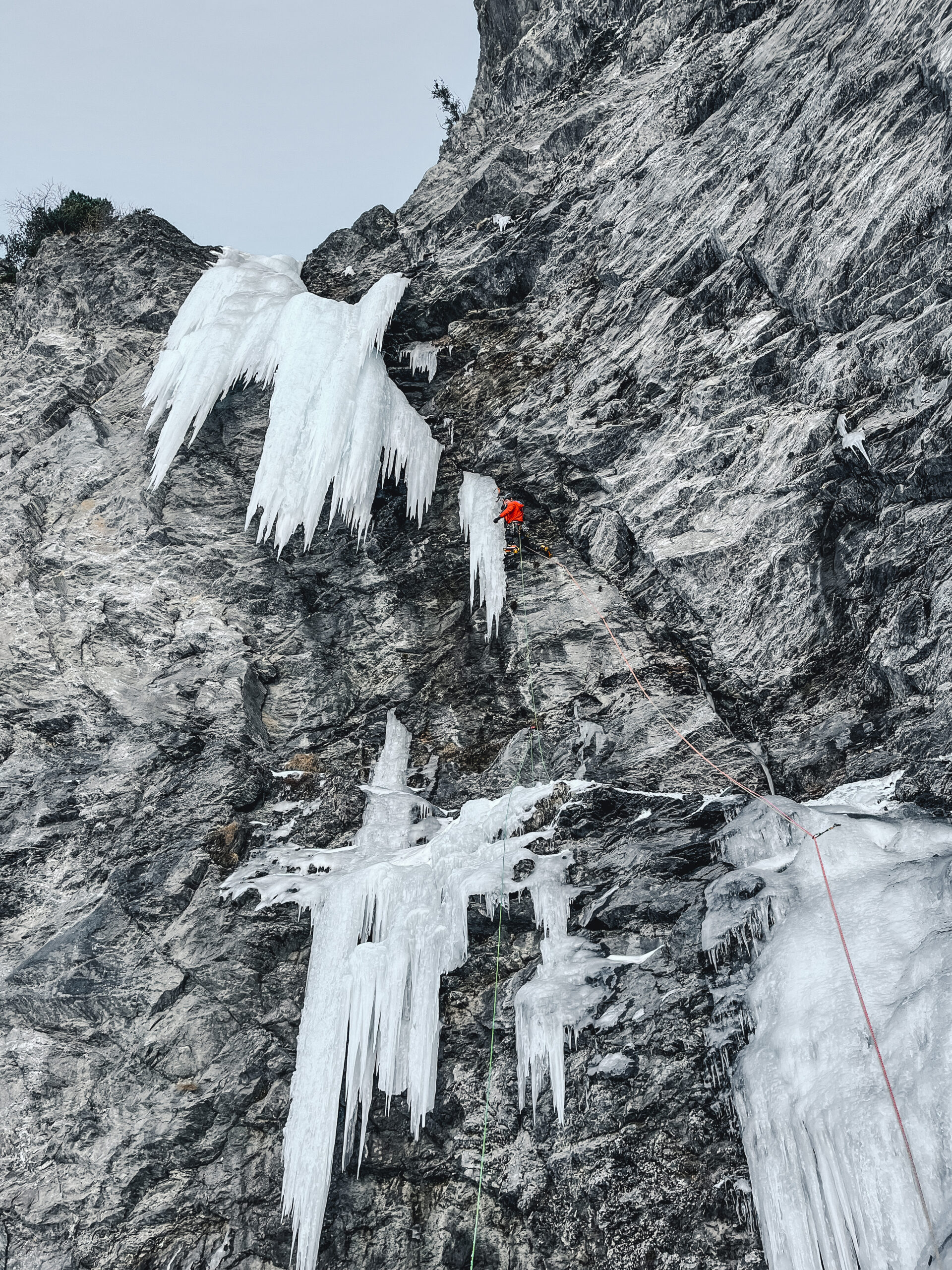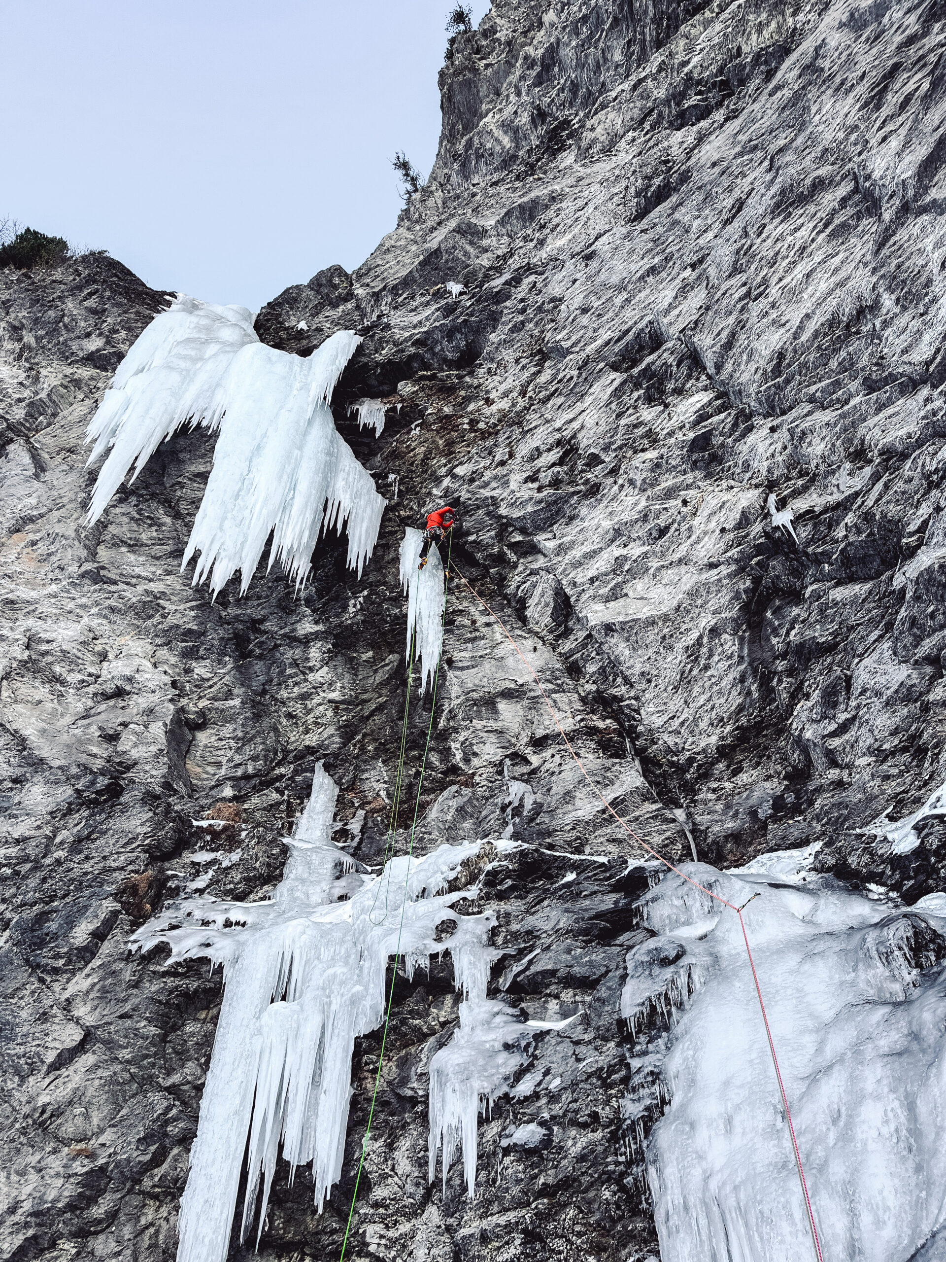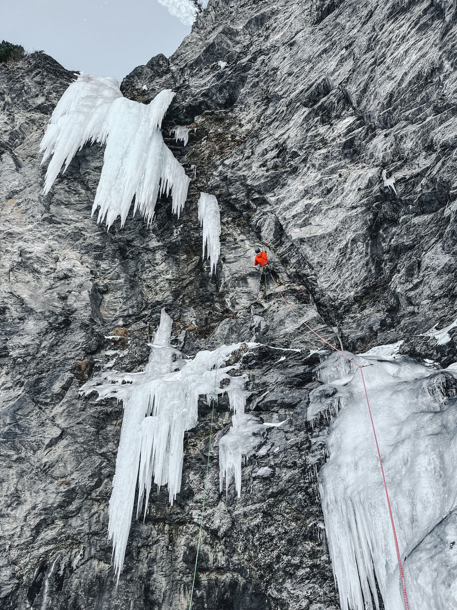 Materiale: 7 rinvii, slunghi, 7-8 viti da ghiaccio, mezze da 60 obbligatorie