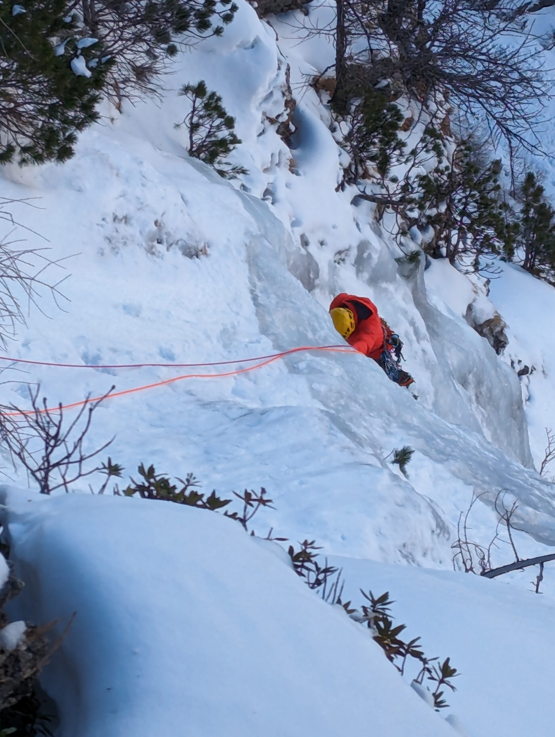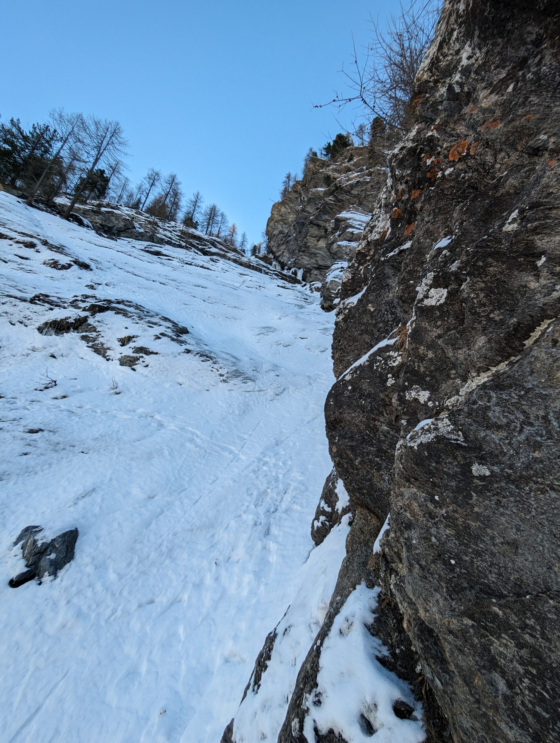 - L3, WI 4/M4-5, 35m: attaccare la colata con un paio di passi di misto su roccia e candele delicate. Proseguire per una decina di metri su un sottile velo di circa una decina di cm di giaccio da proteggere con viti corte. Passaggio di M4 in uscita per fare sosta su un albero.
