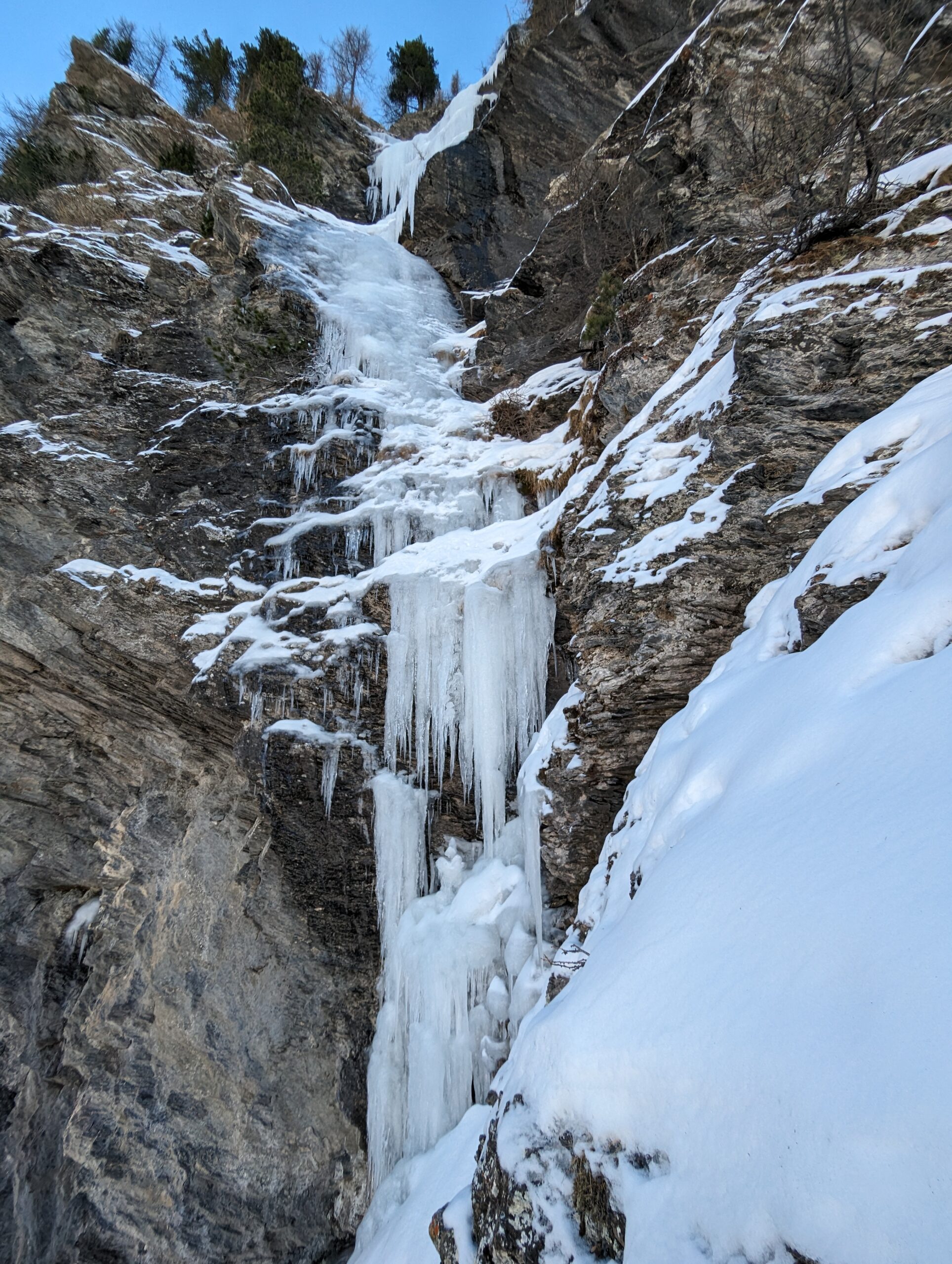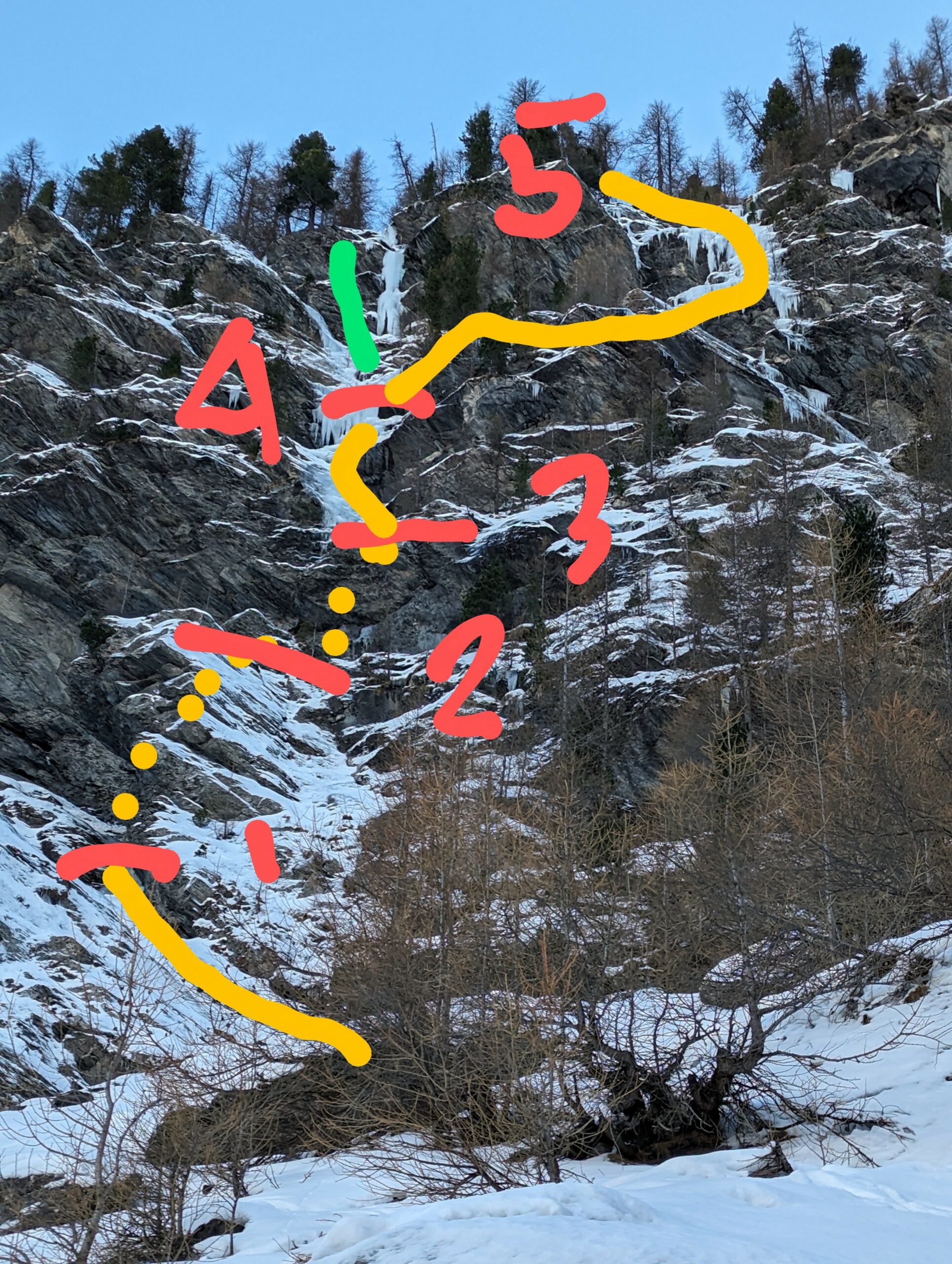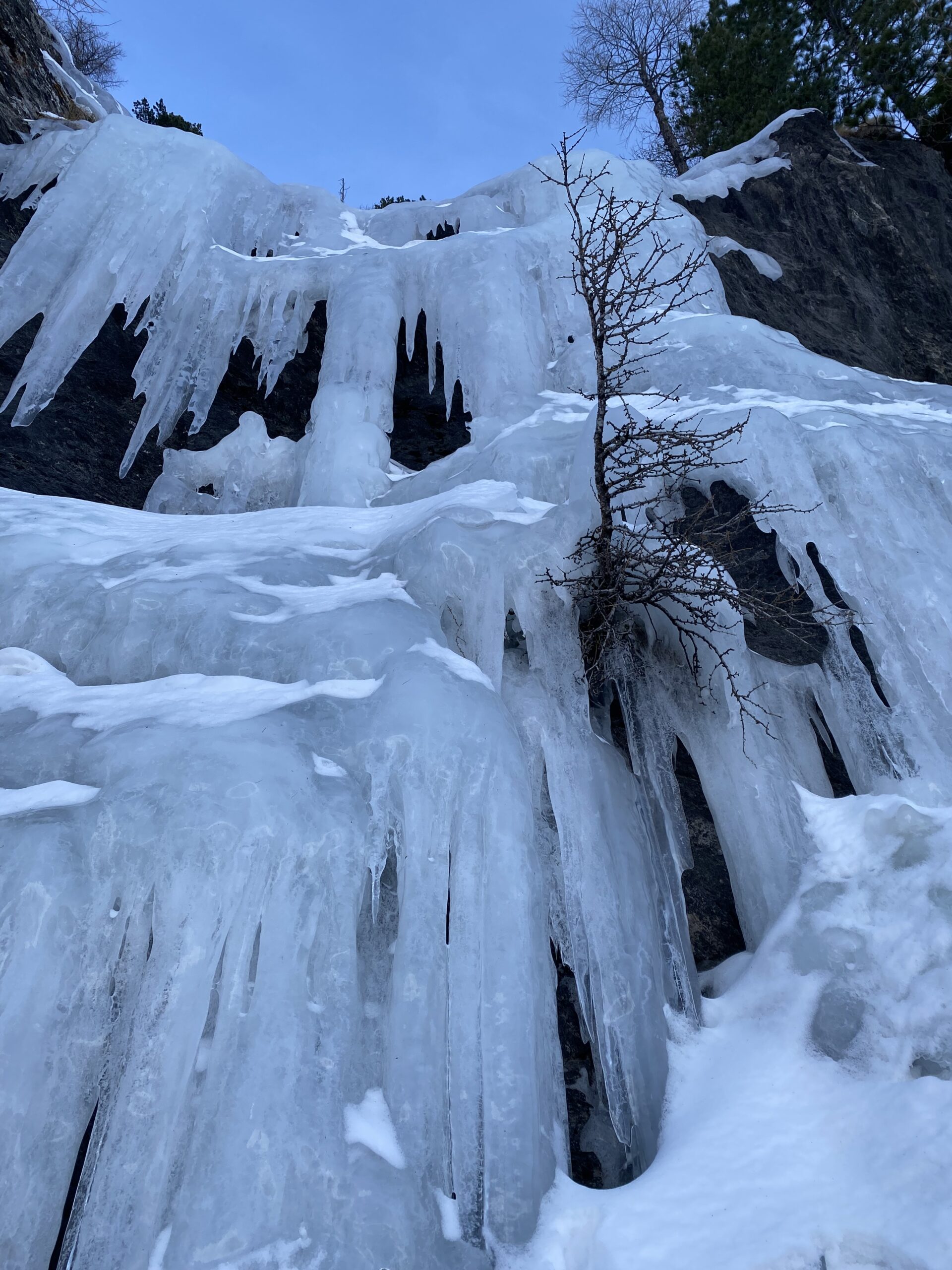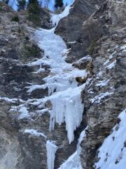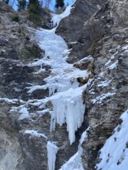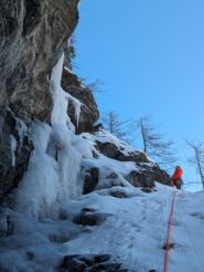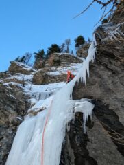 - L1, WI 2, 60m: seguire la colata di ghiaccio a sinistra del roccione che aumenta leggermente di pendenza salendo su un ghiaccio molto nero misto a terra. Sosta su ghiaccio dopo 60 metri giusti