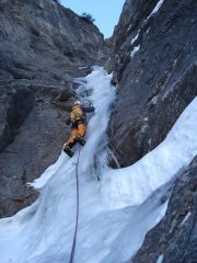presenti soste a spit: la prima si trova sulla sinistra circa 15 mt prima di una vecchia sosta a chiodi che essendo molto più evidente si è portartati come abbiamo fatto noi a raggiungere. la seconda è sulla desta un po distante dalla linea del ghiacchio. la terza si trova sulla sinistra un decina di metri dopo la vecchia sosta a chiodi.