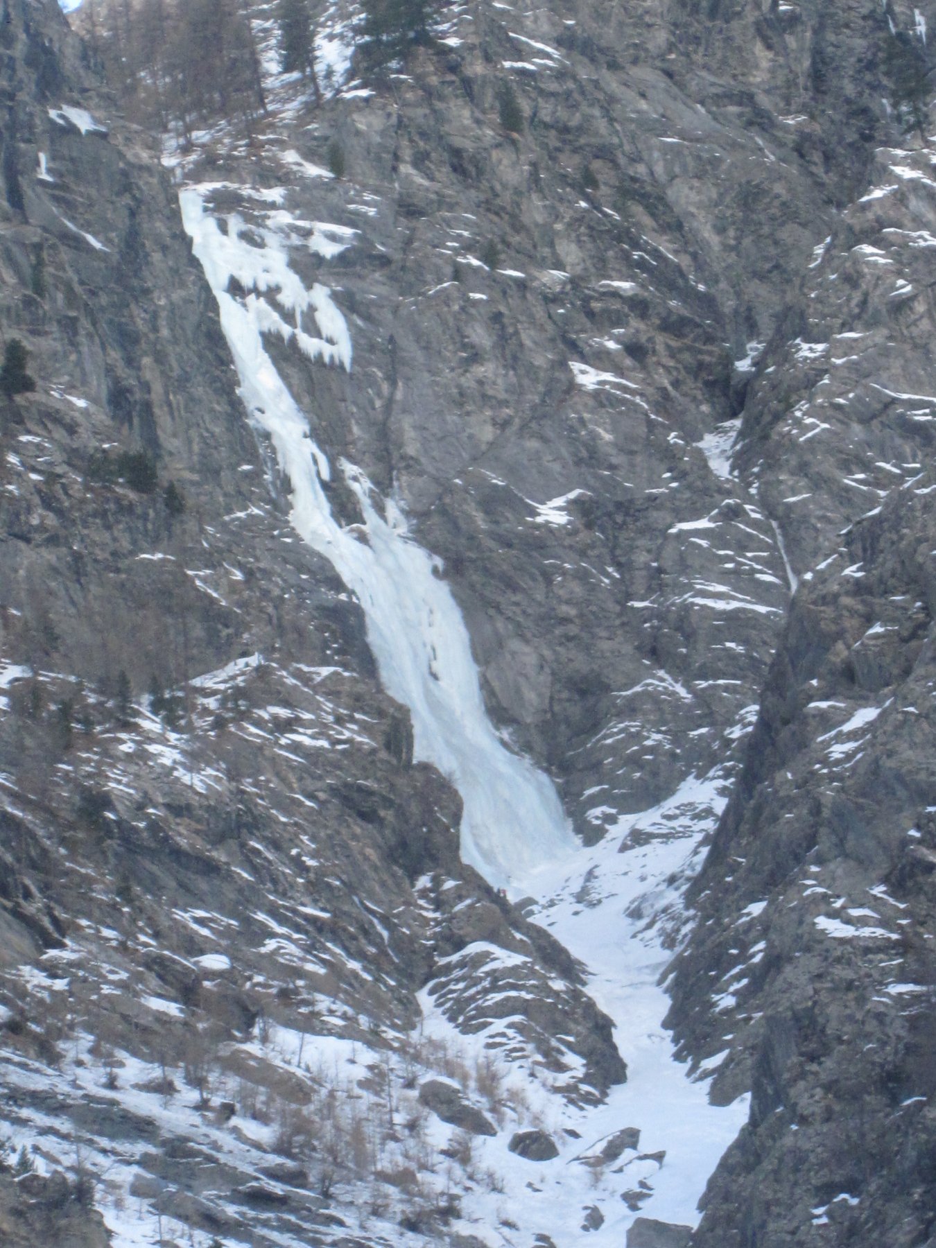oggi con max x questo itinerario veramente bello , partiti dal bivio della statale , anche se a brusa del plan c’era un auto 4×4 con catene , ma ognuno si sa prendere i propri rischi!fatto avvicinamento in un oretta abbondante in compagnia di dino e compagna ,(che saluto) loro al roch del bouscher, noi poco piu avanti , mentre i tipi dell’auto probabilmente han fatto qualcosa più avanti ancora , bella la valle argentera con i suoi pini al mattino argento, in cascata 1 grado , e alle 14 nel piano al rientro -6°,. ghiaccio buono tutto coperto con alcuni punti acqua che si vedeva scorrere , ma salibile senza problemi.