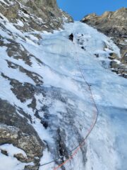 Sempre una bella cascata,ghiaccio in po’ di tutti i tipi ma cercando un po’ si riesce a trovare ghiaccio plastico e a mettere buone viti.Soste ok,discesa veloce in doppia.