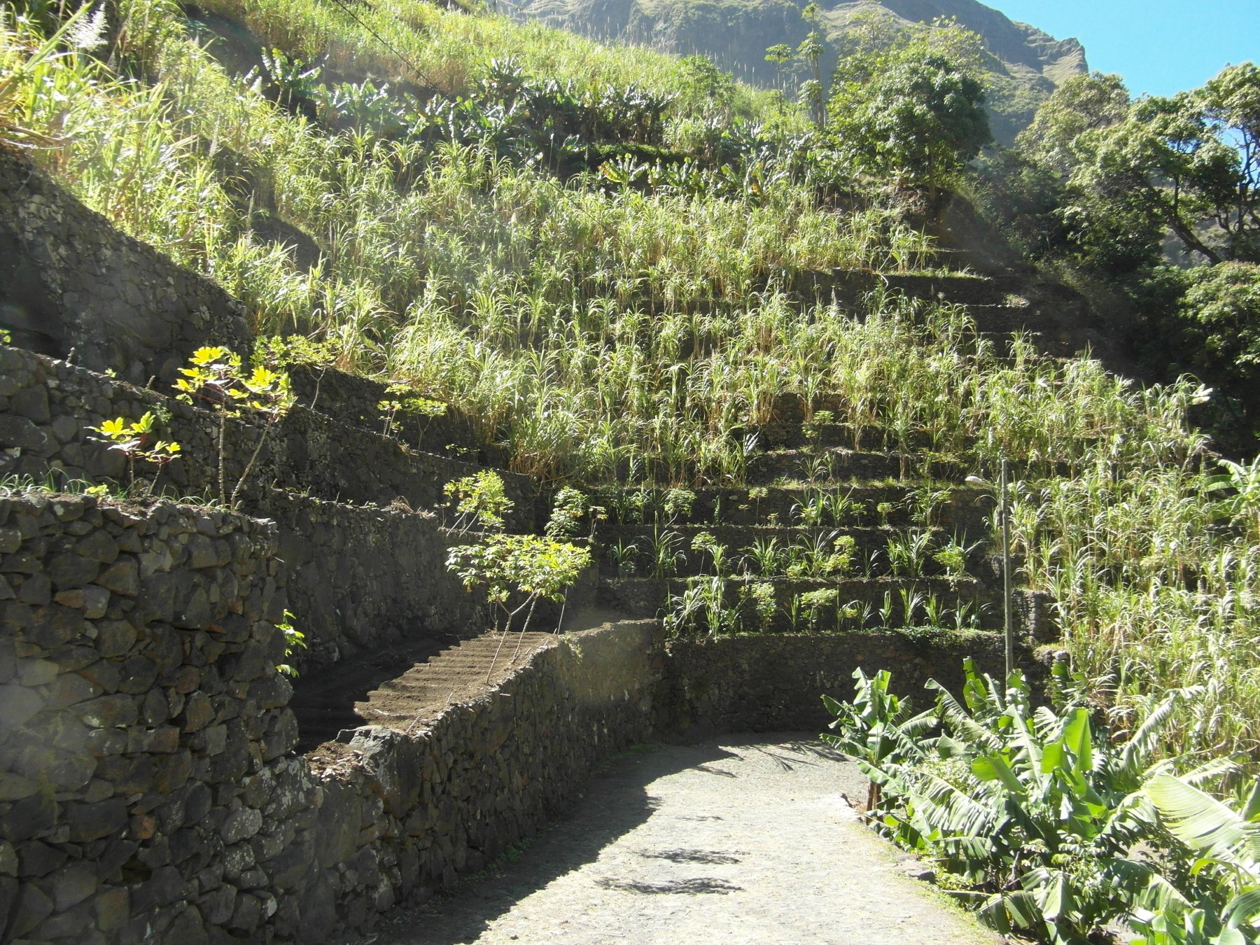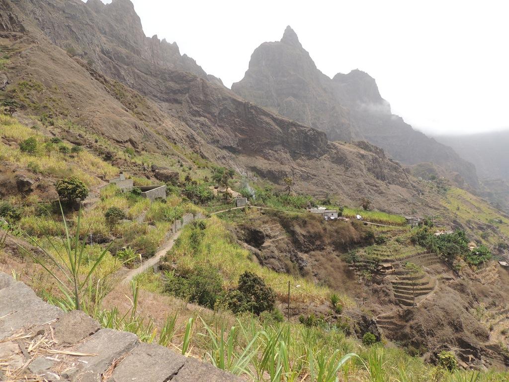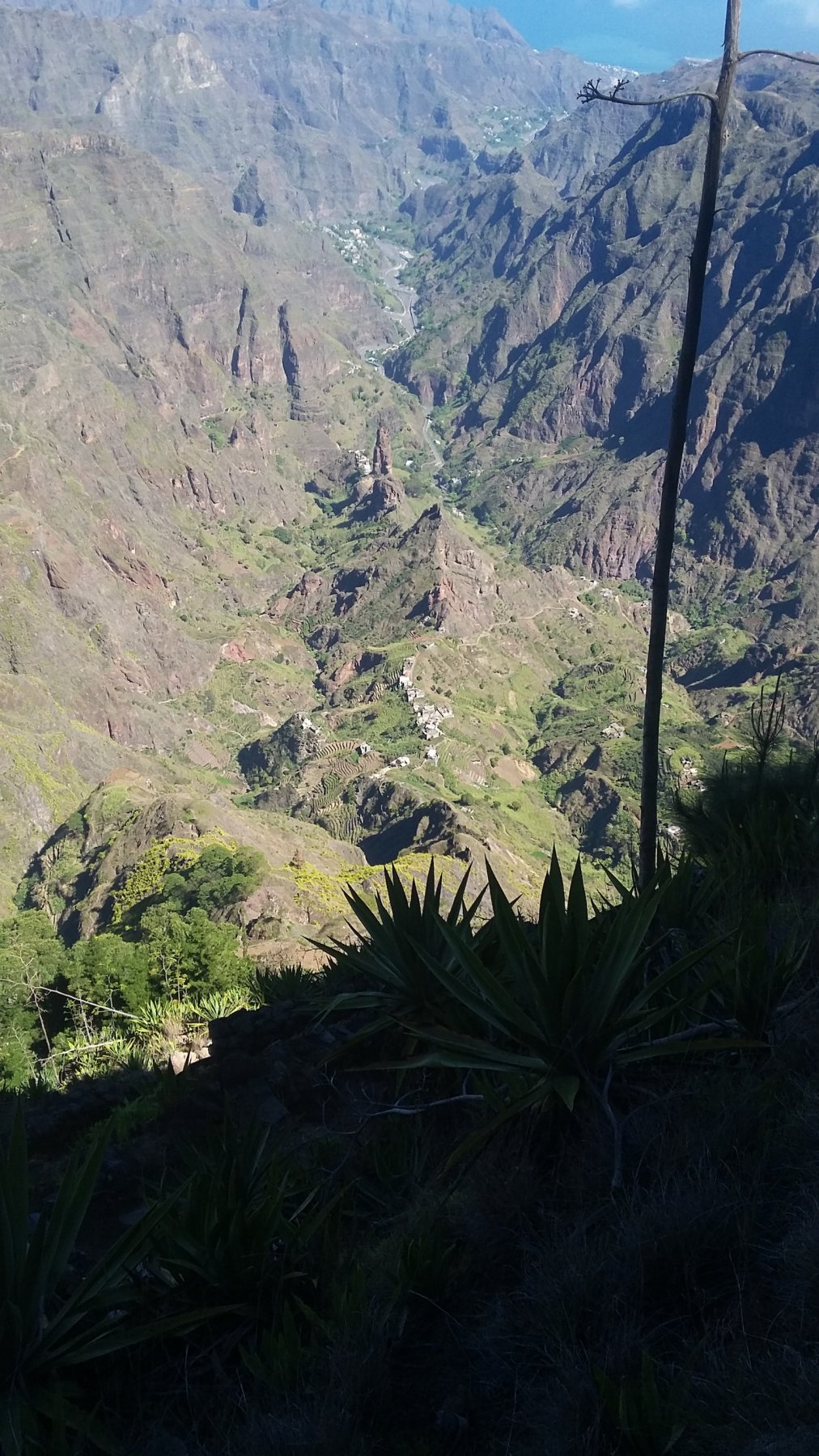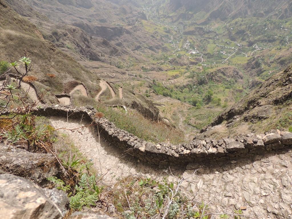 Il sentiero sale rapidamente per circa 150 metri di dislivello ed arriva ad un valico da cui si vede tutto il sentiero ed in fondo l’oceano dove si arriverà(nella foto allegata, scattata dalla vecchia strada di montagna che collega Ribeira Grande a Porto Novo -più o meno nel punti in cui i pulmini lasciano i passeggeri, col taxi è possibile farsi portare sino all’imbocco del sentiero – le frecce indicano la partenza ed il valico).