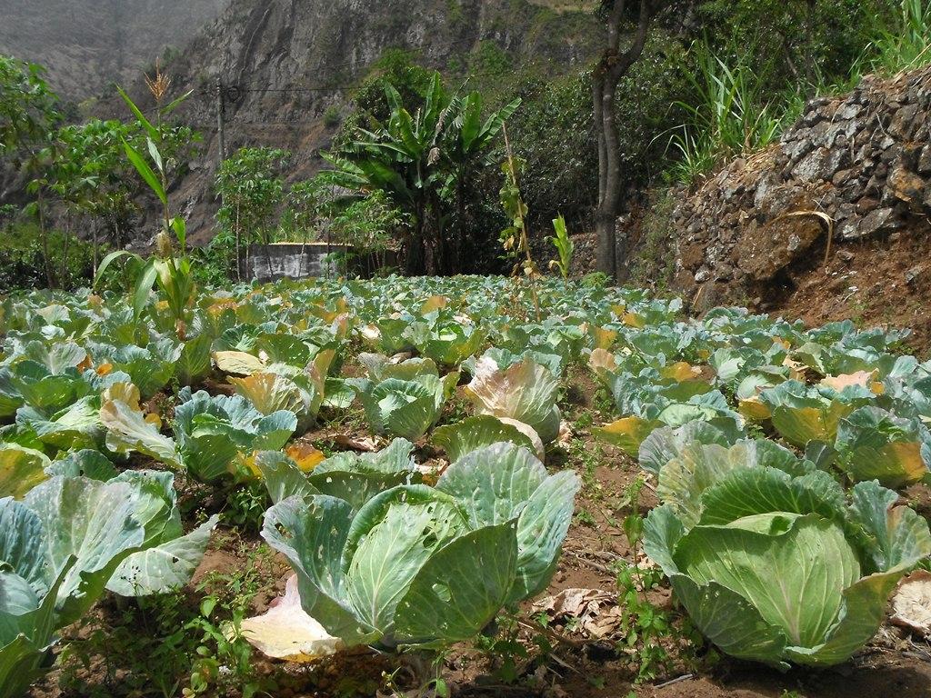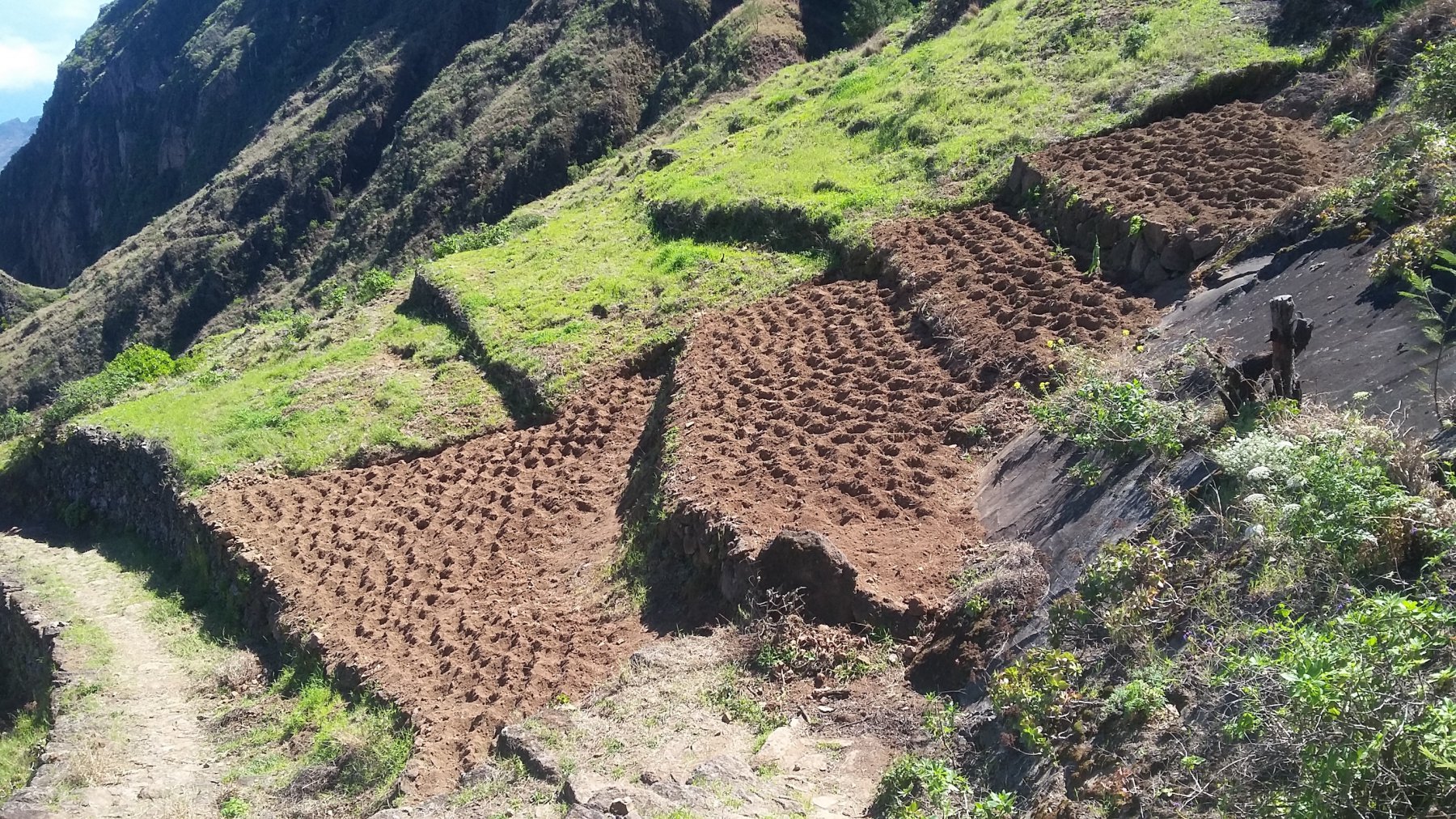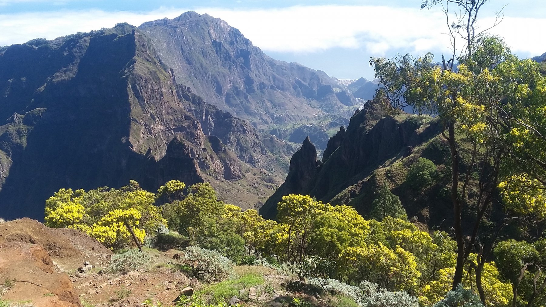 Il sentiero sale rapidamente per circa 150 metri di dislivello ed arriva ad un valico da cui si vede tutto il sentiero ed in fondo l’oceano dove si arriverà(nella foto allegata, scattata dalla vecchia strada di montagna che collega Ribeira Grande a Porto Novo -più o meno nel punti in cui i pulmini lasciano i passeggeri, col taxi è possibile farsi portare sino all’imbocco del sentiero – le frecce indicano la partenza ed il valico).