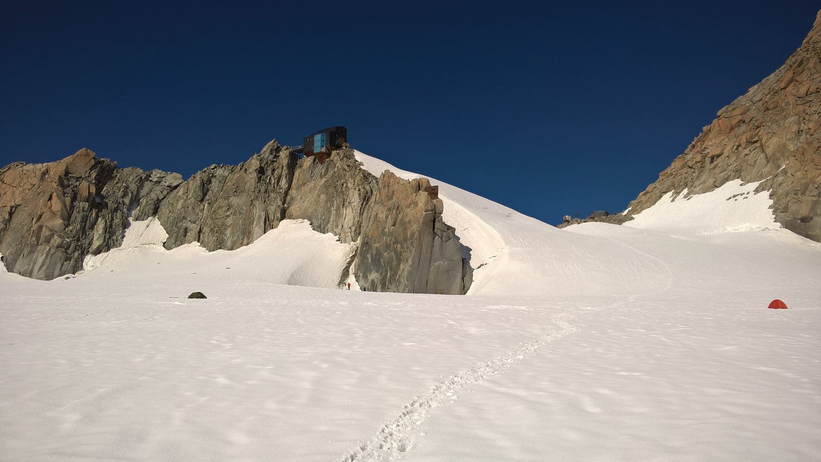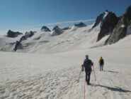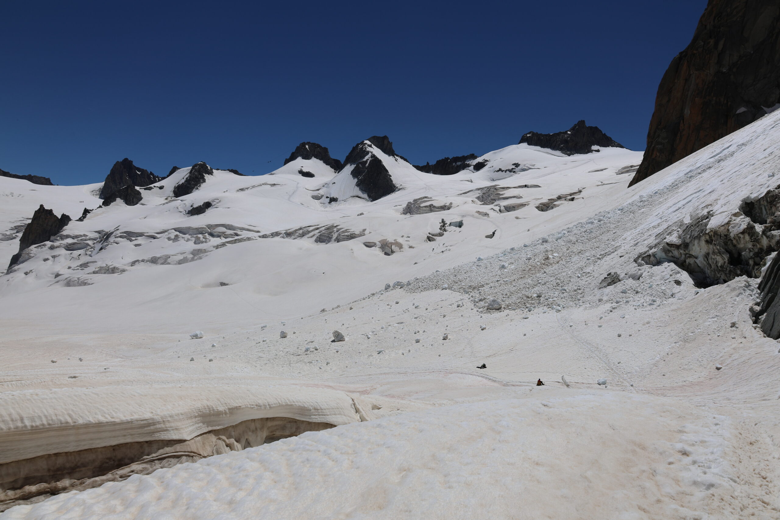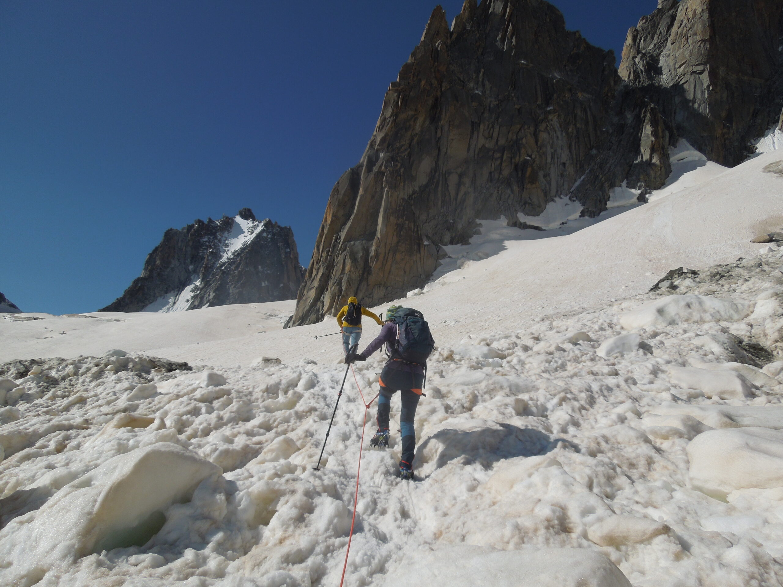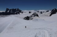 Messo piede sul ghiacciaio scendere al col Flambeau e di qui tralasciare le traccie che andando verso sinistra portano alla Tour Ronde o al Grand Capucin e proseguire dritti verso la zona dei seracchi.