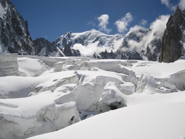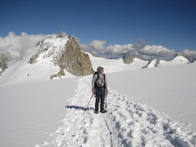 Traversata effettuata per un migliore acclimatamento per la successiva salita del giorno dopo al Mont Blanc de Tacul (vedi relazione già inserita). Per me è la prima volta che attraverso la Valeè blanche a piedi dopo averla discesa con gli sci alcune volte. Sicuramente una escursione splendida che permette di godere (molto di più che con gli sci) con tutta calma della spettacolarità dell’ambiente. Traccia ben battuta e grazie alle temperature non eccessivamente elevate ponti sui “crepi” sufficientemente sicuri ma da non sottovalutare mai!!!