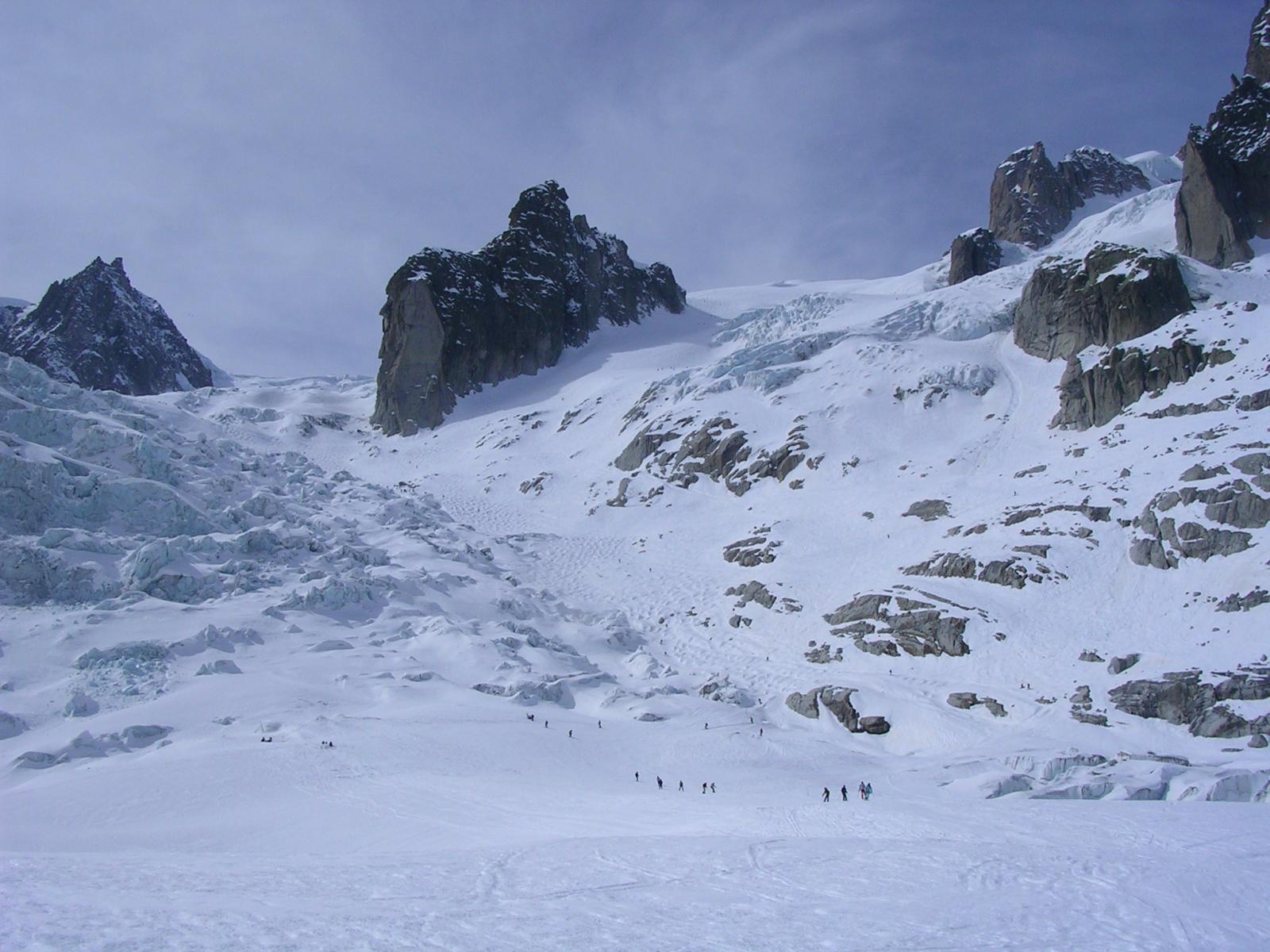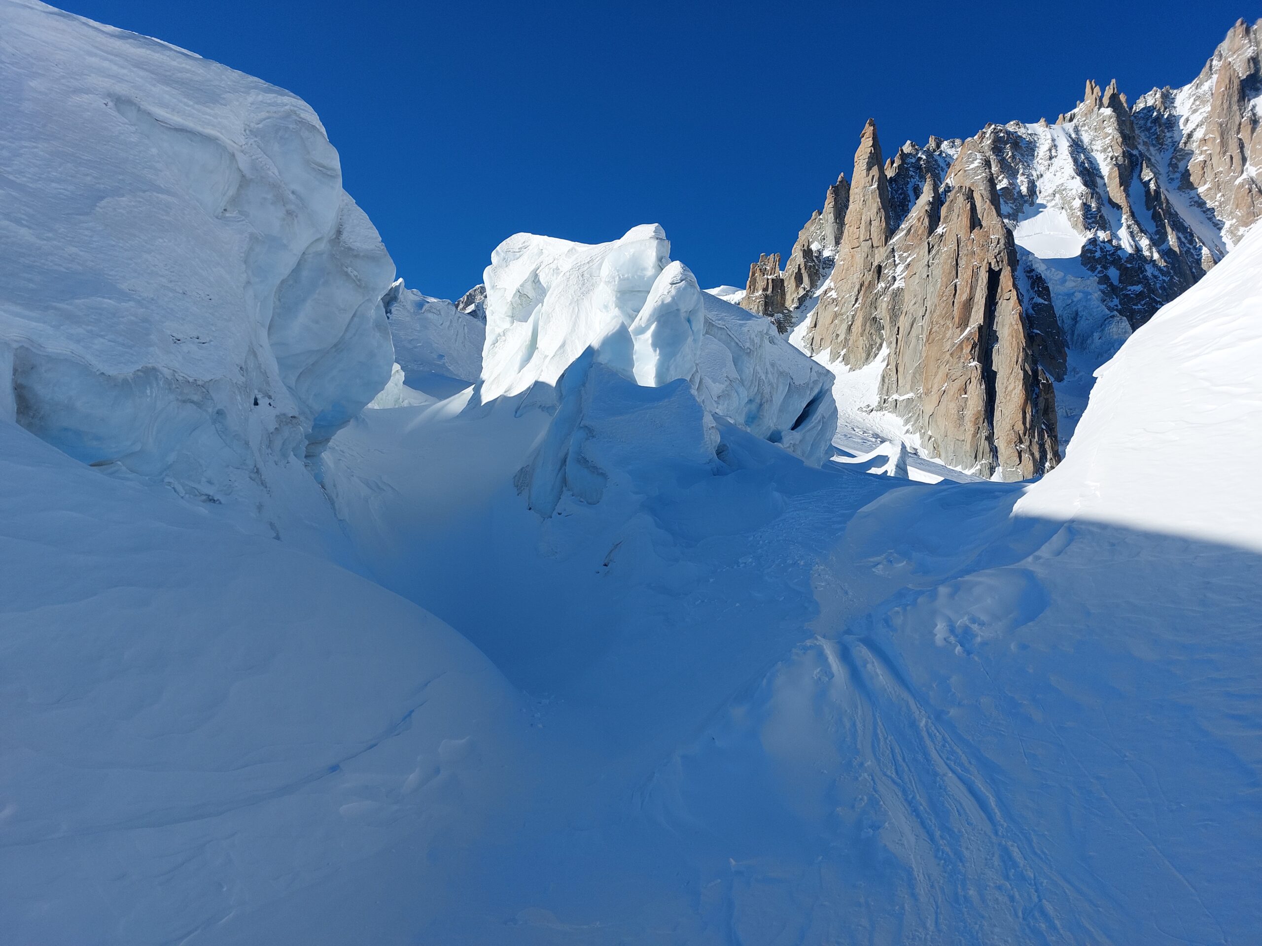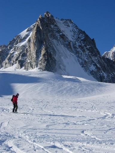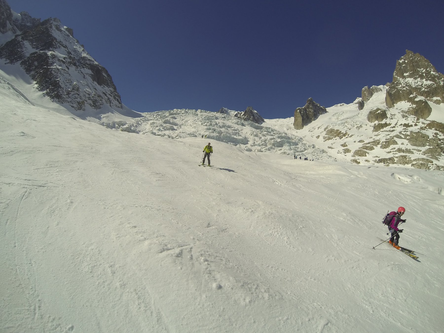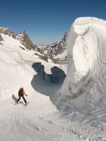 Di qui ci si tuffa per il ghiacciaio del Gigante, attraverso la bellissima serraccata sovrastata dal Grand Capucin e dai satelliti del Tacul fino a raggiungere la traccia che scende dall’ Aiguille du Midi.