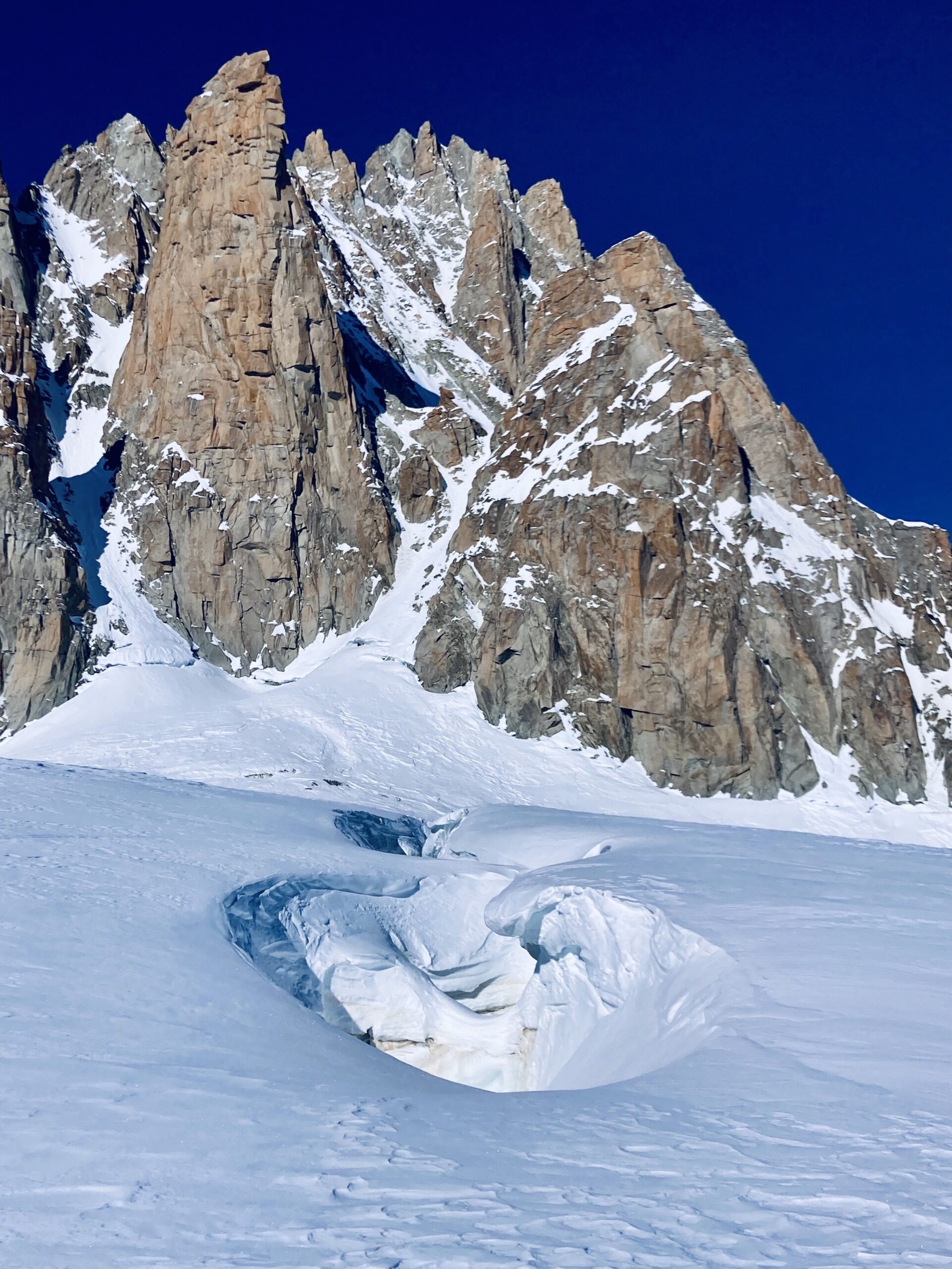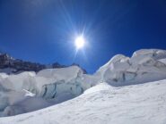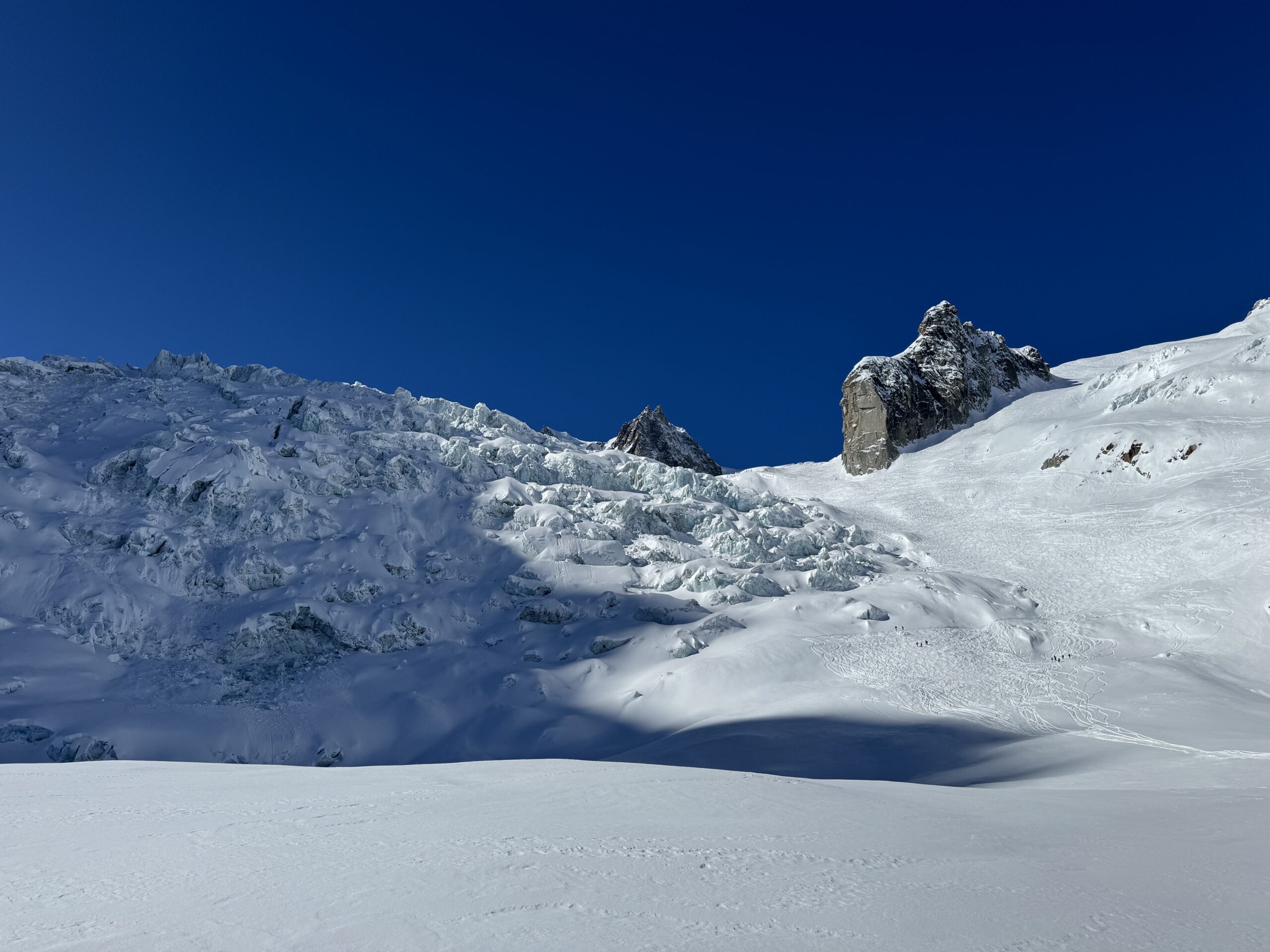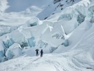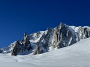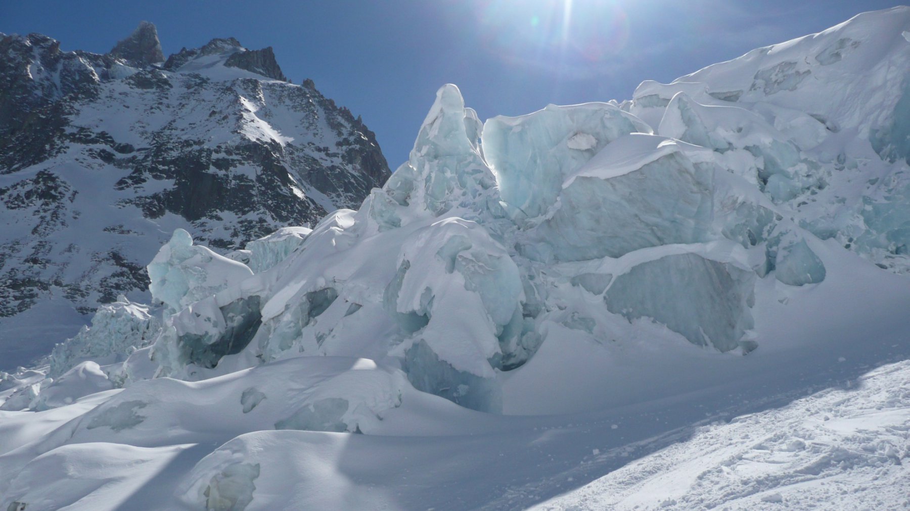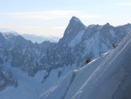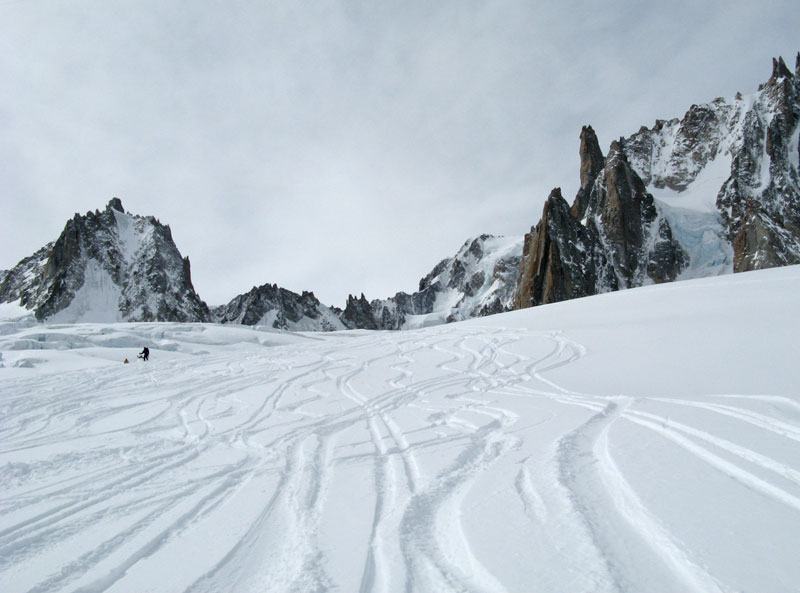 Di qui ci si tuffa per il ghiacciaio del Gigante, attraverso la bellissima serraccata sovrastata dal Grand Capucin e dai satelliti del Tacul fino a raggiungere la traccia che scende dall’ Aiguille du Midi.