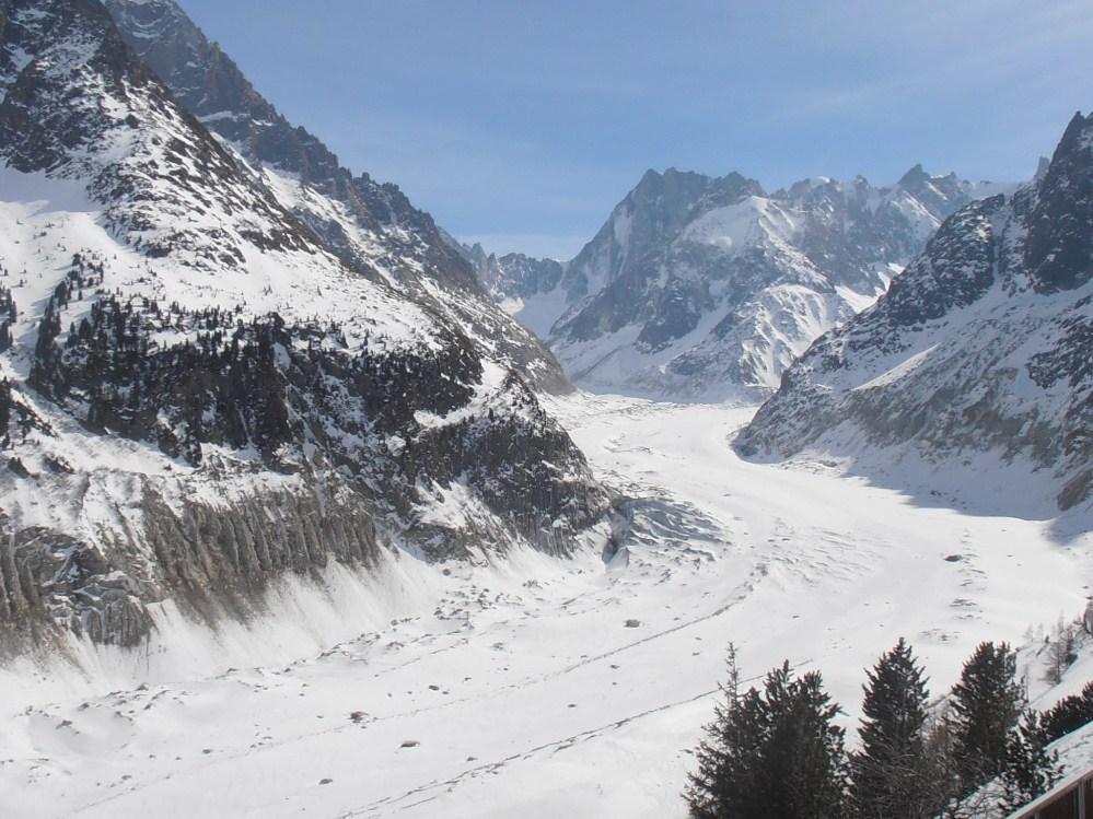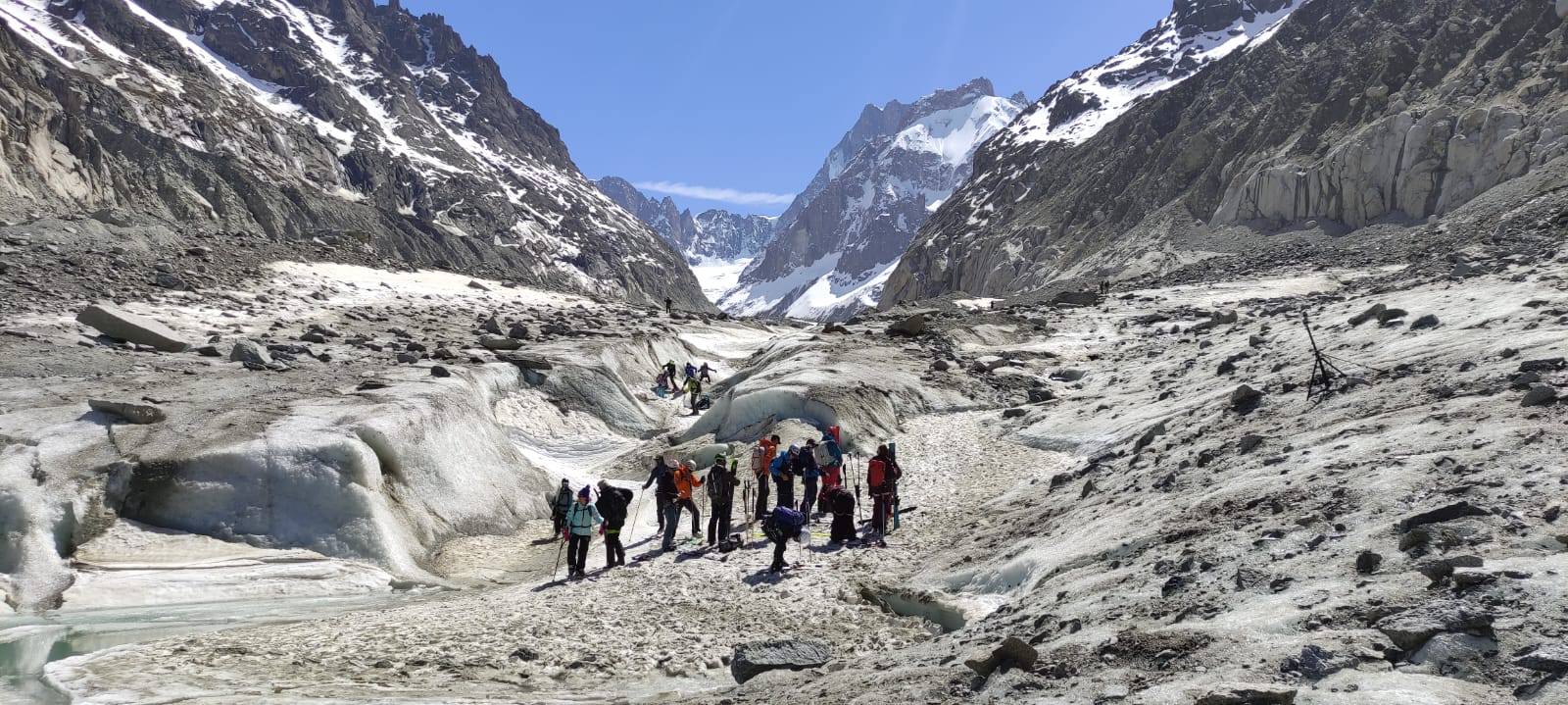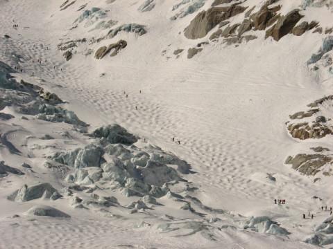 Si prende terra sulla morena poco sotto la stazione del trenino che da Chamonix sale a Montenvers.