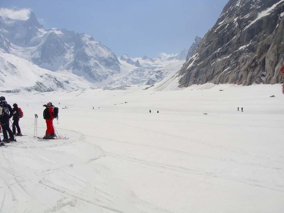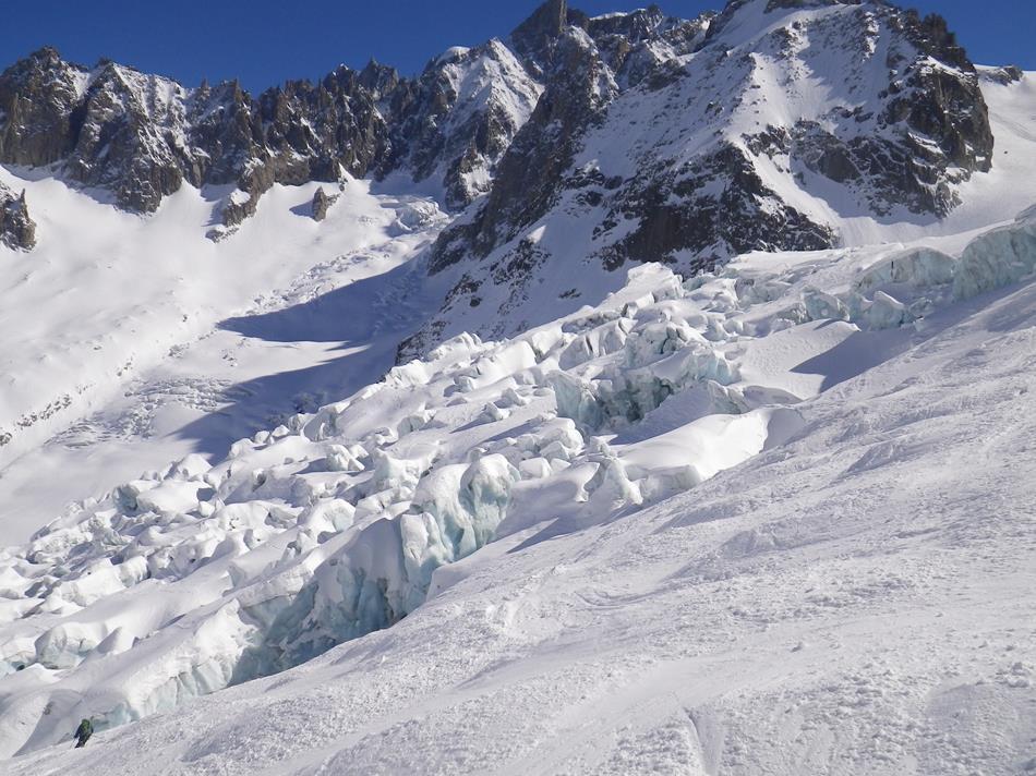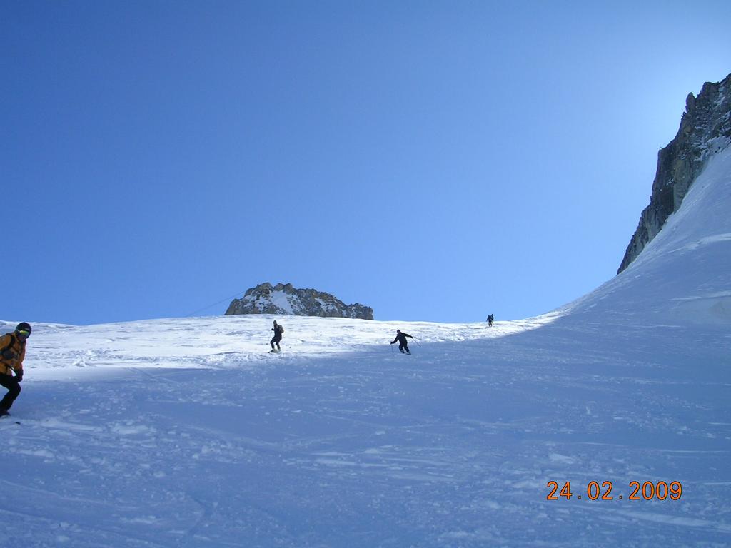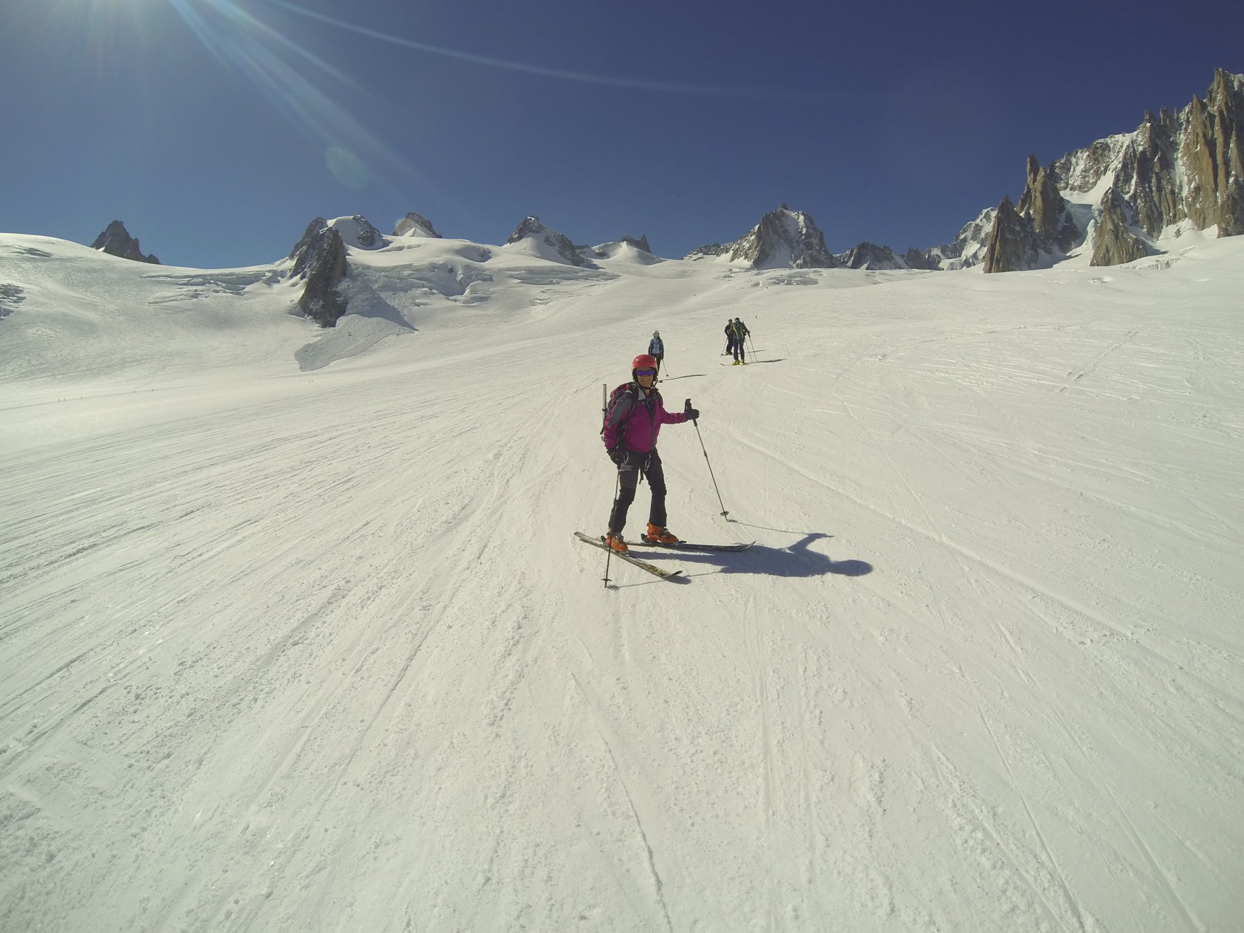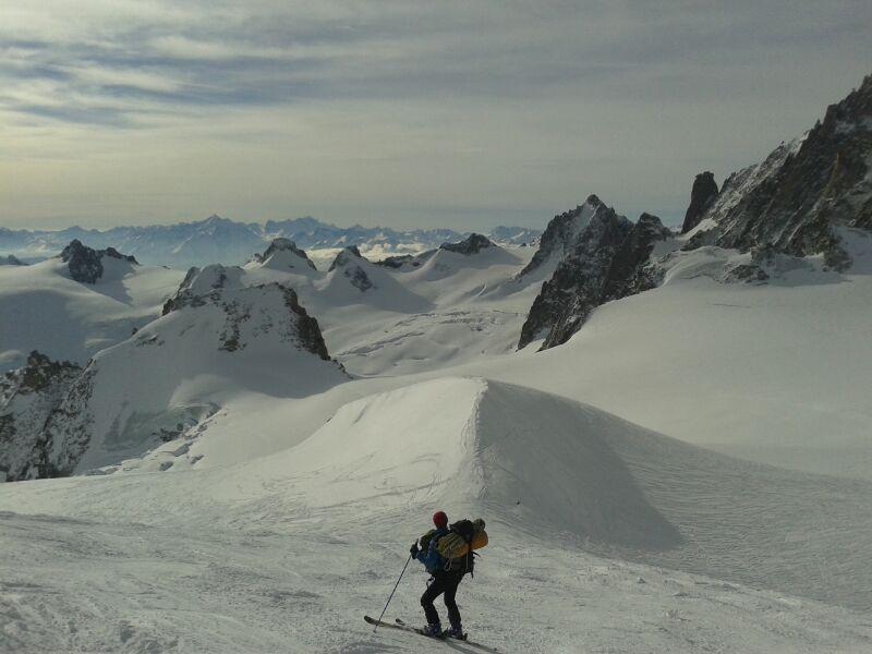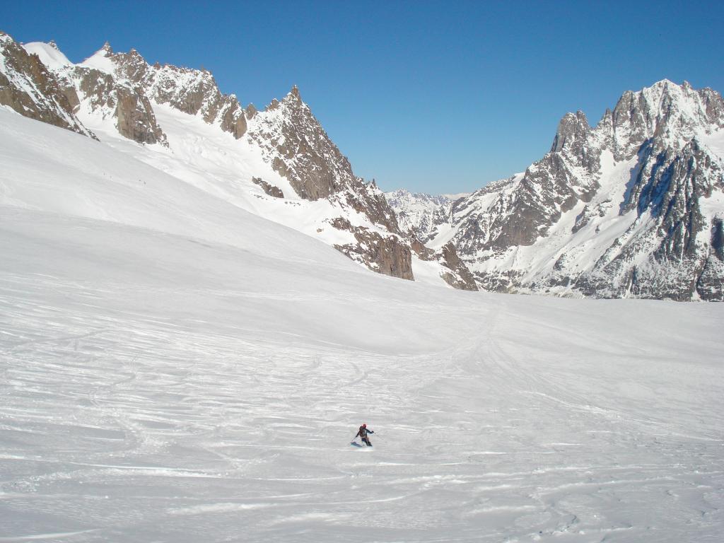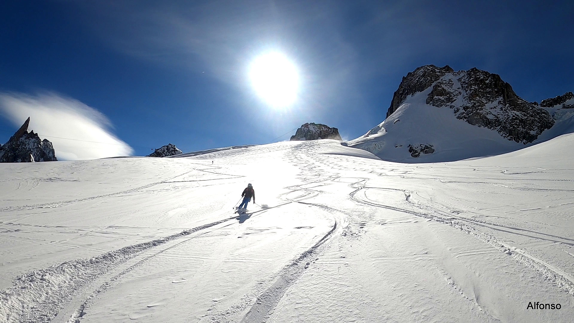 La partenza dall'Aiguille du Midi (3.800m versante Chamonix) aggiunge alla discesa una spettacolarità dell'ambiente che non ha eguali.