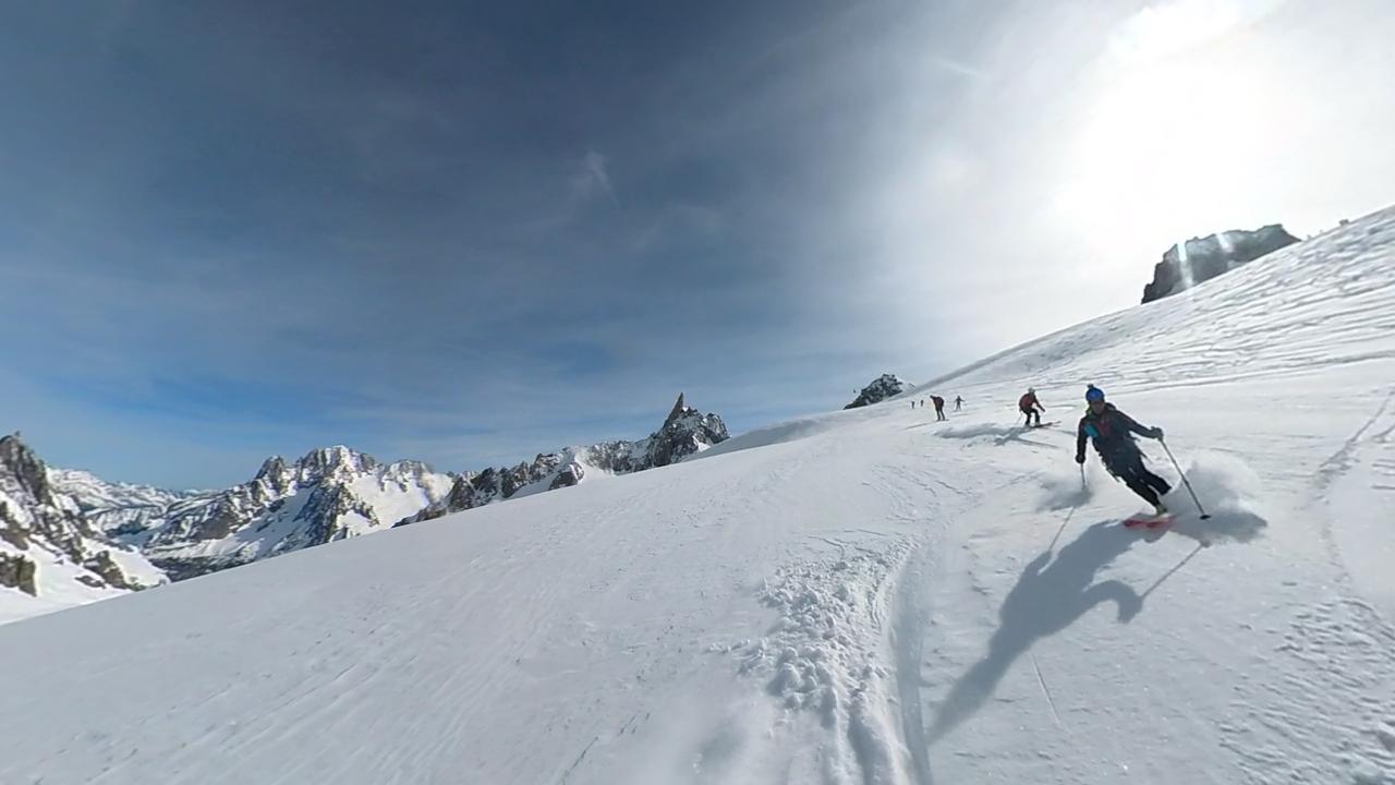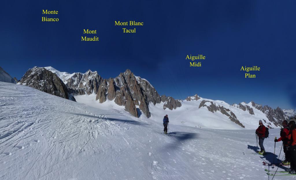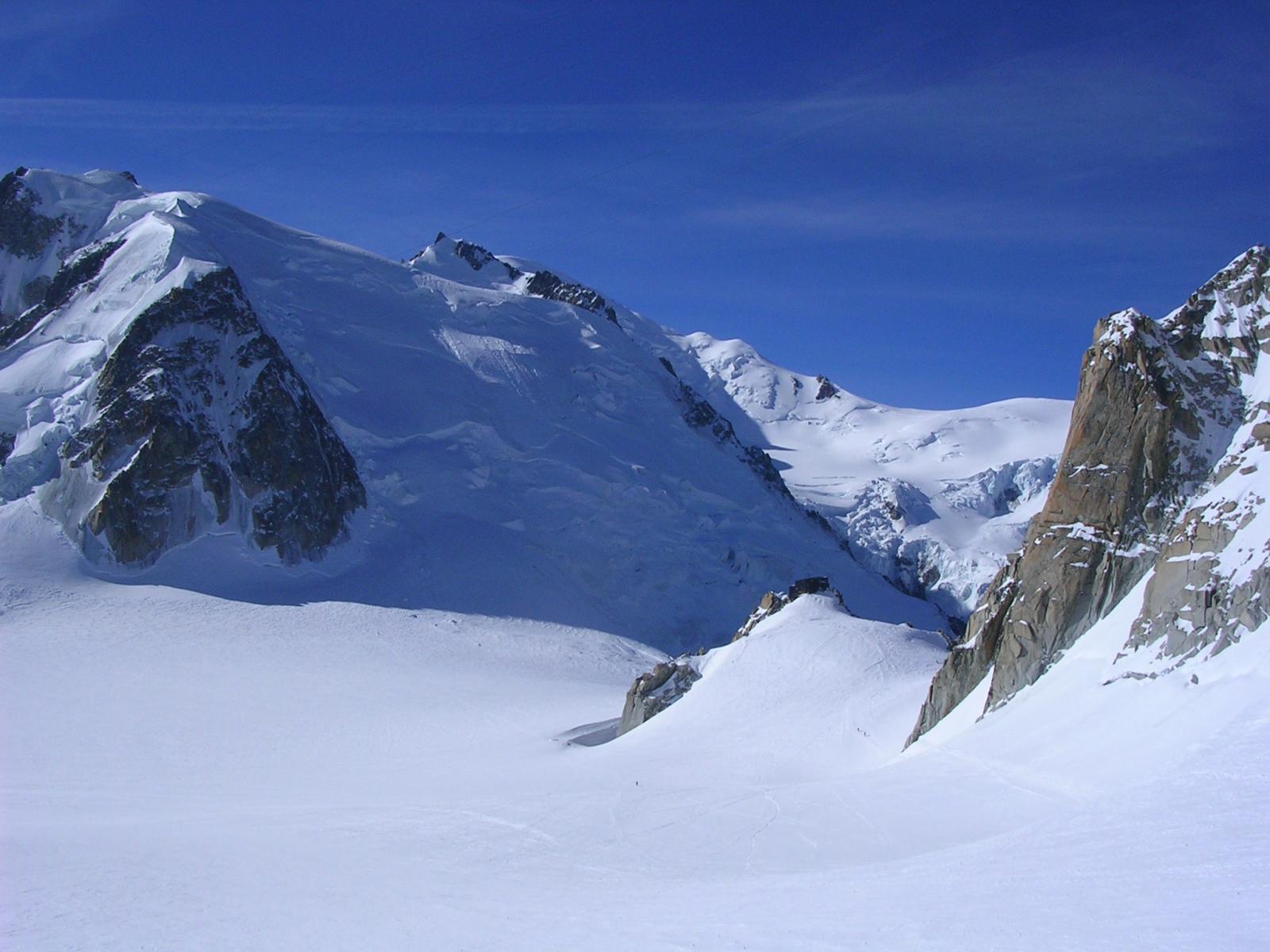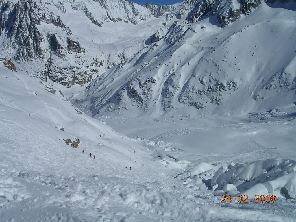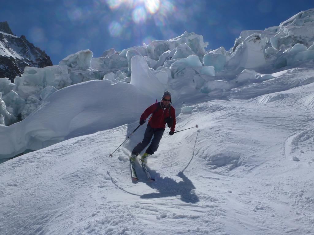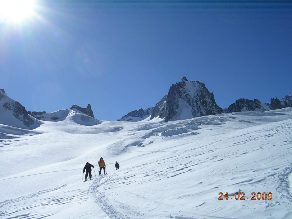 La partenza dall'Aiguille du Midi (3.800m versante Chamonix) aggiunge alla discesa una spettacolarità dell'ambiente che non ha eguali.