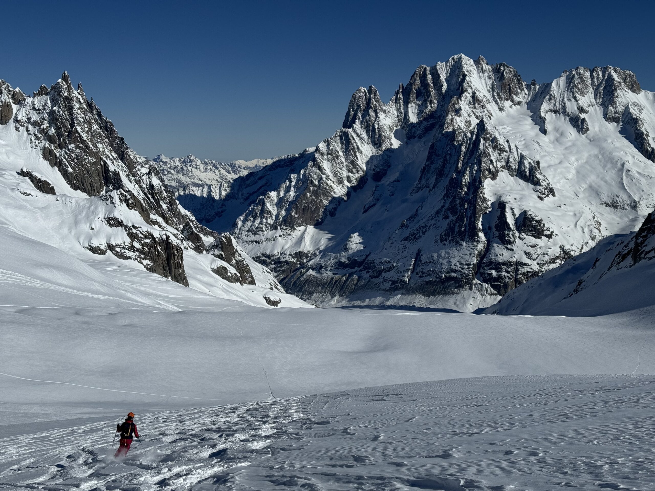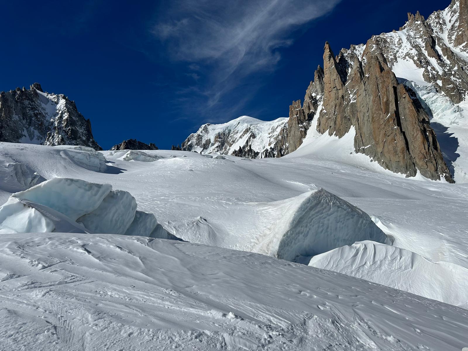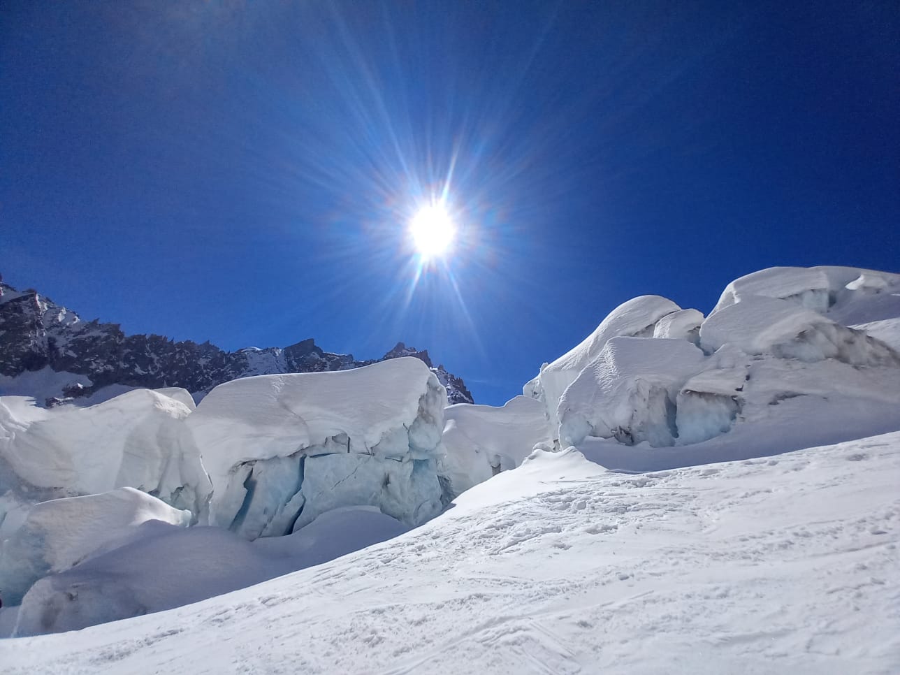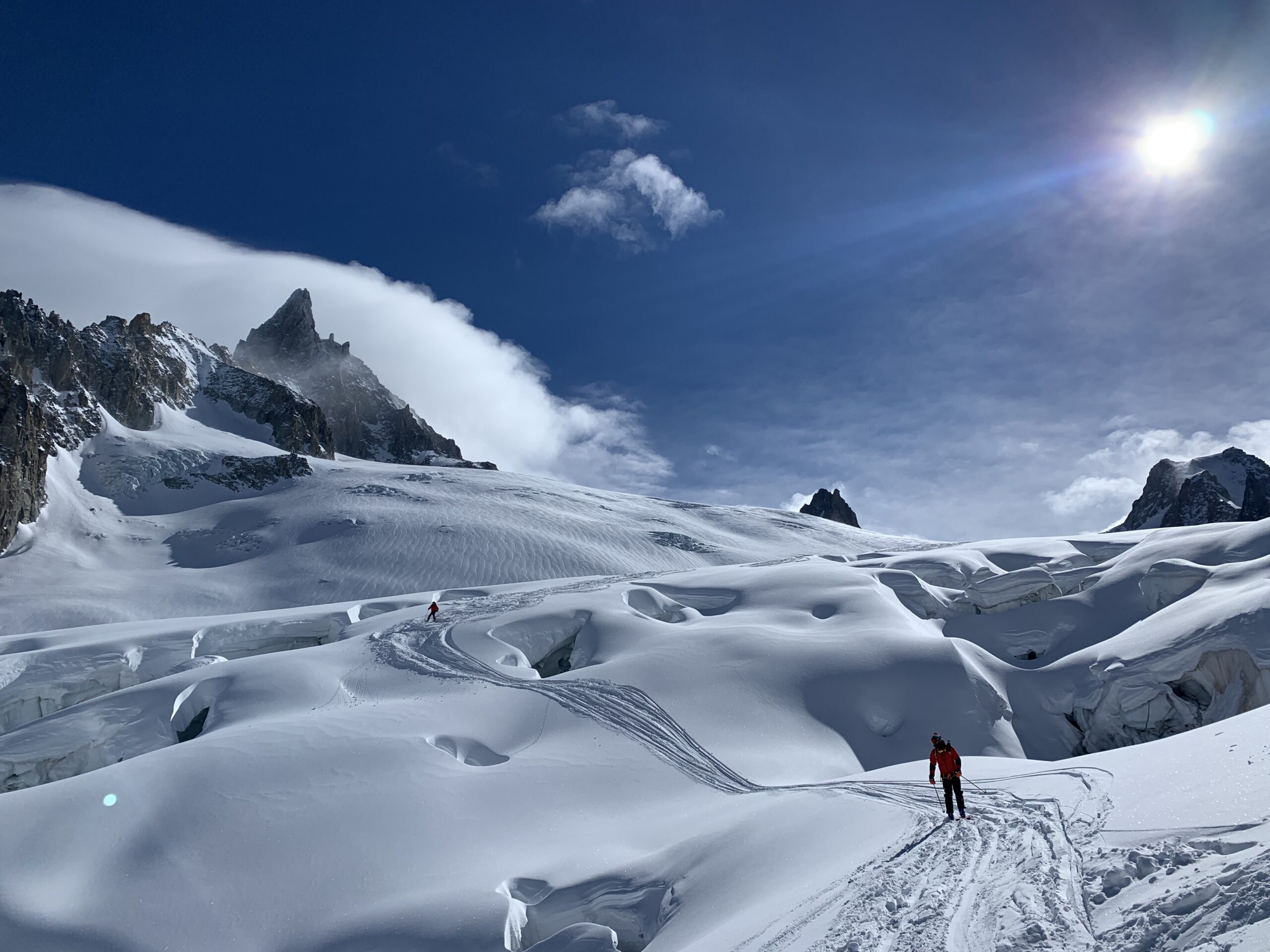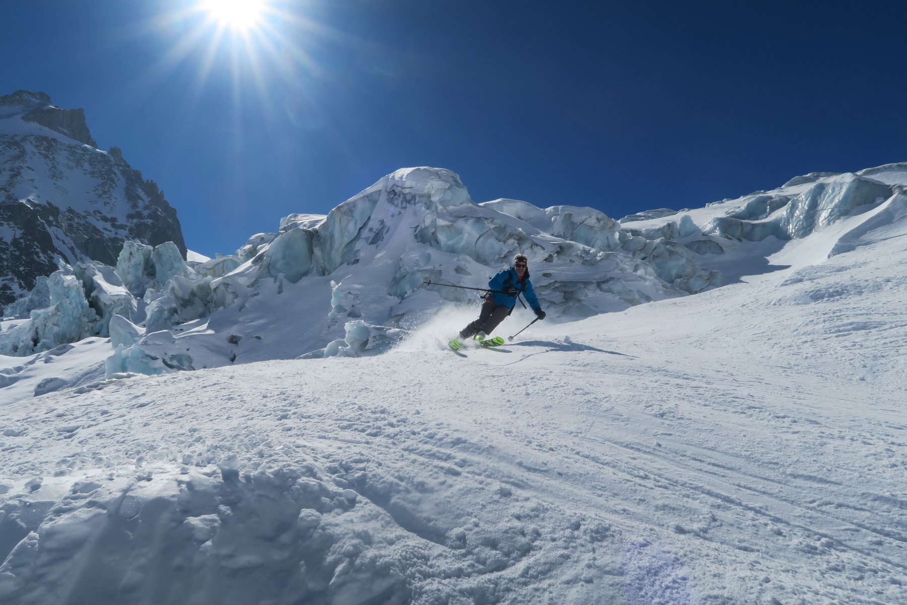 La partenza dall'Aiguille du Midi (3.800m versante Chamonix) aggiunge alla discesa una spettacolarità dell'ambiente che non ha eguali.