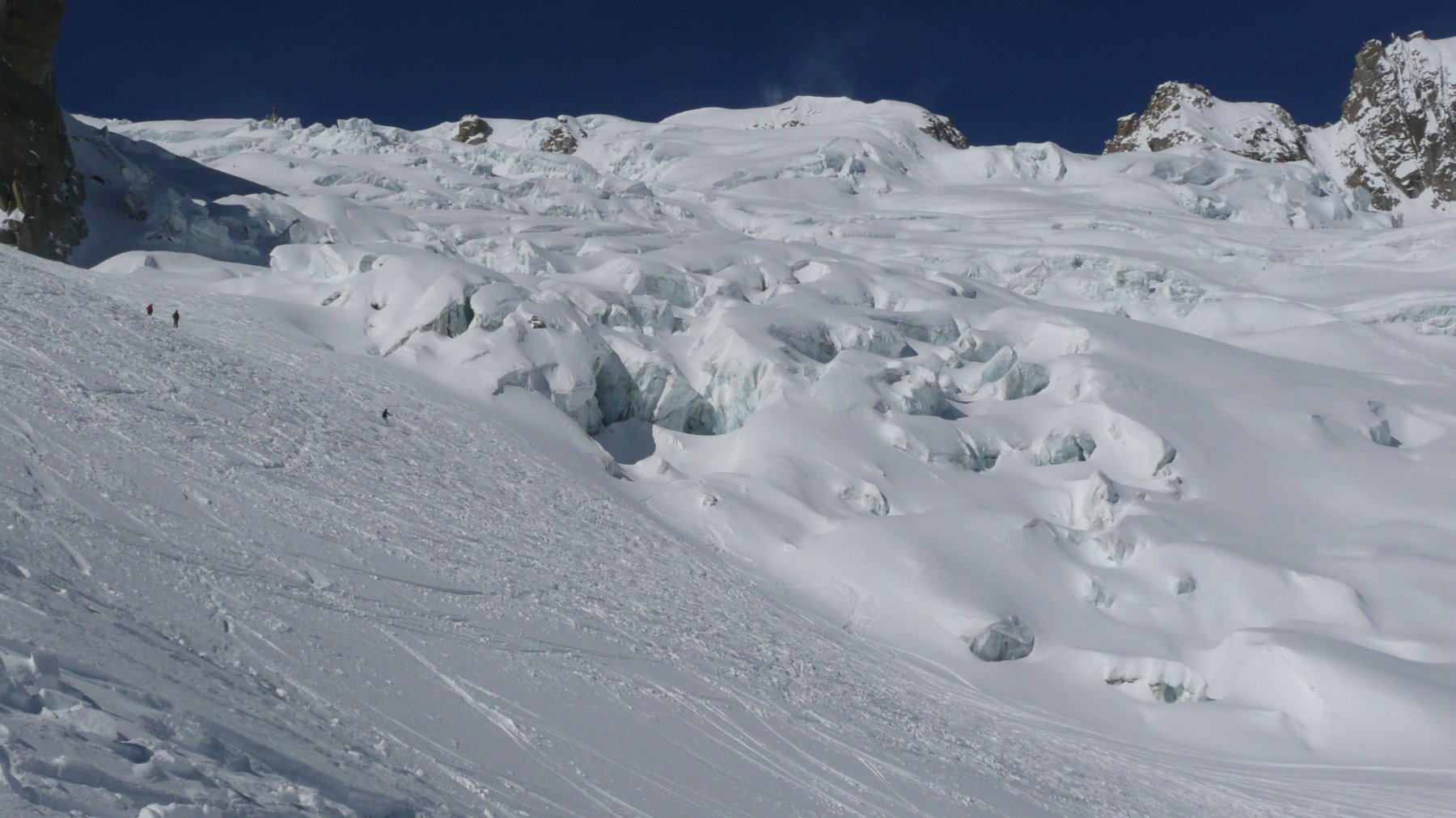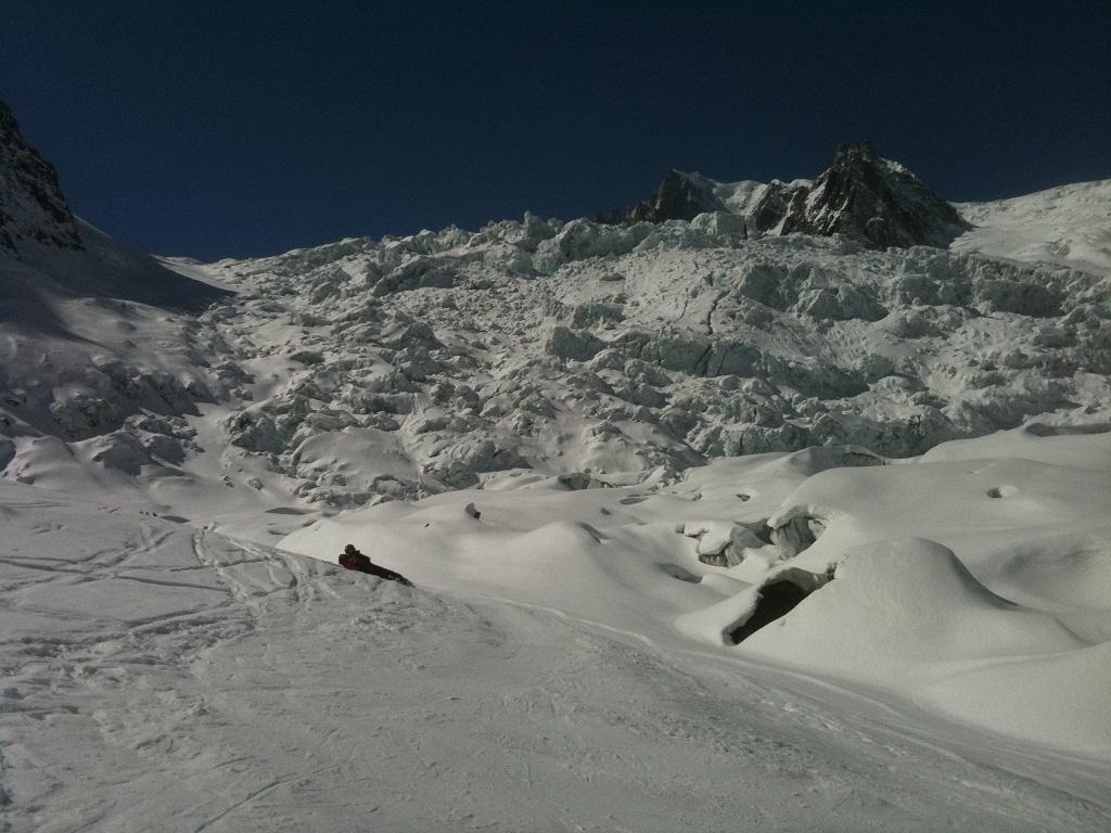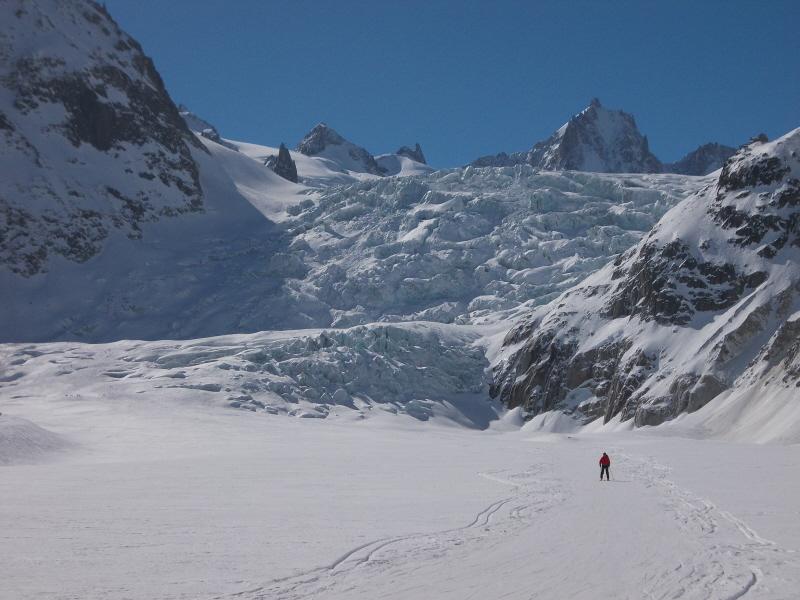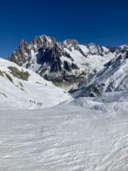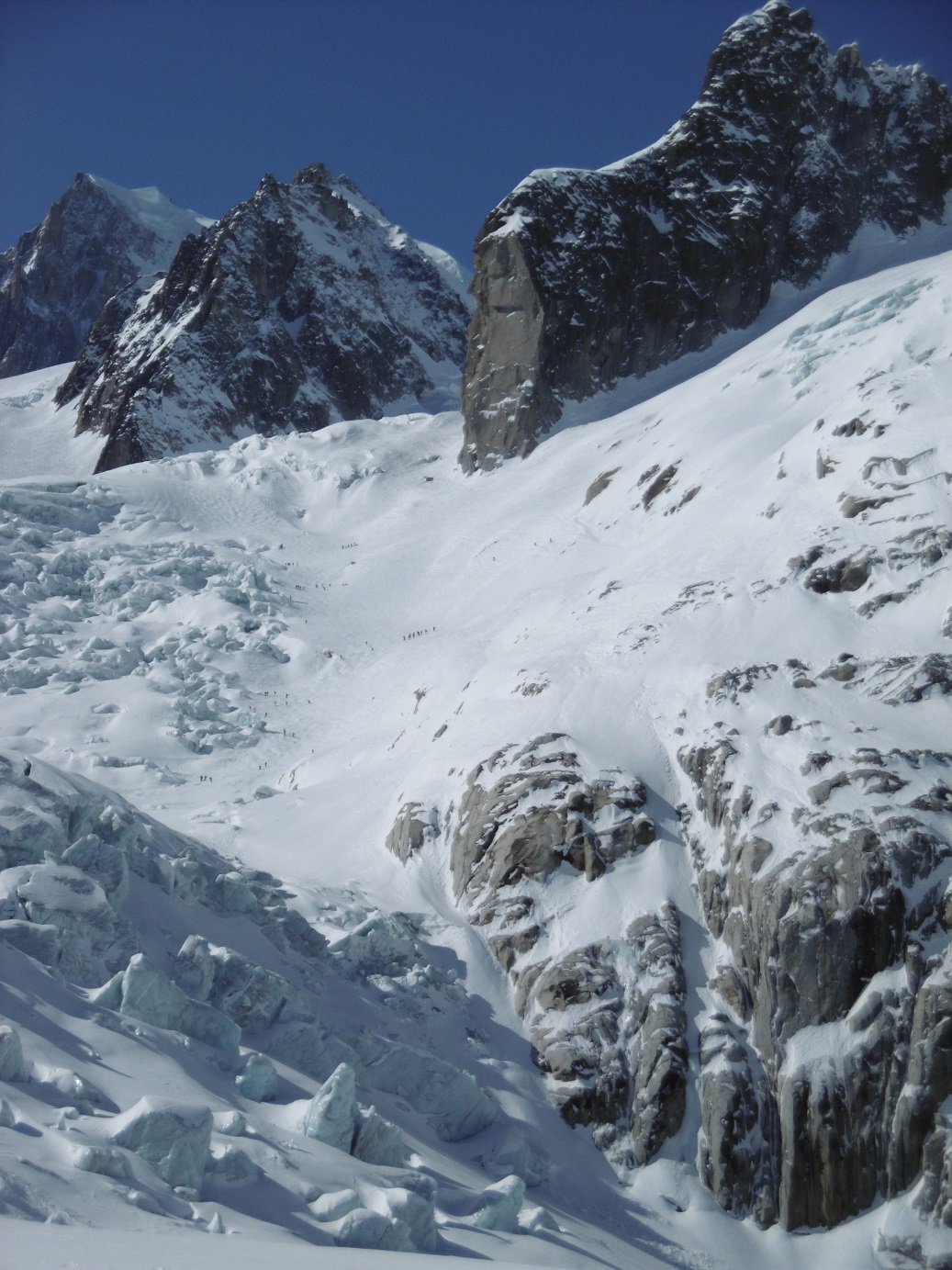 Discesa costeggiando la base del Mont Blanc du Tacul per poi seguire il lato sx del Ghiaccio del Gigante e congiungersi più in basso con l’itinerario proveniente da Punta Helbronner.