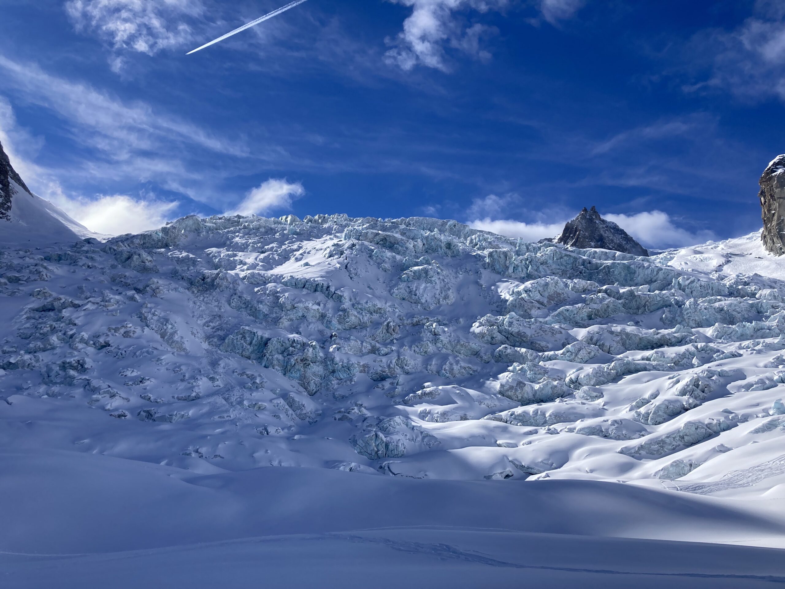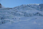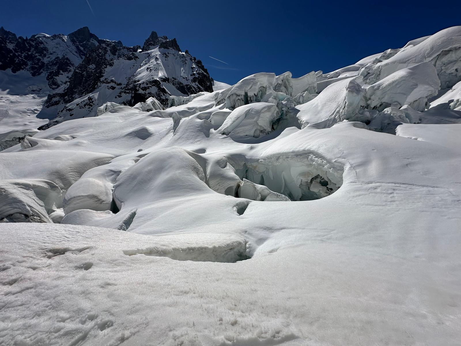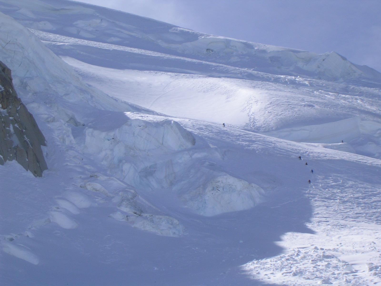 Discesa costeggiando la base del Mont Blanc du Tacul per poi seguire il lato sx del Ghiaccio del Gigante e congiungersi più in basso con l’itinerario proveniente da Punta Helbronner.