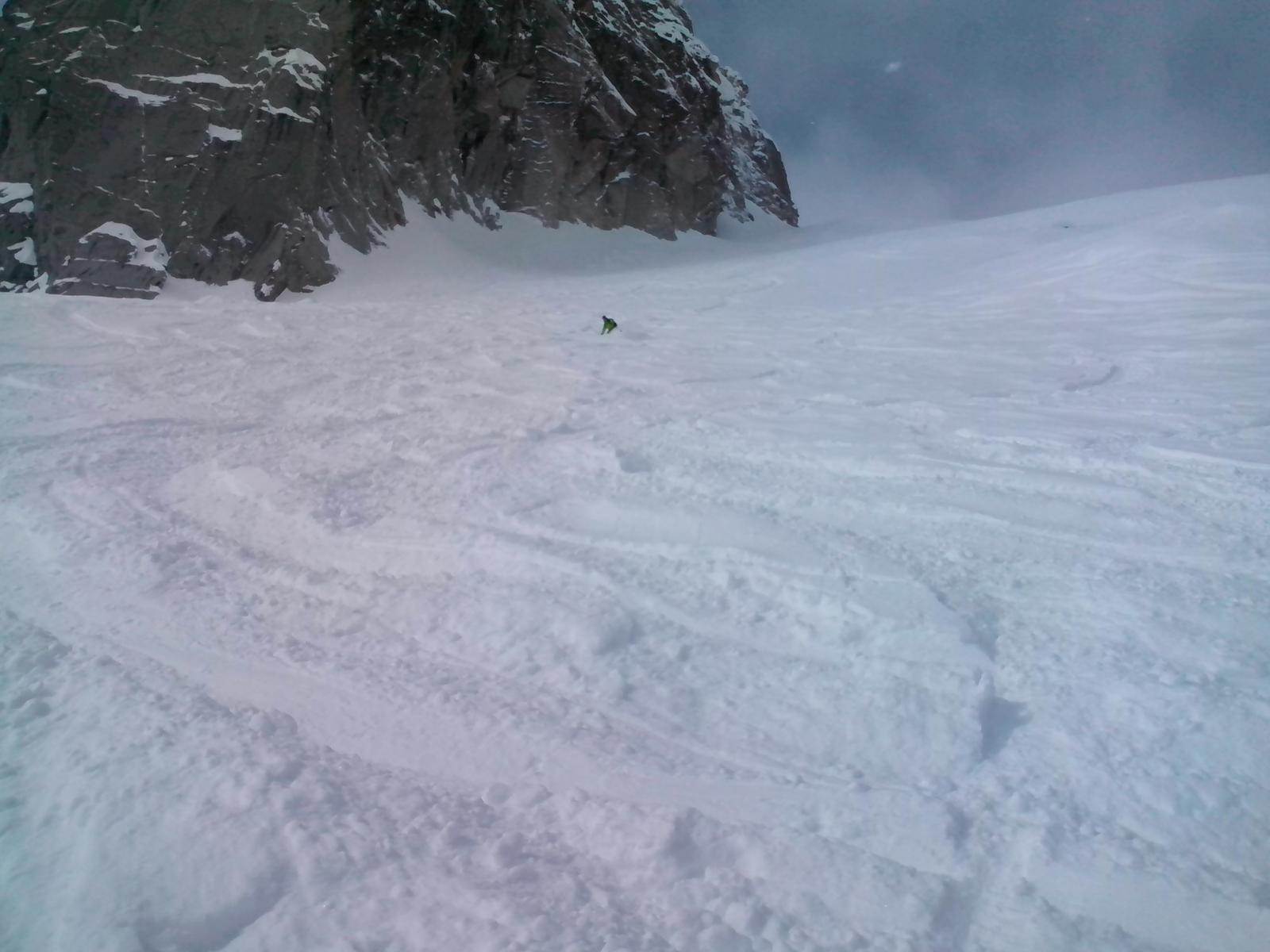 In compagnia del giovane Massi, entusiasta e scatenato! La giornata è andata peggiorando, sul piano glaciale sotto al Requin il cielo si è coperto ed è cominciata una leggera nevicata. Citando larice, “polvere sontuosa”!!!