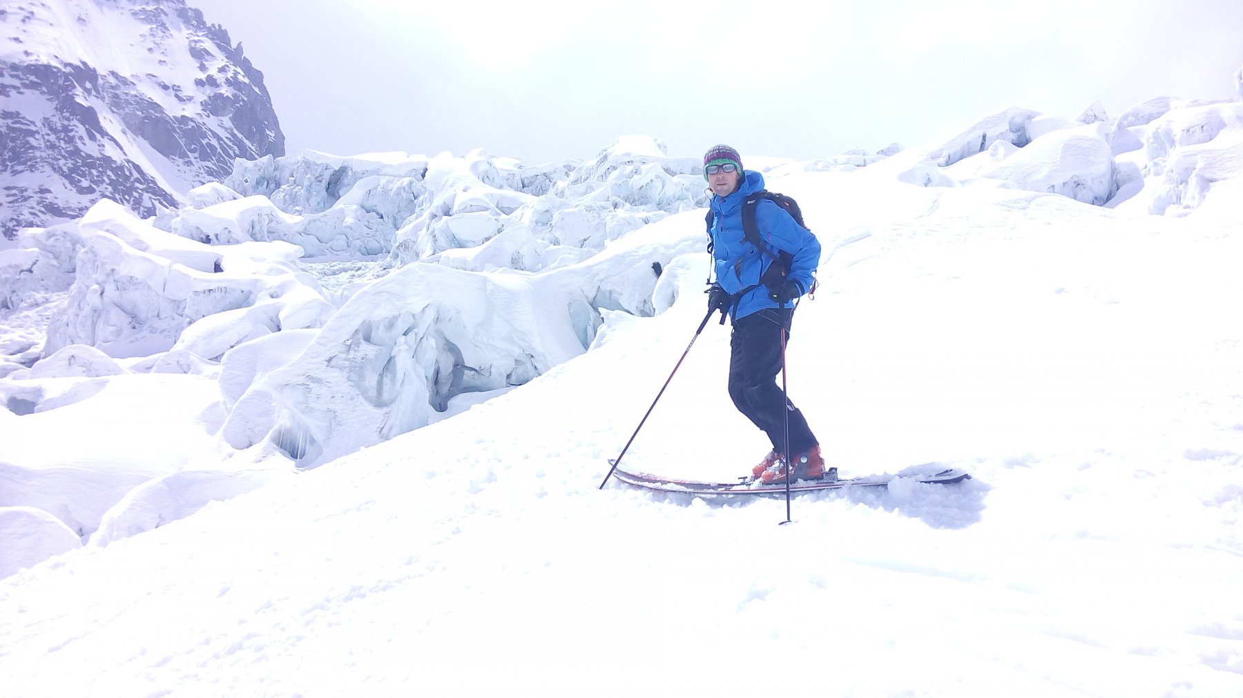 Tempo migliore del previsto, così una scappatina a zonzo per la Vallée Blanche classica è senz’altro un’ottima maniera di passare la mattinata! Vento teso di foehn, temperature fresche e fronte nuvoloso che dall’Italia cerca di passare in Francia, poca gente in giro. Da lunedì (9/05 per chi legge) cresta della Midi in versione estiva (priva dei canaponi) Telecabina che riporta a Montenvers chiusa, bisogna sciropparsi il sentiero estivo e si tolgono gli sci una decina di minuti prima della grotta di ghiaccio. Neve sostanzialmente brutta, crosta schifosa e duretta (mai abbastanza da poterci sciare sopra, comunque) cedevole e sgradevole a metà, sul grande piano glaciale, neve collosa ed umidificata, complice il favonio. Meglio stare rigorosamente in traccia. Ne vale la pena? Tutto sommato si, a patto di aver pazienza ed attendere che il tutto si assesti un po’ e magari di portarsi le pelli e gironzolare verso la Combe Maudit od il col d’Entrèves per “aumentare il piacer di scivolare”.