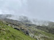 In discesa ora su chiaro tracciato procedere fino a quando la scarpata è meno ripida e passare ancora tra 2 grosse rocce di una pietraia; poi, al meglio individuare la traccia tra grossi massi e vegetazione mirando al Gias Stretto(2273 mt) e poi ancora al Gias del Sole (2203 mt; vedi note!!).