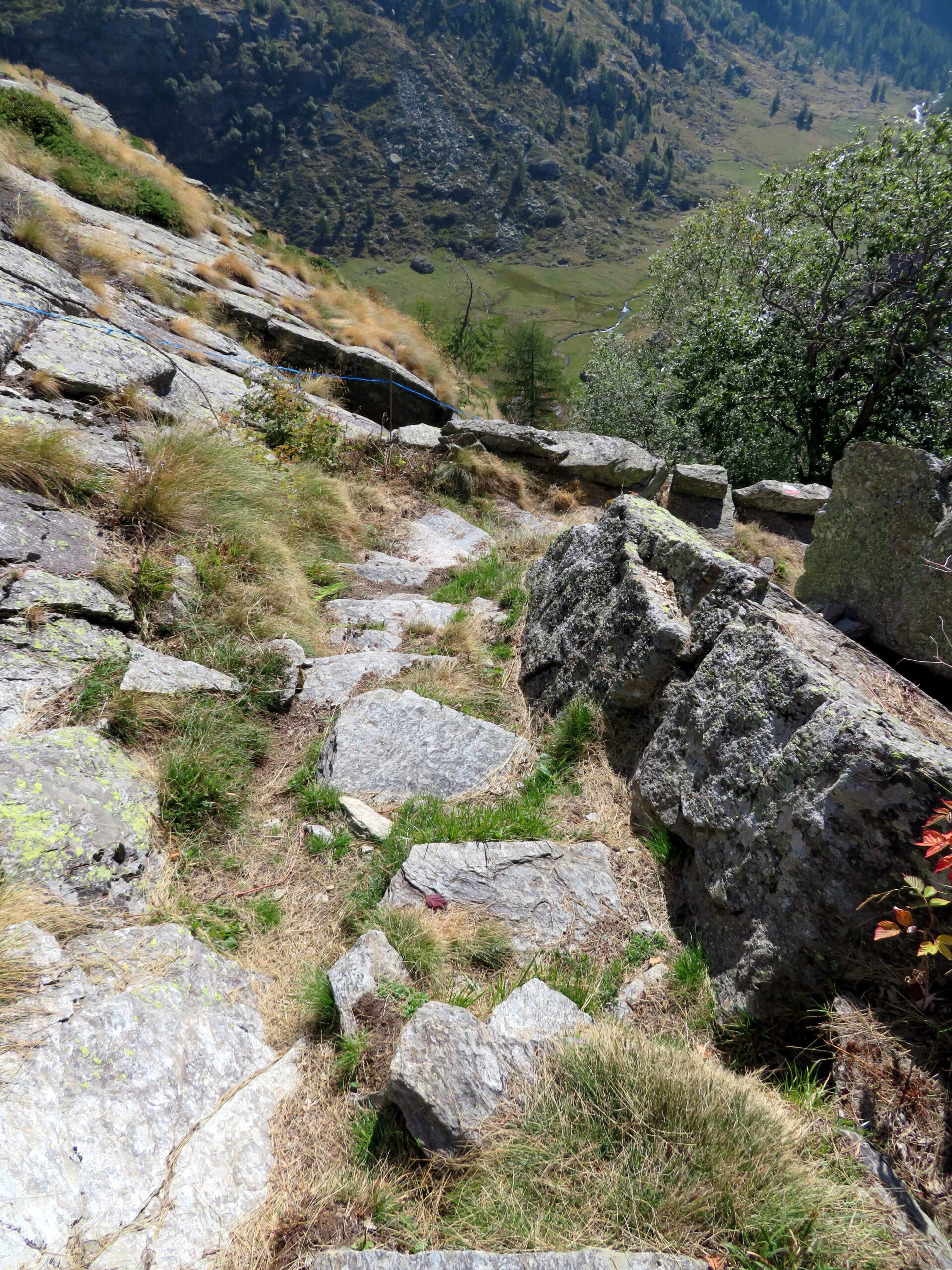 Piegando a destra su labile traccia prativa da tra piccoli massi ricercare il punto di discesa del sentiero che diventa evidente e scalinato, fiancheggiato da grandi rocce a sinistra, e con nel primo tratto, una lastra di pietra scritta datata 1874.