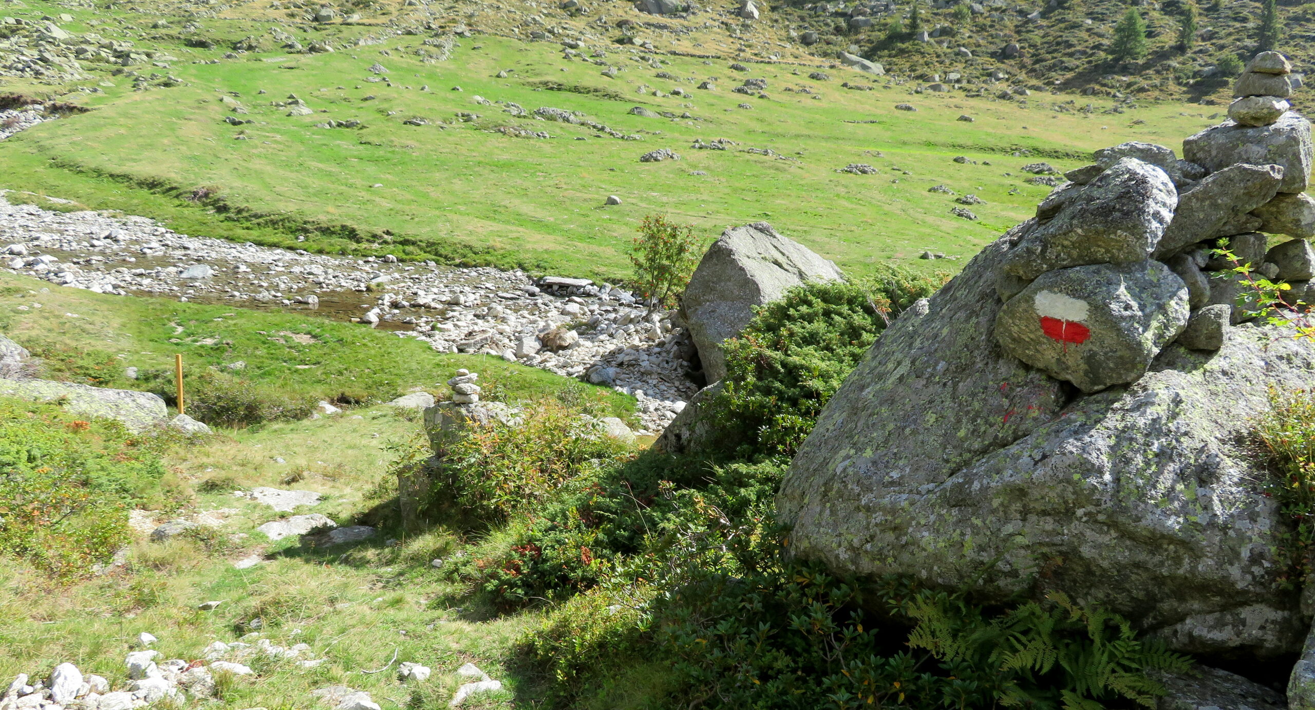 Bellissimo anello nei Valloni Vercellina/ Unghiasse. Ho seguito il sentiero GTA 321 che porta al Gias Nuovo, e poco prima di raggiungerlo ho deviato a destra verso il Gias Massa, seguendo poi una traccia di sentiero (ben indicata da tacche b/r) che giunge fino al Colle della Valletta. Da lì ho seguito il sentiero (anche qui ben segnalato, come il precedente) fin sopra al Gias Stretto, che ho raggiunto scendendo con una deviazione su facile percorso. Quindi mi sono diretto al Gias del Sole, tenendomi al centro del valloncello e seguendo qualche ometto come riferimento. Dal Gias del Sole parte un bel sentiero, recentemente pulito e ben segnalato da tacche b/r e ometti, che conduce al Pian delle Riane. Superato il piano, il sentiero 323 scende alla Vaccheria, e da lì, per fare ritorno a Rivotti, è possibile seguire la sterrata, come da descrizione già presente, oppure in prossimità di Case Custasse deviare il percorso verso Case Ghielme, dove su sentiero 322 si arriva fin sotto la Chiesetta dei Rivotti. Tale sentiero è solo una scomoda traccia con erba alta, pur essendo segnalato da tacche b/r.