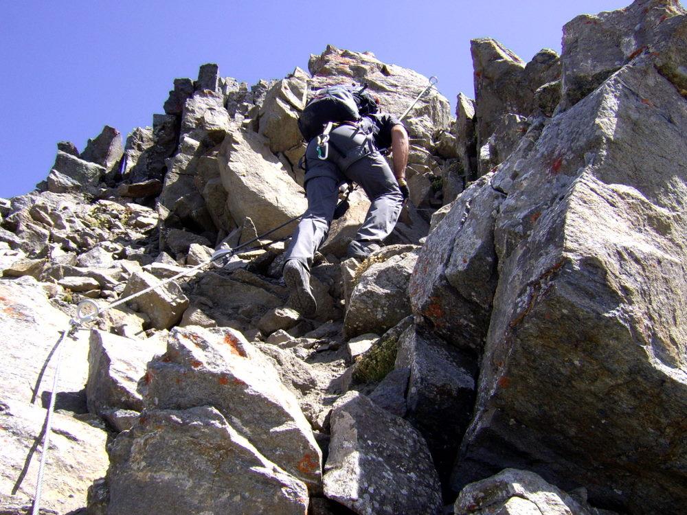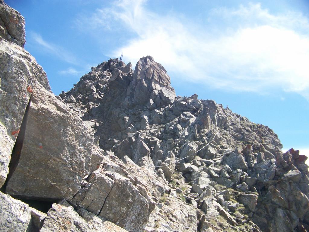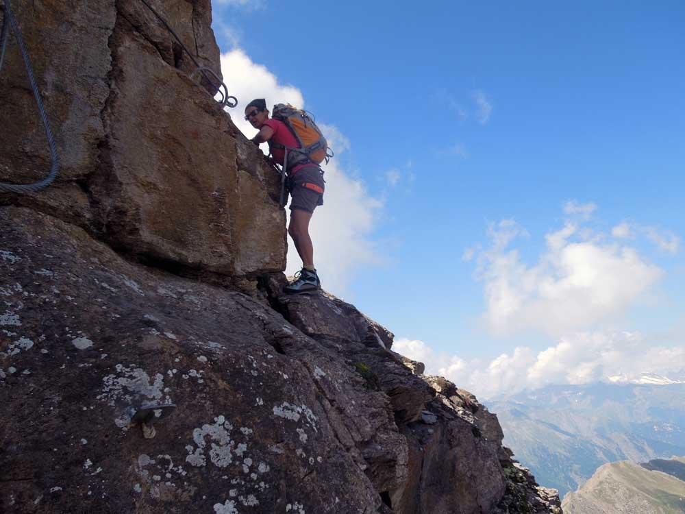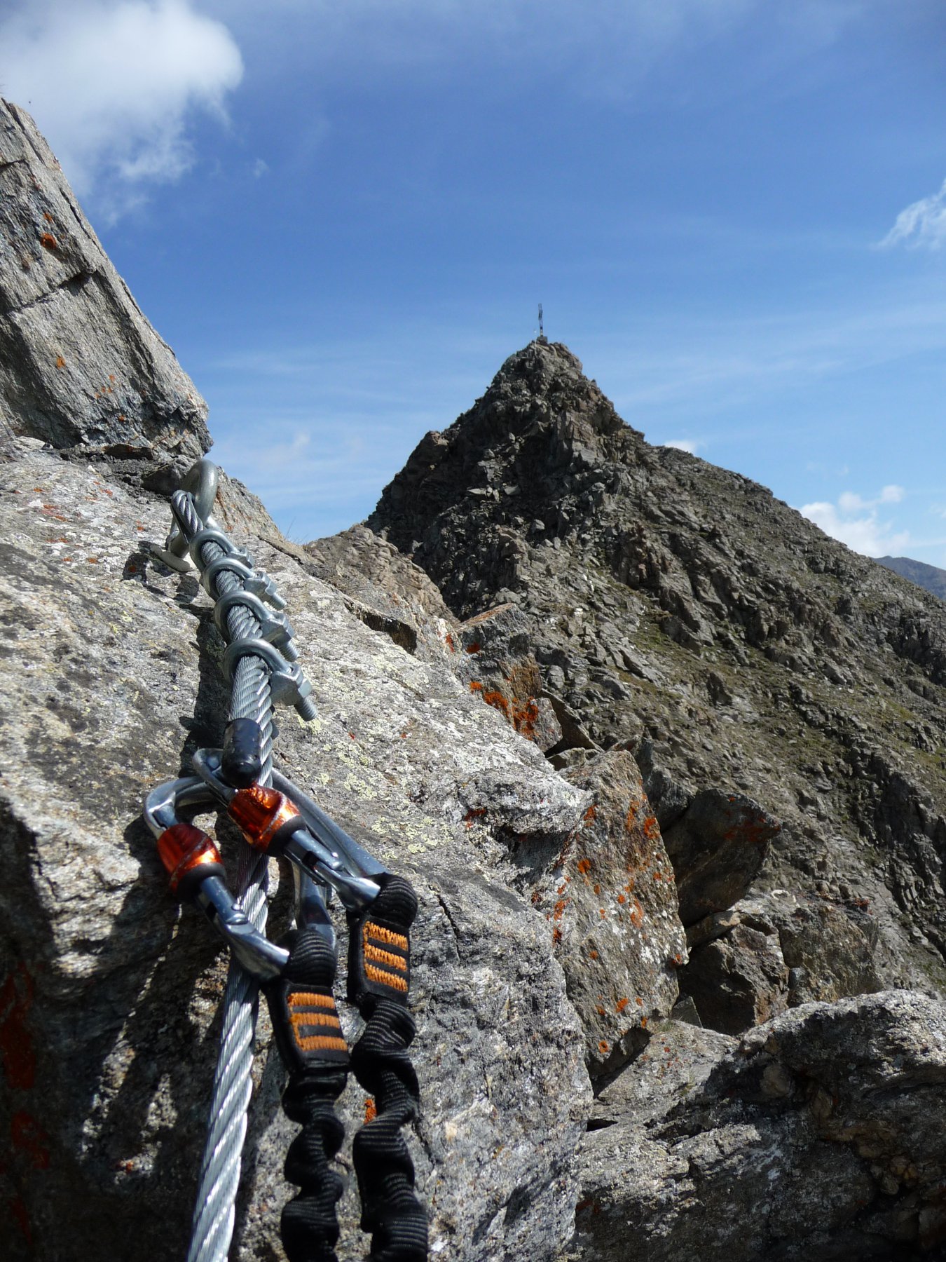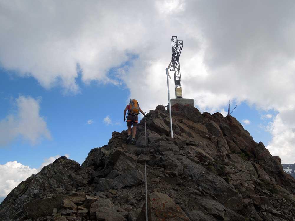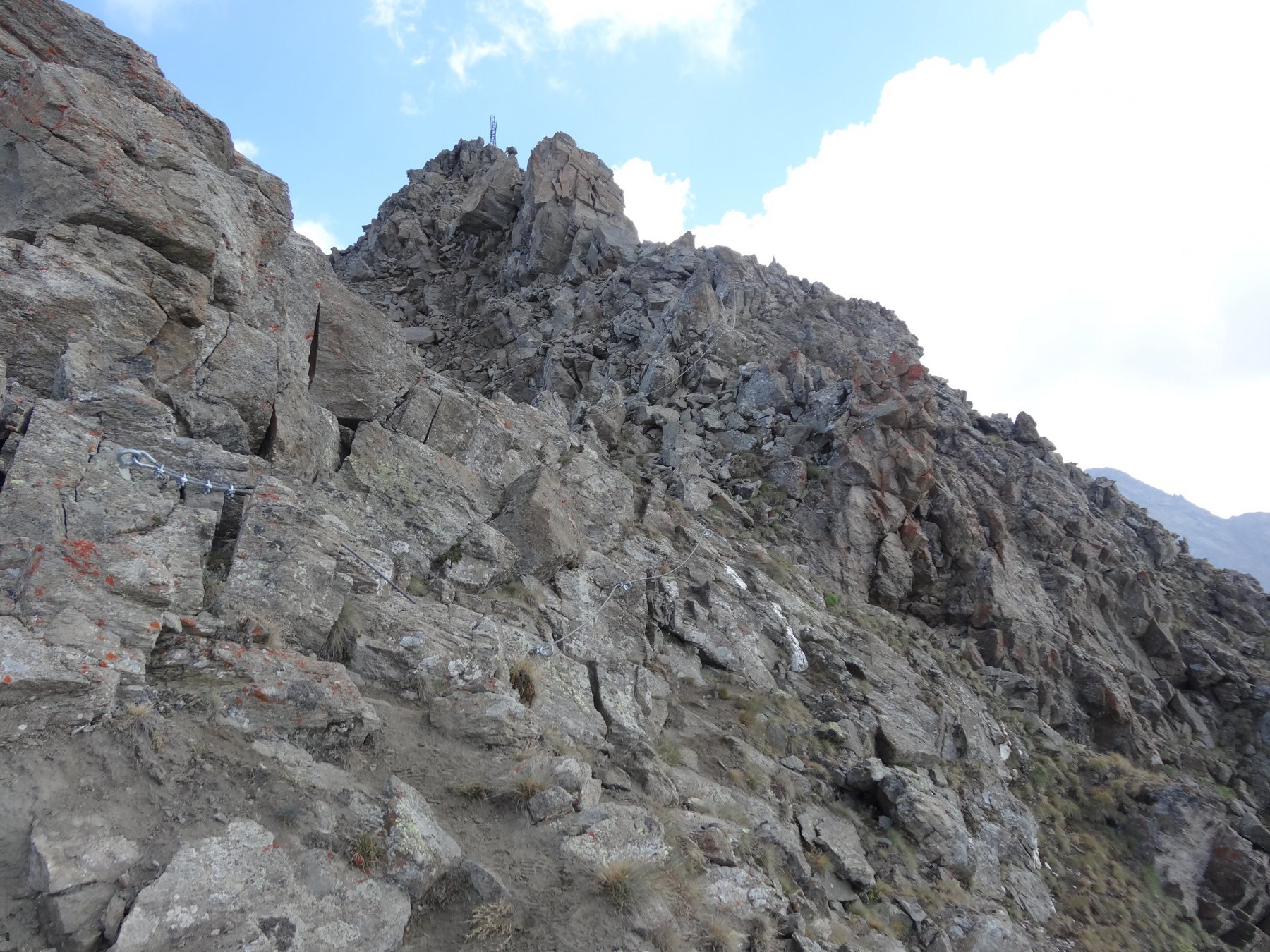 La parte conclusiva in vista della cima, risale più ripidamente la cresta rocciosa e sbuca proprio in corrispondenza della croce di vetta 3088 m, dove termina la ferrata.