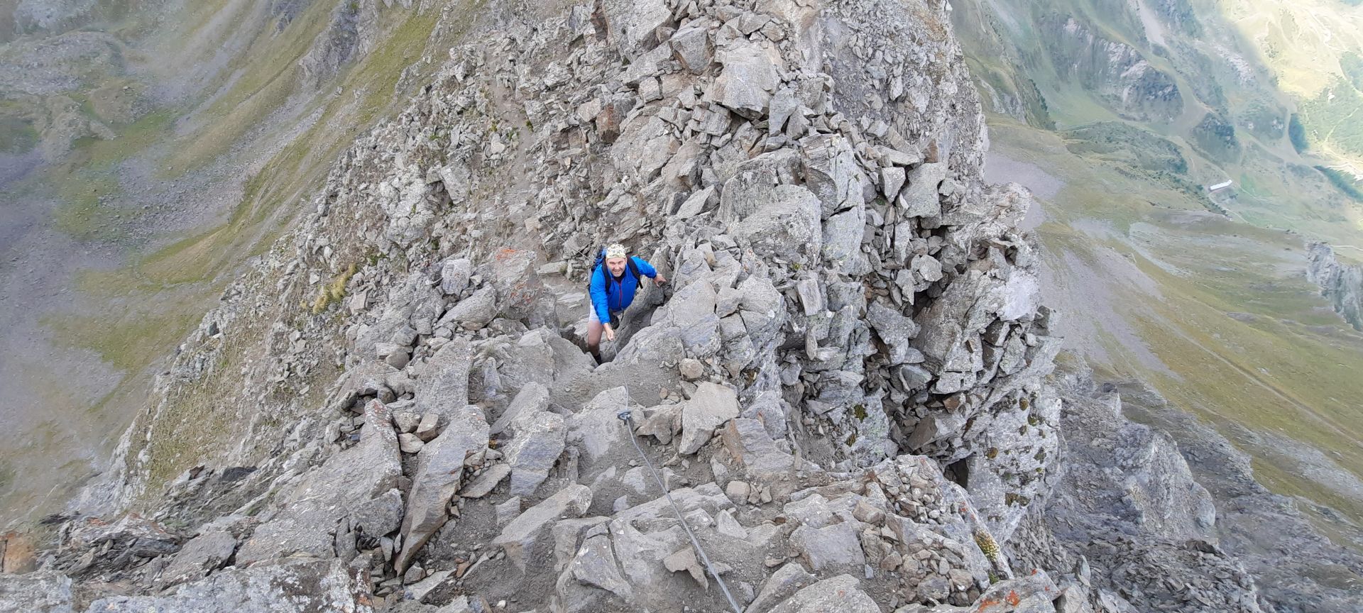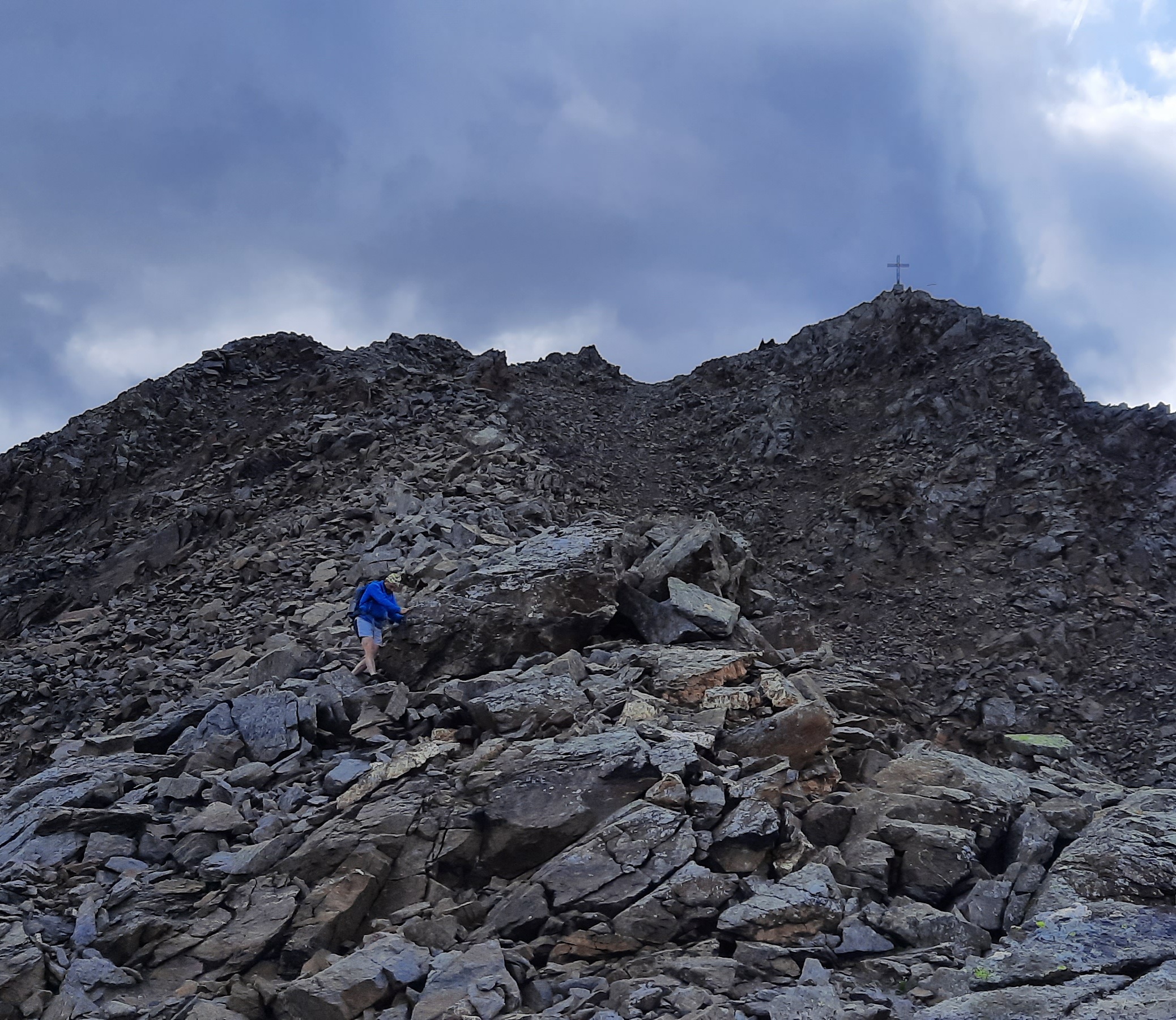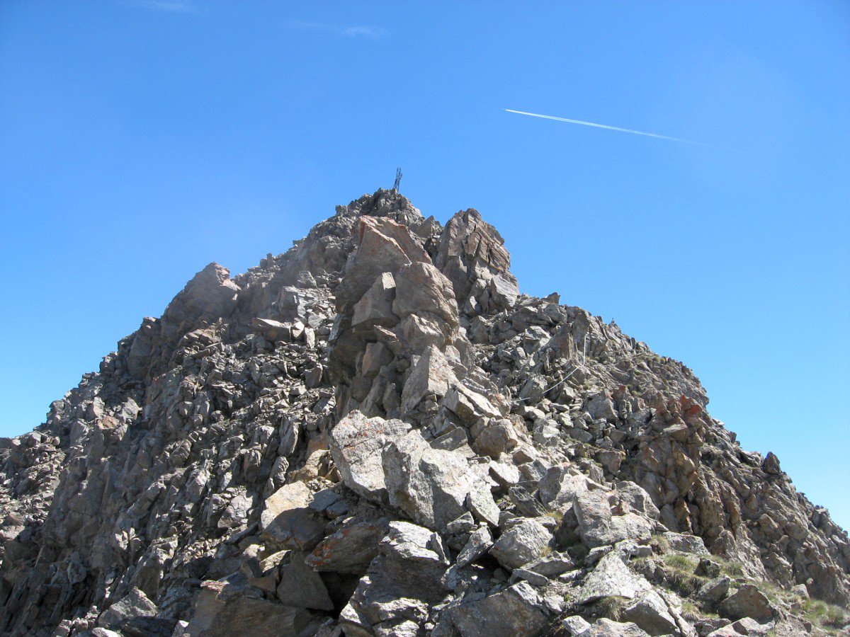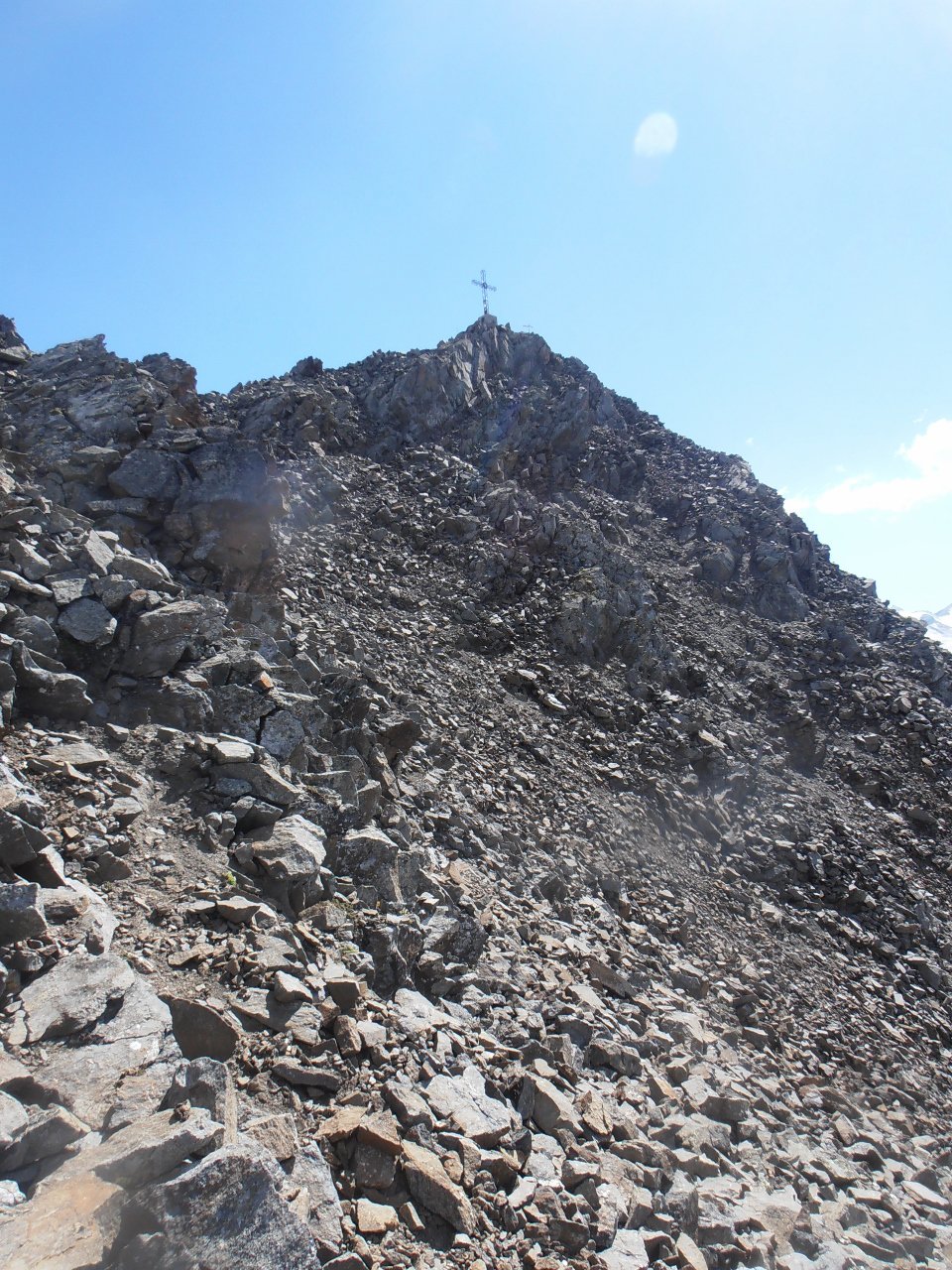 La parte conclusiva in vista della cima, risale più ripidamente la cresta rocciosa e sbuca proprio in corrispondenza della croce di vetta 3088 m, dove termina la ferrata.