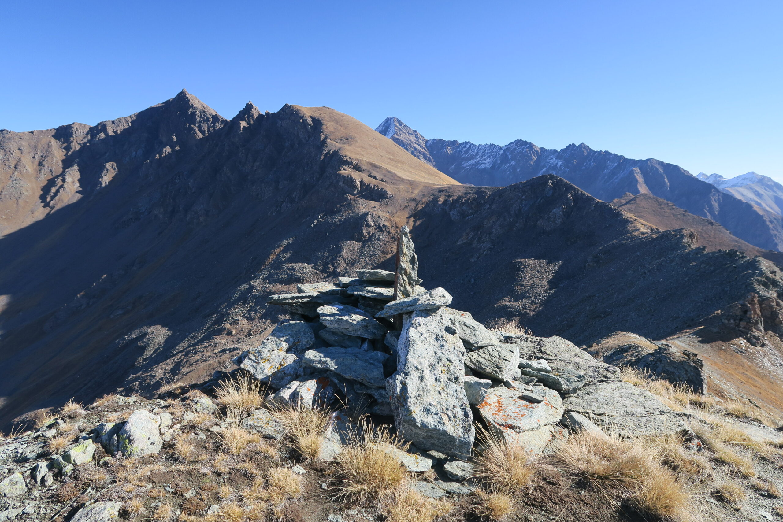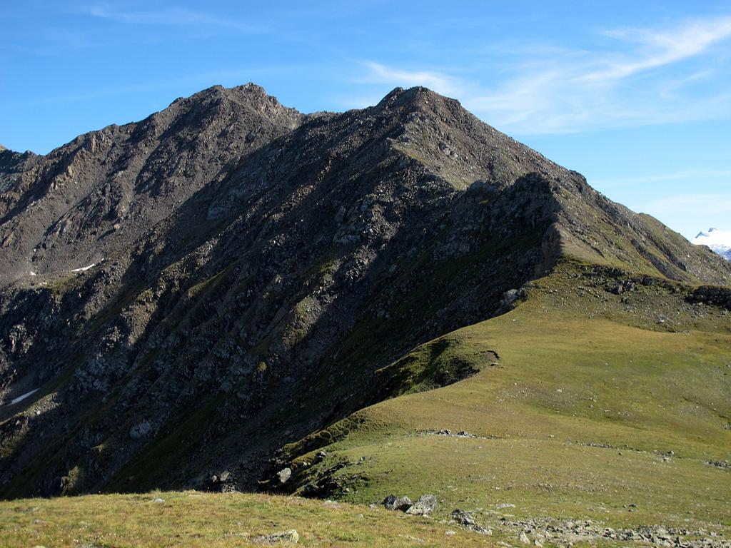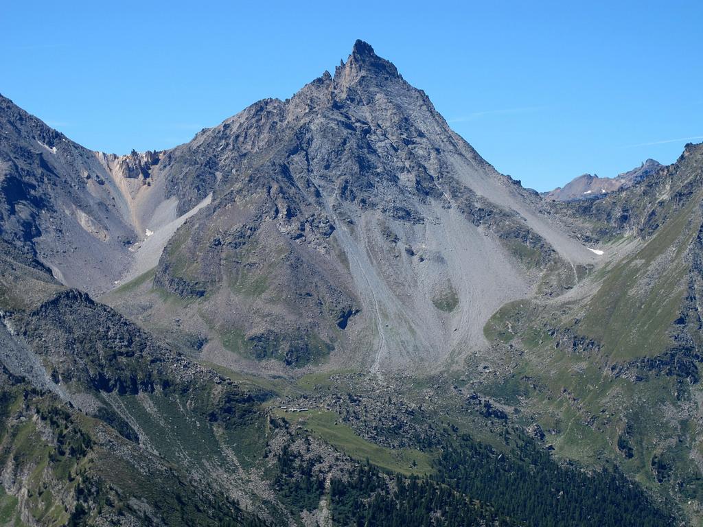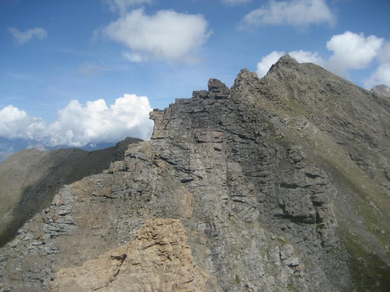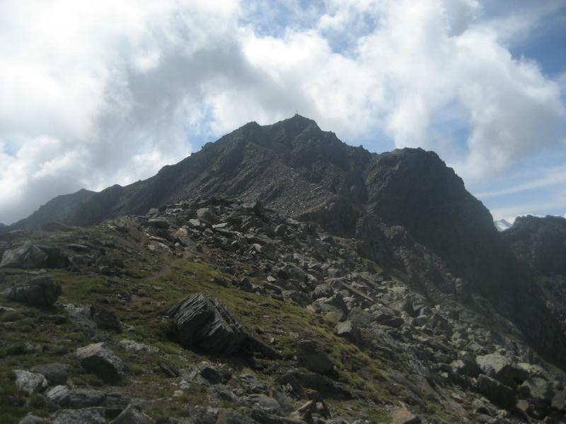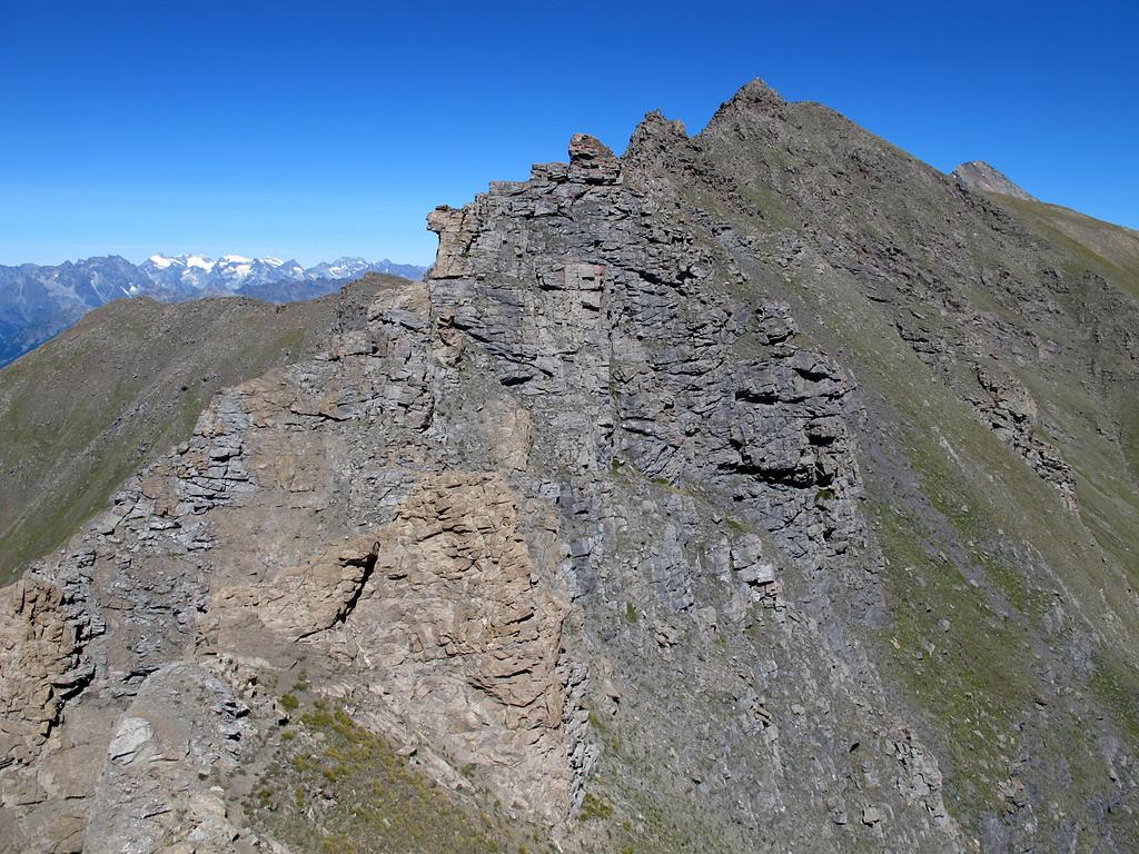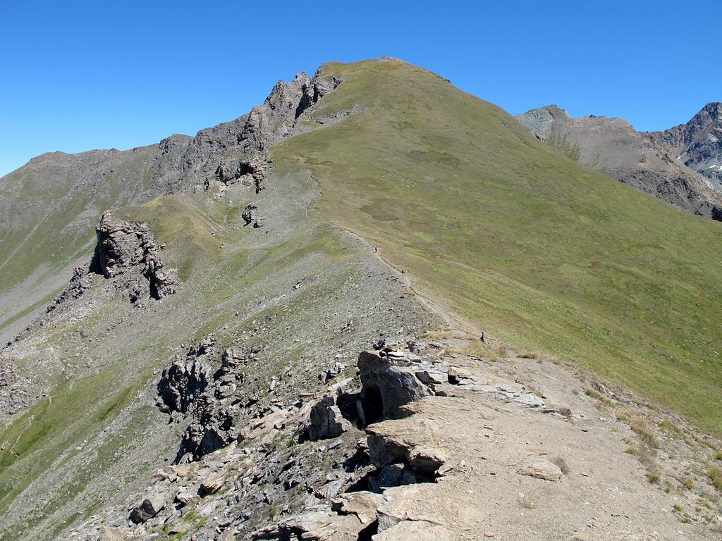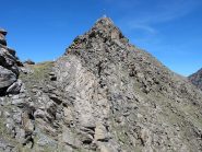 Il tratto finale è sempre nella pietraia, però sul versante Arbollè, dove un sentiero piuttosto comodo porta al colletto poso a breve distanza dalla grossa croce di vetta, che si raggiunge senza difficoltà.