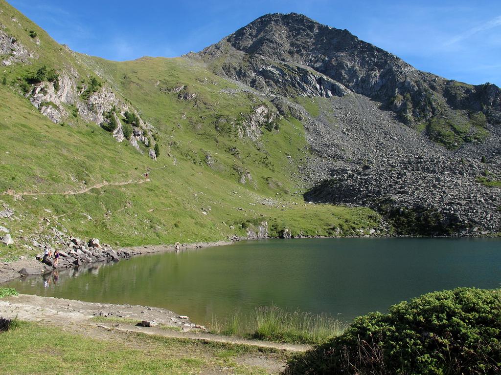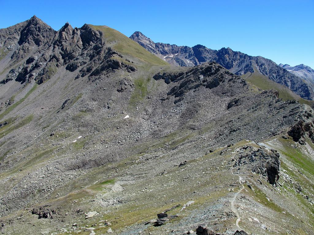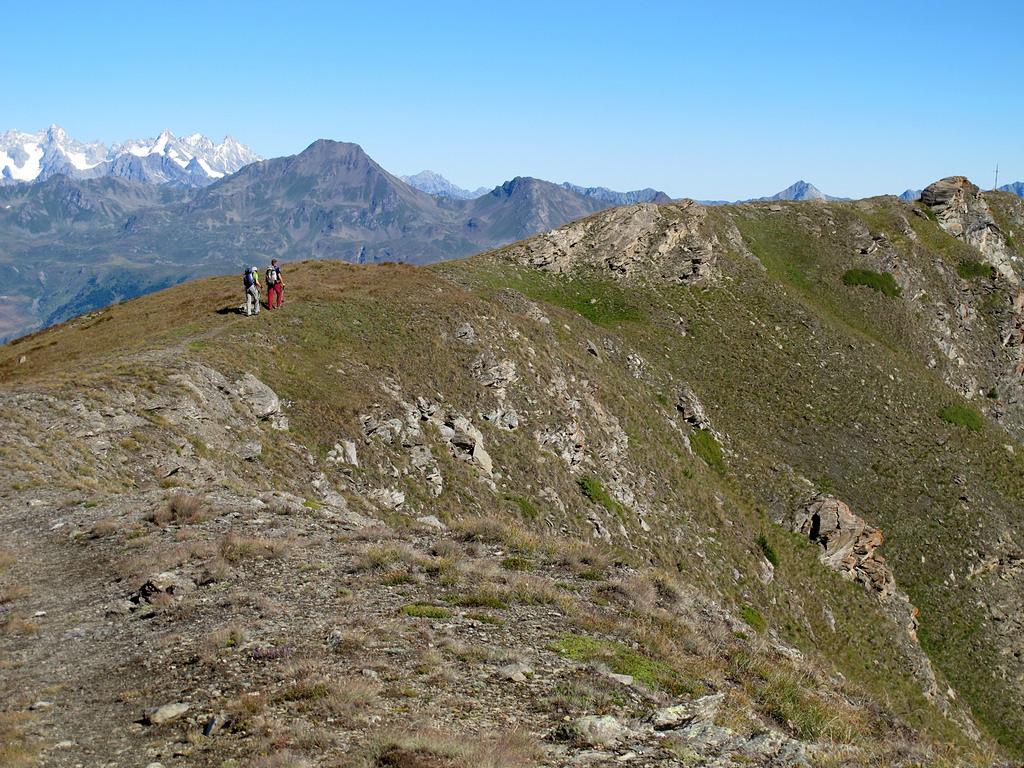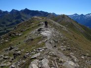 Si prosegue a sinistra prima sul crestone erboso, poi quando la cresta si restringe il sentiero si mantiene sul versante di Pila, e si superano tratti detritici alternati ad altri con grossi blocchi un po’ instabili.