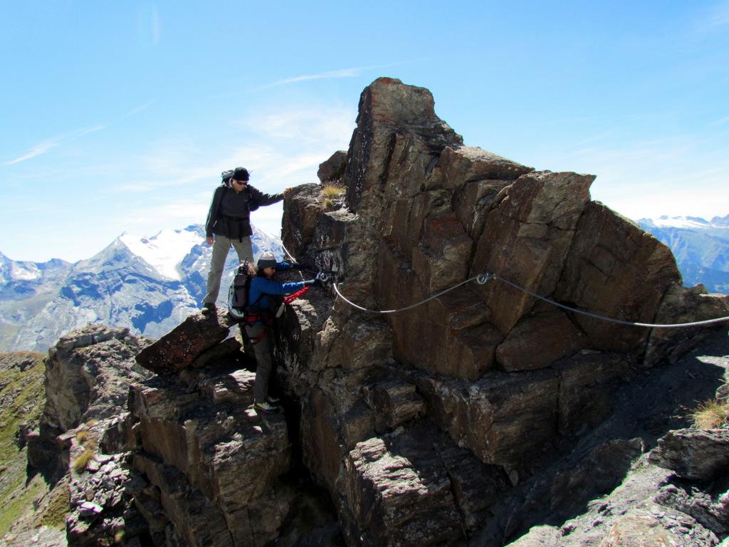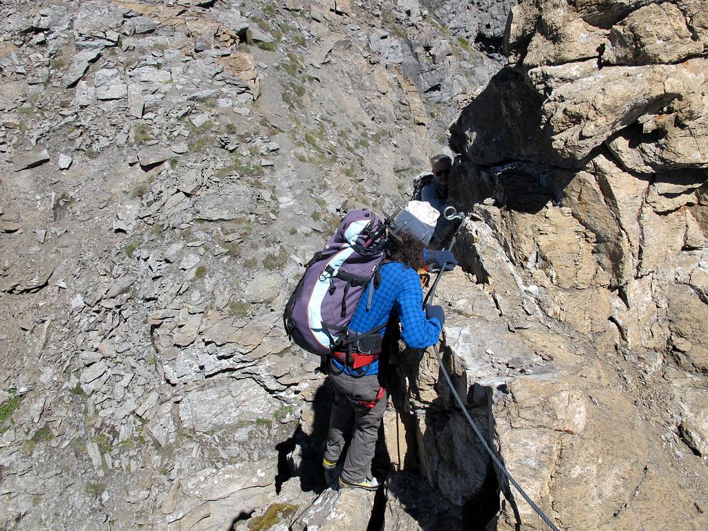Dalla vetta si scende il sentiero attrezzato che conduce al col Tsa Seche, superando qualche risalto roccioso sul filo di cresta (trattasi di sentiero attrezzato con cavo metallico e un paio di fittoni nei due punti “esposti” del tracciato, definirlo ferrata è molto più che una forzatura…).