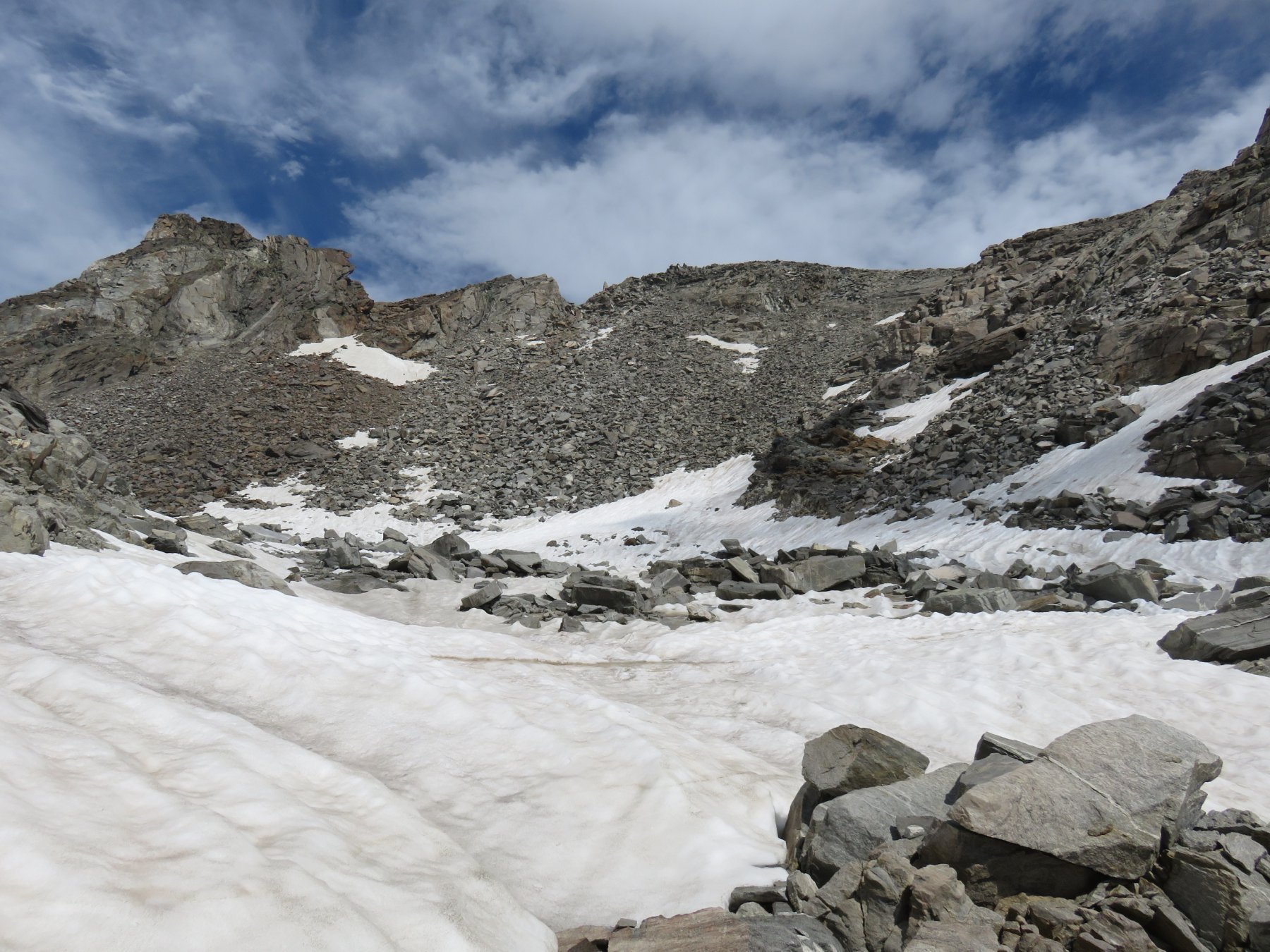 Puntare ora sulla destra ad una bassa formazione rocciosa da risalire verso una strettoia, dove si sale un breve canalino con facilissima arrampicata; ora siamo su un enorme tavolato leggermente inclinato di rocce montonate e pietre accattastate, che si risalgono in diagonale verso nord-ovest fino a giungere ad un avvallamento pietroso posto proprio sotto il pendio finale della vetta, che da questo punto appare come una piatta cresta. Salire ora in verticale la ripida pietraia, con percorso a piacimento e sul finale piegare un po’ verso destra raggiungendo la dorsale di confine regionale e con pochi passi, verso sinistra (ovest), si raggiunge la sommità, con piccolo ometto, dalla graziosa Uja della Valletta.