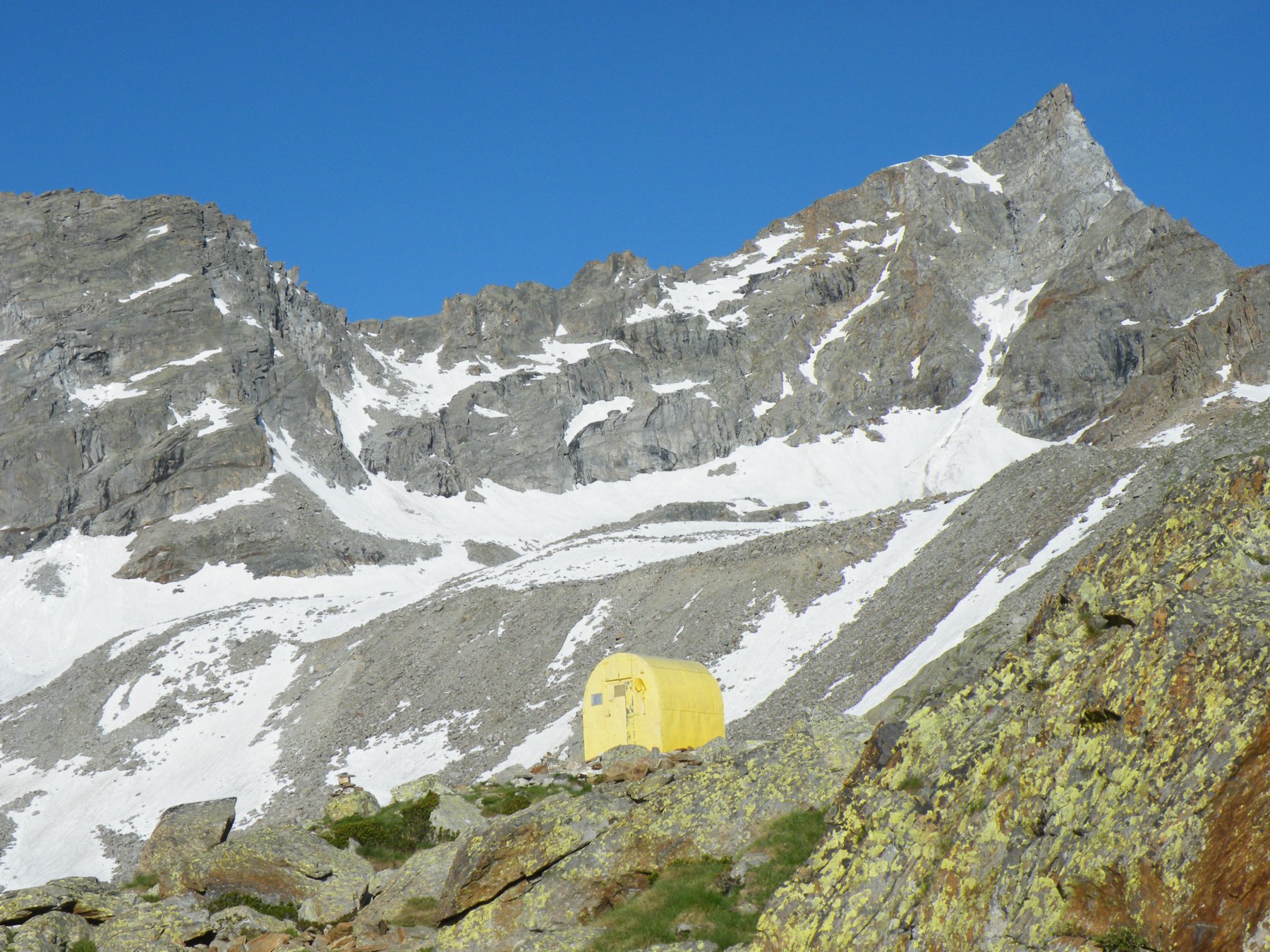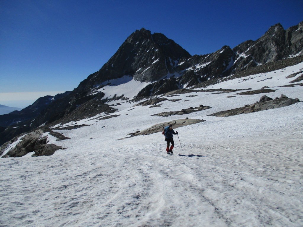 Dal bivacco seguire una labile traccia, guidati da ometti in pietra e tacche di vernice rossa, in direzione della morena, risalire quest’ultima puntando in alto al canale dove scorre il rio, salire la gola ai piedi delle placche rossastre di destra a pochi passi dal rio, fino a sfociare nel pianoro morenico ai piedi del ghiacciaio nei pressi della stazione di rilevamento dati relativi al Ghiacciaio del Ciardonei, e relativa Webcam visibile sul sito vallesoana.it.