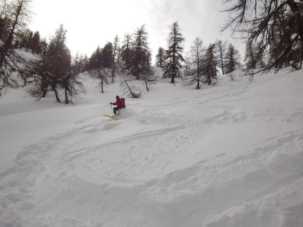 Oggi neve esagerata in zona Frais. Le nevicate degli ultimi giorni hanno messo mezzo metro di neve su tutto il percorso. Traccia ottima fino in punta, solo un po’ ripida ogni tanto…Non ci siamo fidati a scendere il canalino vicino al colle di Naja (dx orografica) perchè scavando mi sembrava che gli strati basali fossero deboli e sopra non fosse sufficientemente assestata, valutate voi. Comunque il boschetto è ottimo. Arrivati alle bergerie del subeyran siamo risaliti a pian mesdì e scesi un po’ dalle piste un po’ fuori.