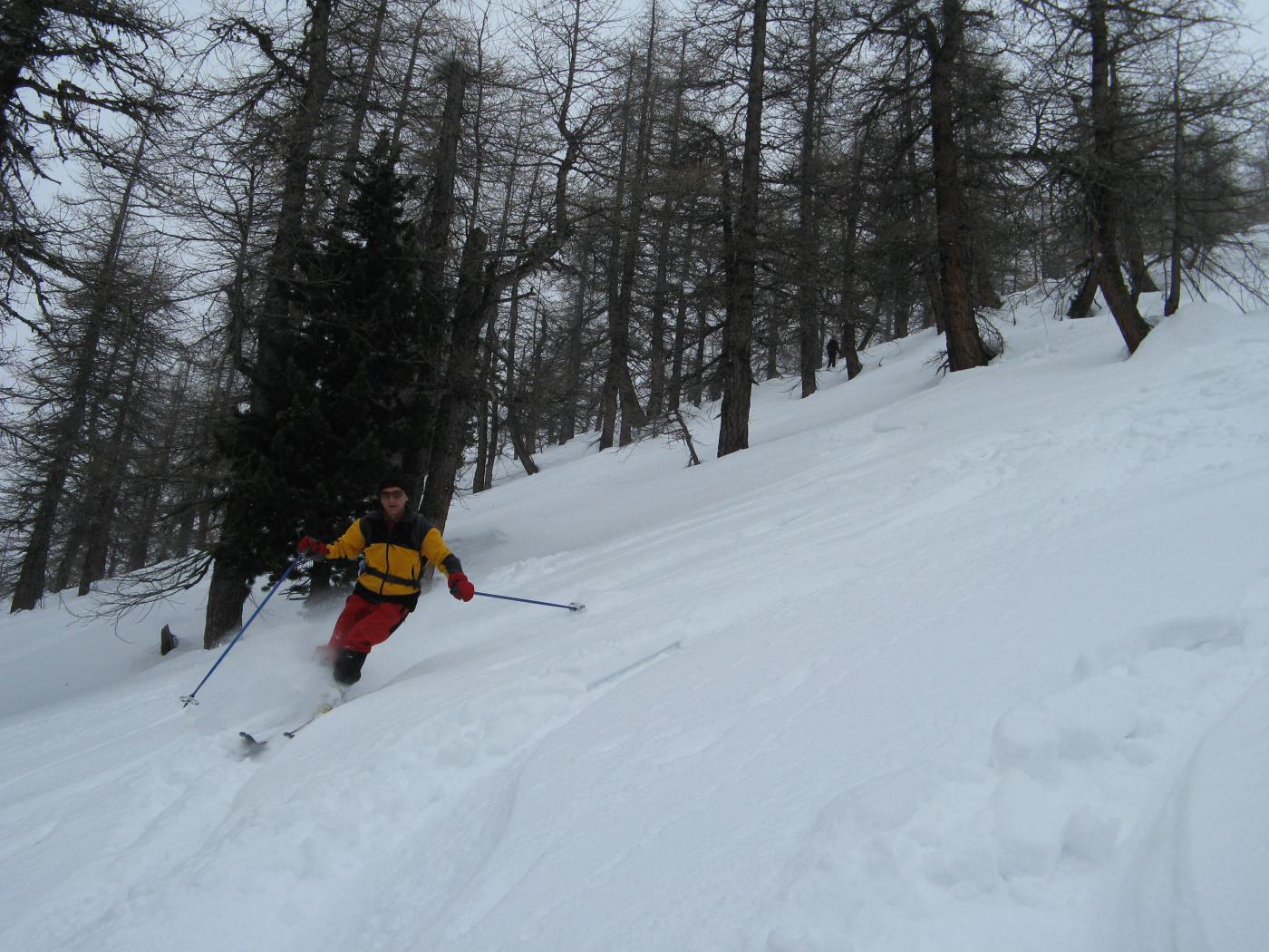 Meteo peggio del previsto, nebbia fitta da poco sopra l’uscita della cresta di Naja che ci ha fatto desistere dall’idea originale di salire al Ciantiplagna;seguito a fatica le tracce di chi ci precedeva, per fortuna che conoscevamo il posto. Ultimi metri a piedi, pietre appena coperte da un filo di neve. Discesa fino al limite del bosco a naso, poi nel bosco scesi nel pendio-canale che porta direttamente a Soubeyrand, goduria massima con neve abbondante e farinosa.Da li in poi neve un pò più crostosa e poi stradina fino all’auto.