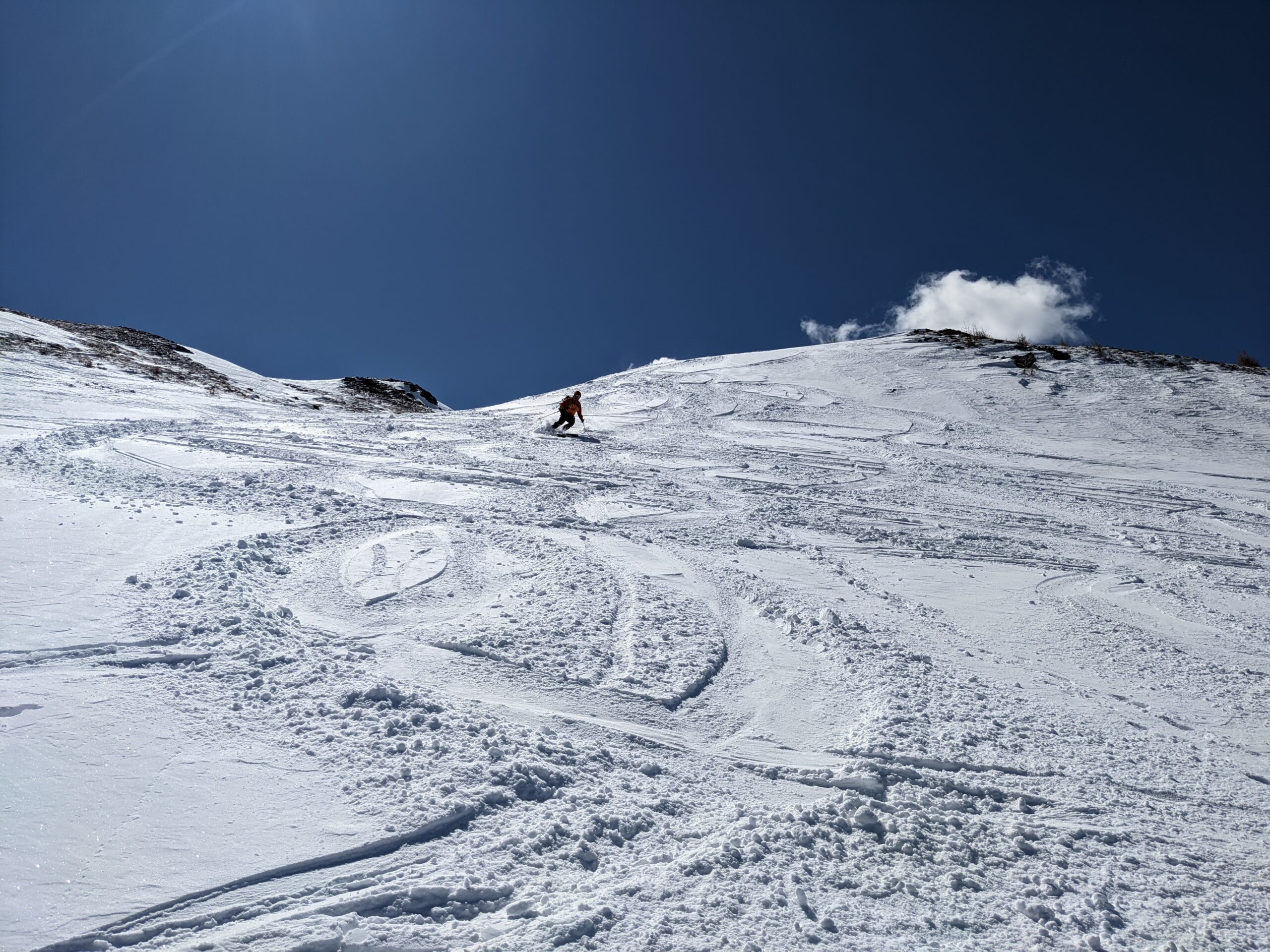 15′ a piedi fino alle baite. Risaliti lungo il torrente con tratti con poca neve, dal pianoro abbastanza neve. Parte alta con 5-10 cm di farina su fondo duro (volendo 5 stelle), canale e pianoro inferiore neve trasformata oggi molto bella. Pezzo nel bosco a salvare le gambe. Molto meglio del previsto