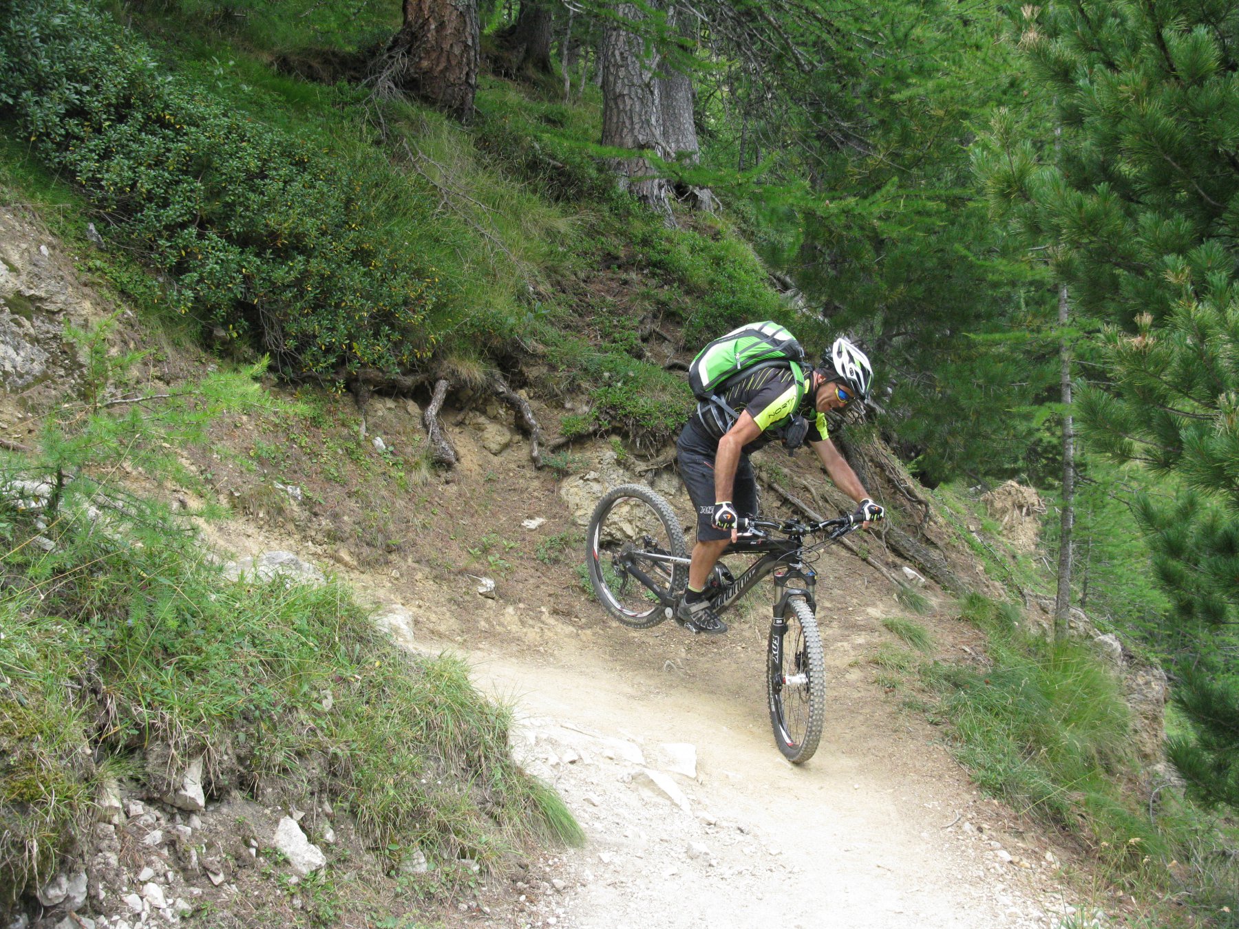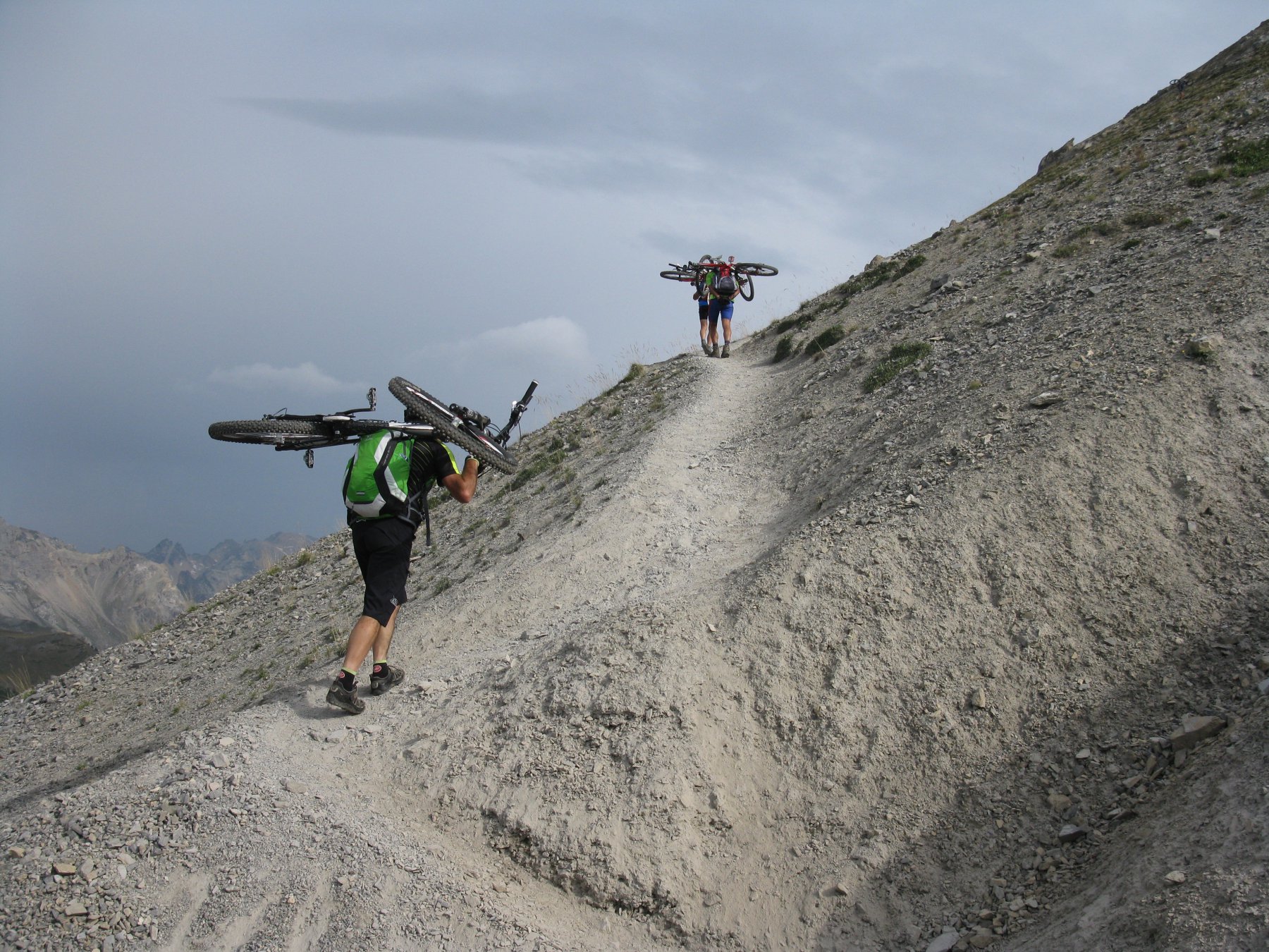 Per non fare più strada possiamo intraprendere la salita dritto avanti a noi dove parte una traccia dapprima ciclabile poi molto ripida su terreno scivoloso che tagliando il sentiero originale ci fa guadagnare quota molto velocemente raggiungendo poi la cima dell’Aguille Rouge (2545m) in circa un’ora. Per la discesa conviene seguire il sentiero originale che con alcuni lunghi traversi (sempre ciclabile) ci conduce nuovamente al pianoro. Ora puntiamo al Col des Thures e all’omonimo lago dal quale parte il bellissimo sentiero che, con buon scorrimento e discreto impegno, ci conduce al Rif. 3 Alpini in Valle Stretta.