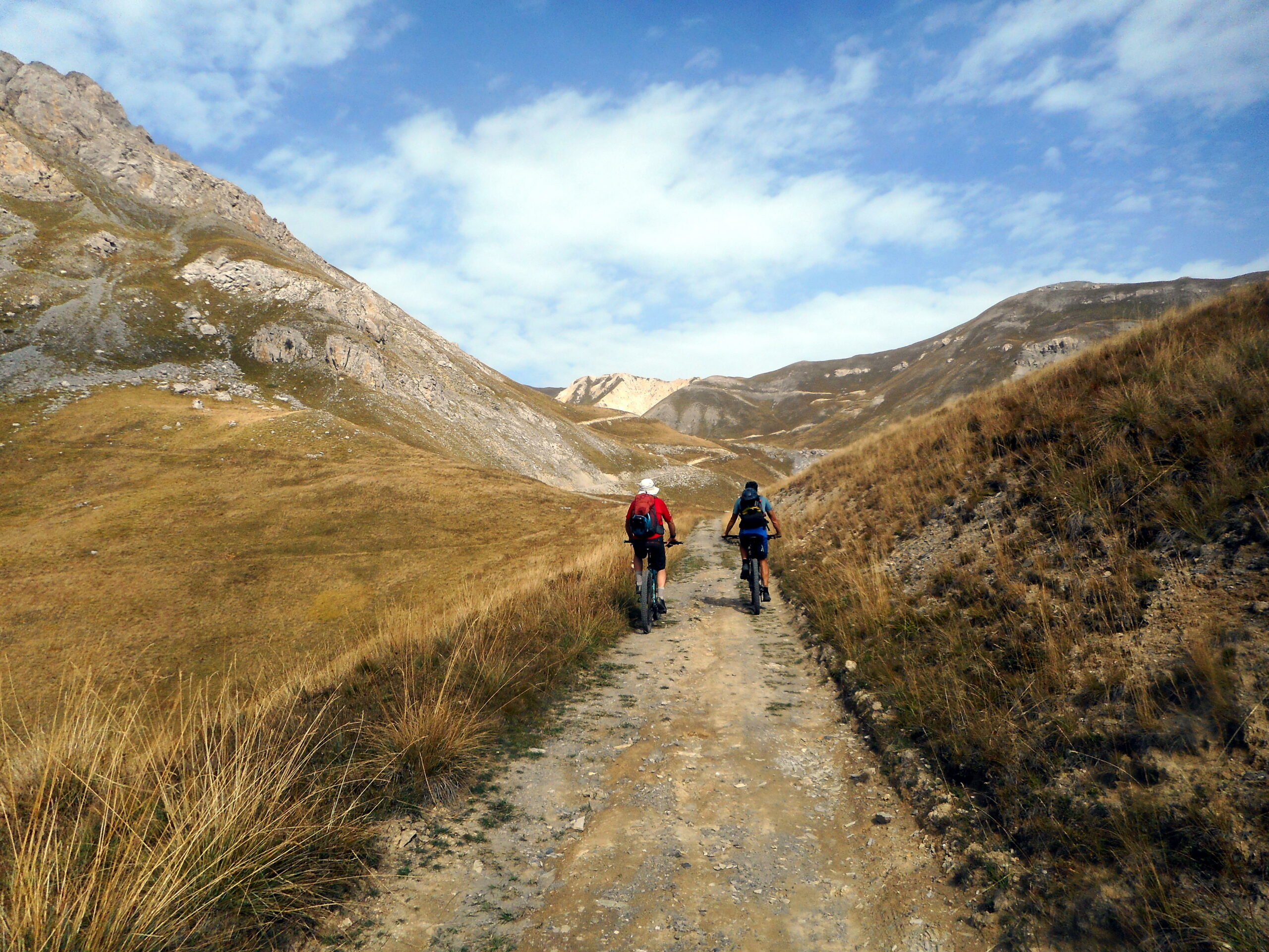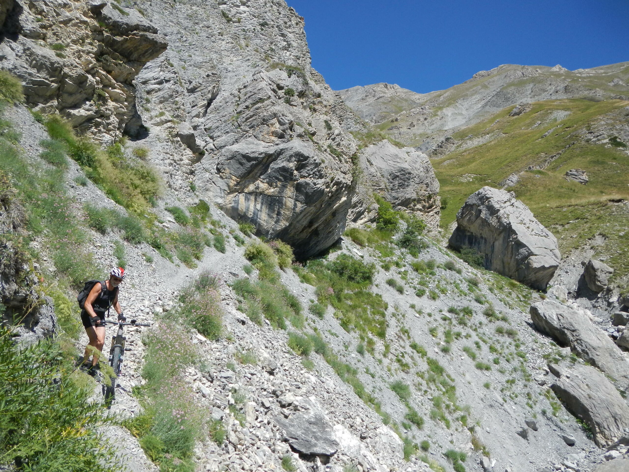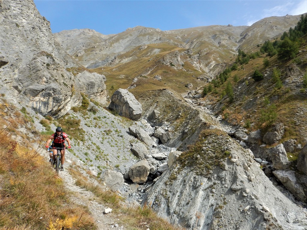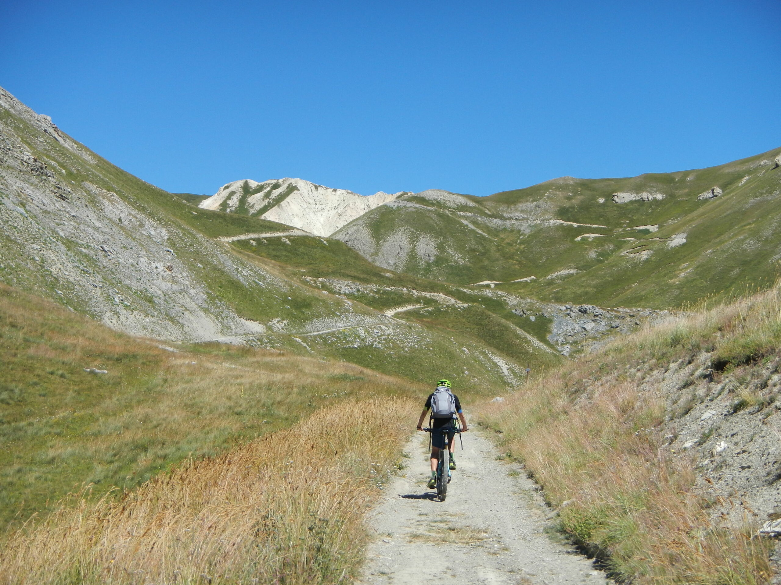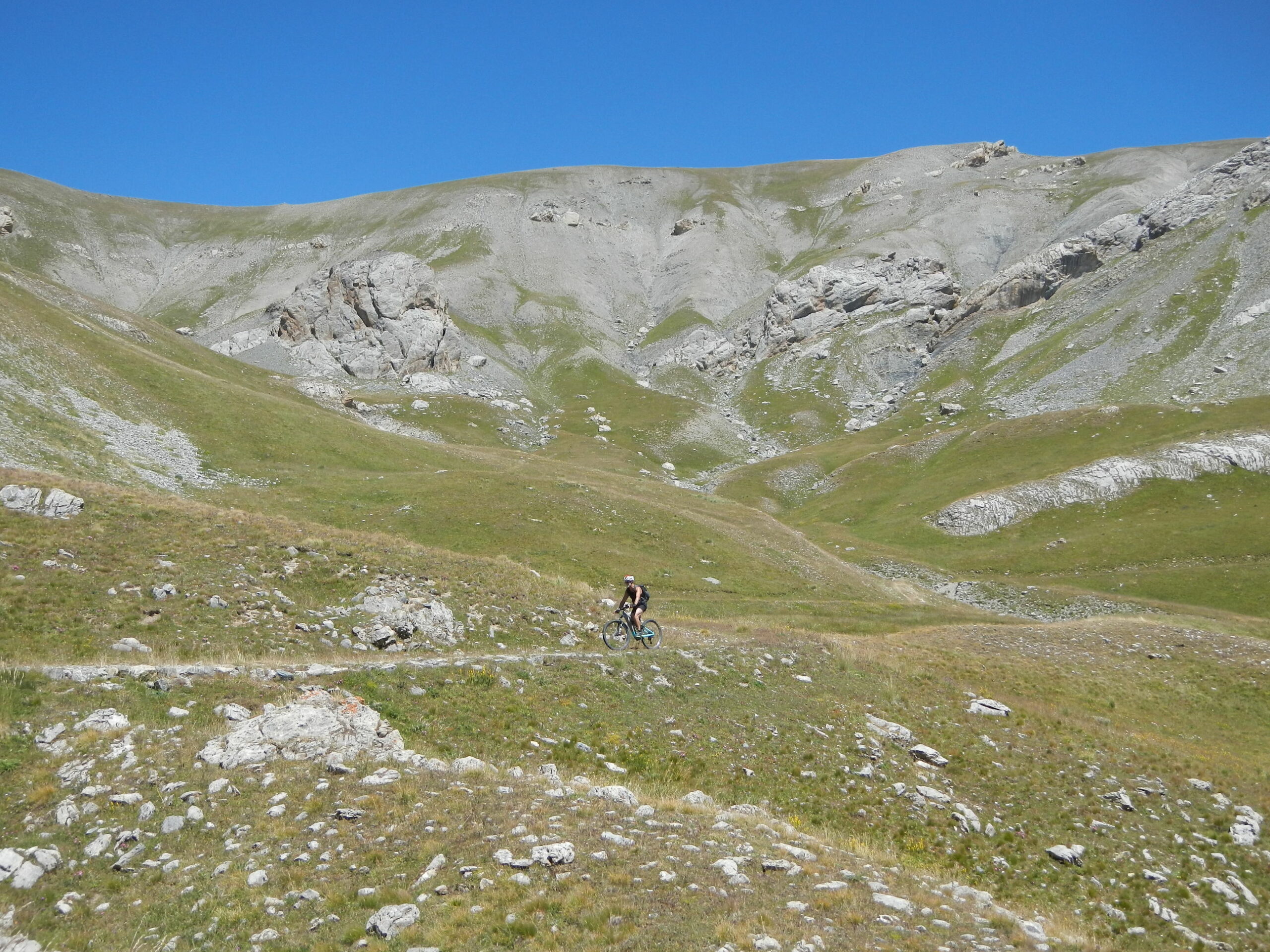 Superato il Colle in discesa, arriviamo ad un trivio e senza prendere la sterratone della Gardetta, svoltiamo a spigolo a sx per quella che era una ex strada militare ora diventata praticamente un single-track (indicazioni dei cartelli) e che inizialmente sale e poi si mantiene meravigliosamente in quota con aerei e spettacolari traversi. Si circumnaviga il M. Bodoira e con un ultimo traverso si giunge al Colle del Vallonetto (2530 m). Successivamente (dx) la strada diventa un bel tappeto erboso, e superati alcuni gias, oltrepassato il Colle d Montagnetta (2189 m) ci infiliamo a dx per il selvaggio vallone del Servagno al cospetto dell’ Oserot e della Rocca Brancia. Qui, come del resto anche prima, il single-track impone concentrazione ma regala anche beklle soddisfazioni nel percorrere i numerosi tornantini tecnici che si incontrano.