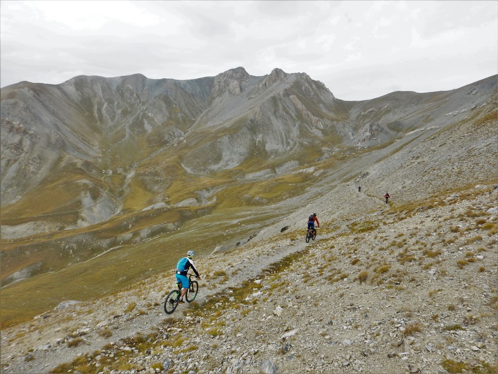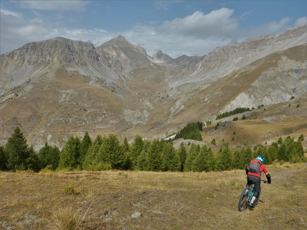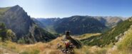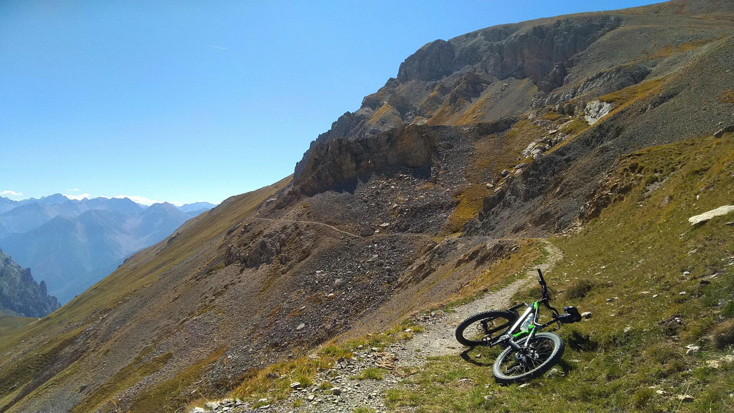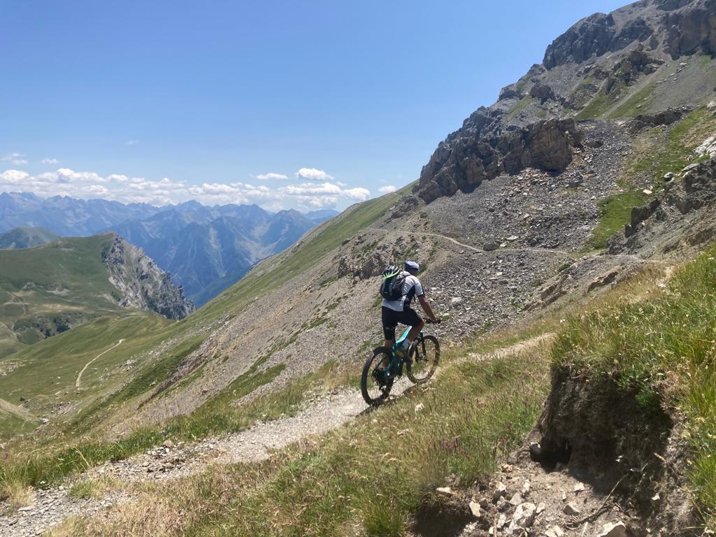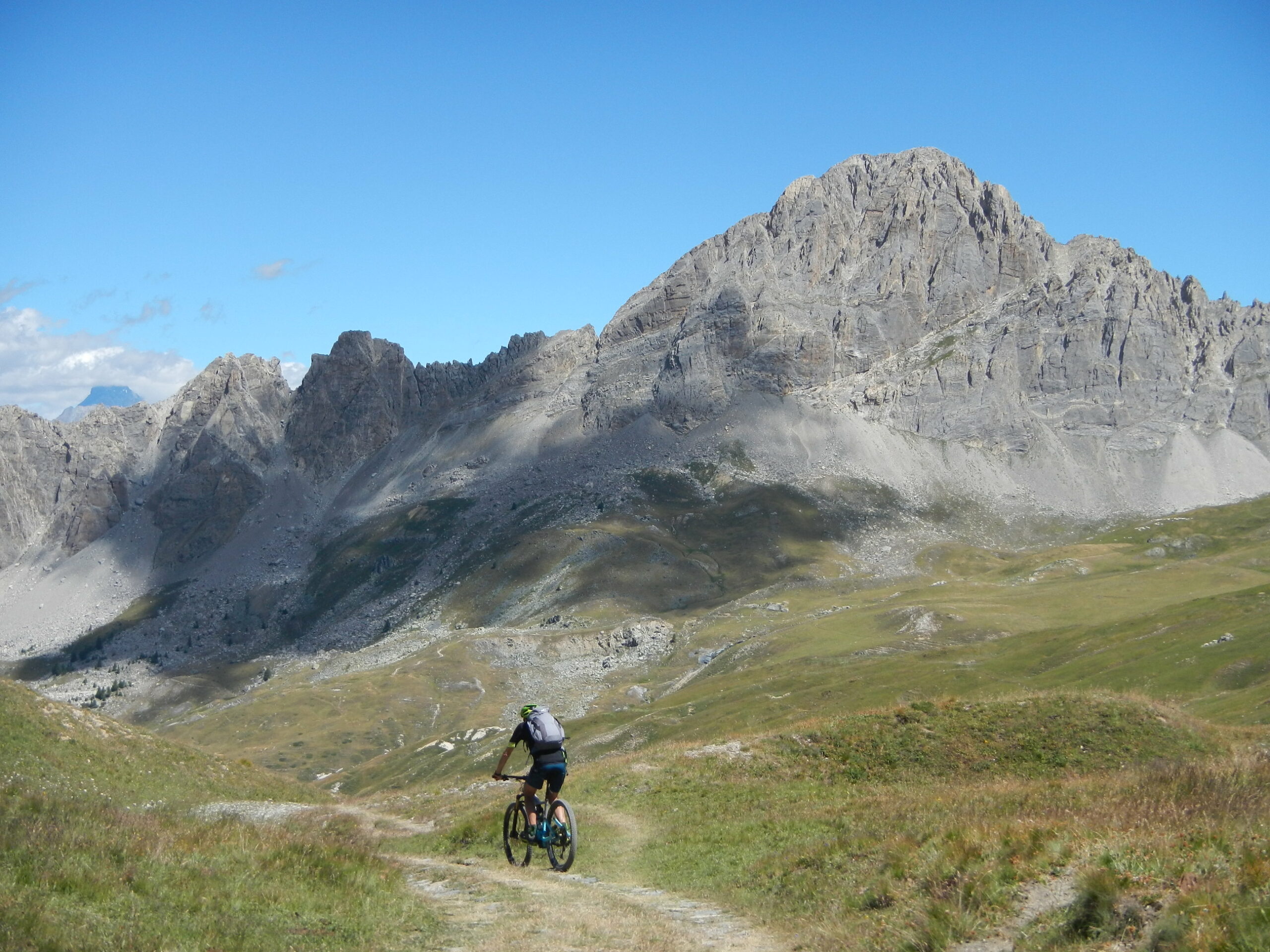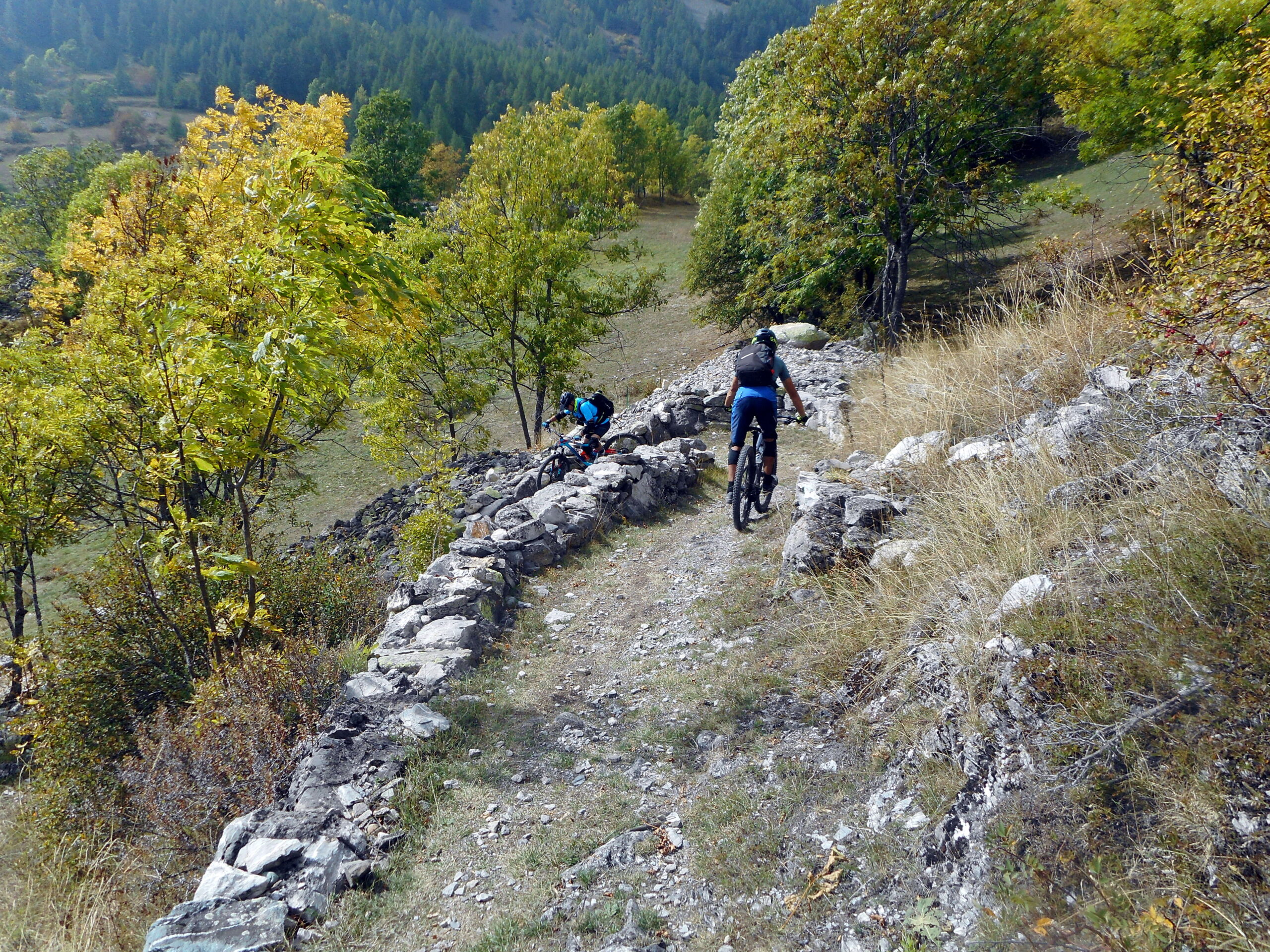 Superato il Colle in discesa, arriviamo ad un trivio e senza prendere la sterratone della Gardetta, svoltiamo a spigolo a sx per quella che era una ex strada militare ora diventata praticamente un single-track (indicazioni dei cartelli) e che inizialmente sale e poi si mantiene meravigliosamente in quota con aerei e spettacolari traversi. Si circumnaviga il M. Bodoira e con un ultimo traverso si giunge al Colle del Vallonetto (2530 m). Successivamente (dx) la strada diventa un bel tappeto erboso, e superati alcuni gias, oltrepassato il Colle d Montagnetta (2189 m) ci infiliamo a dx per il selvaggio vallone del Servagno al cospetto dell’ Oserot e della Rocca Brancia. Qui, come del resto anche prima, il single-track impone concentrazione ma regala anche beklle soddisfazioni nel percorrere i numerosi tornantini tecnici che si incontrano.