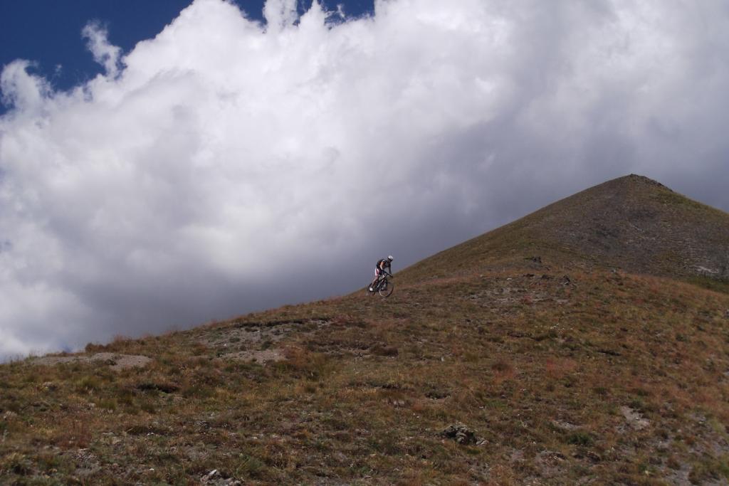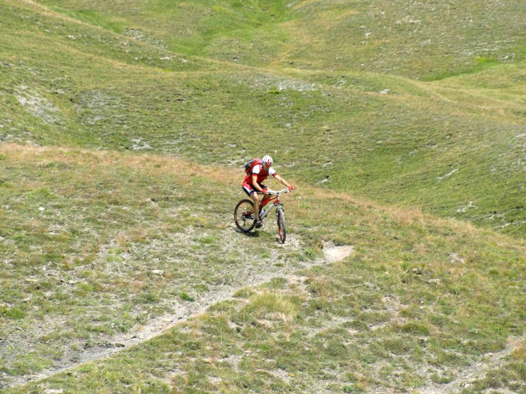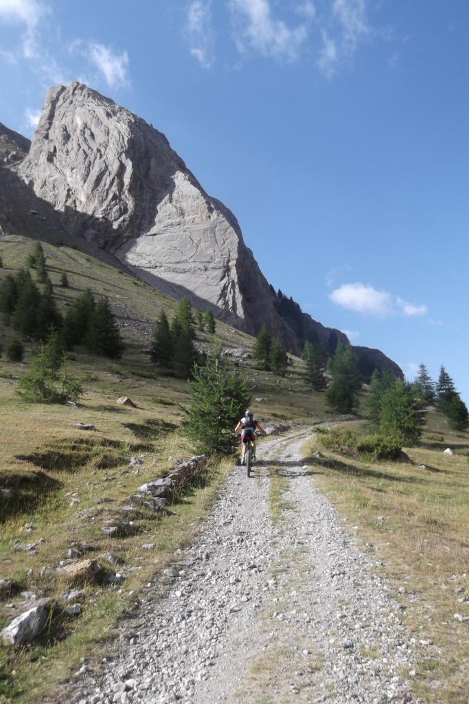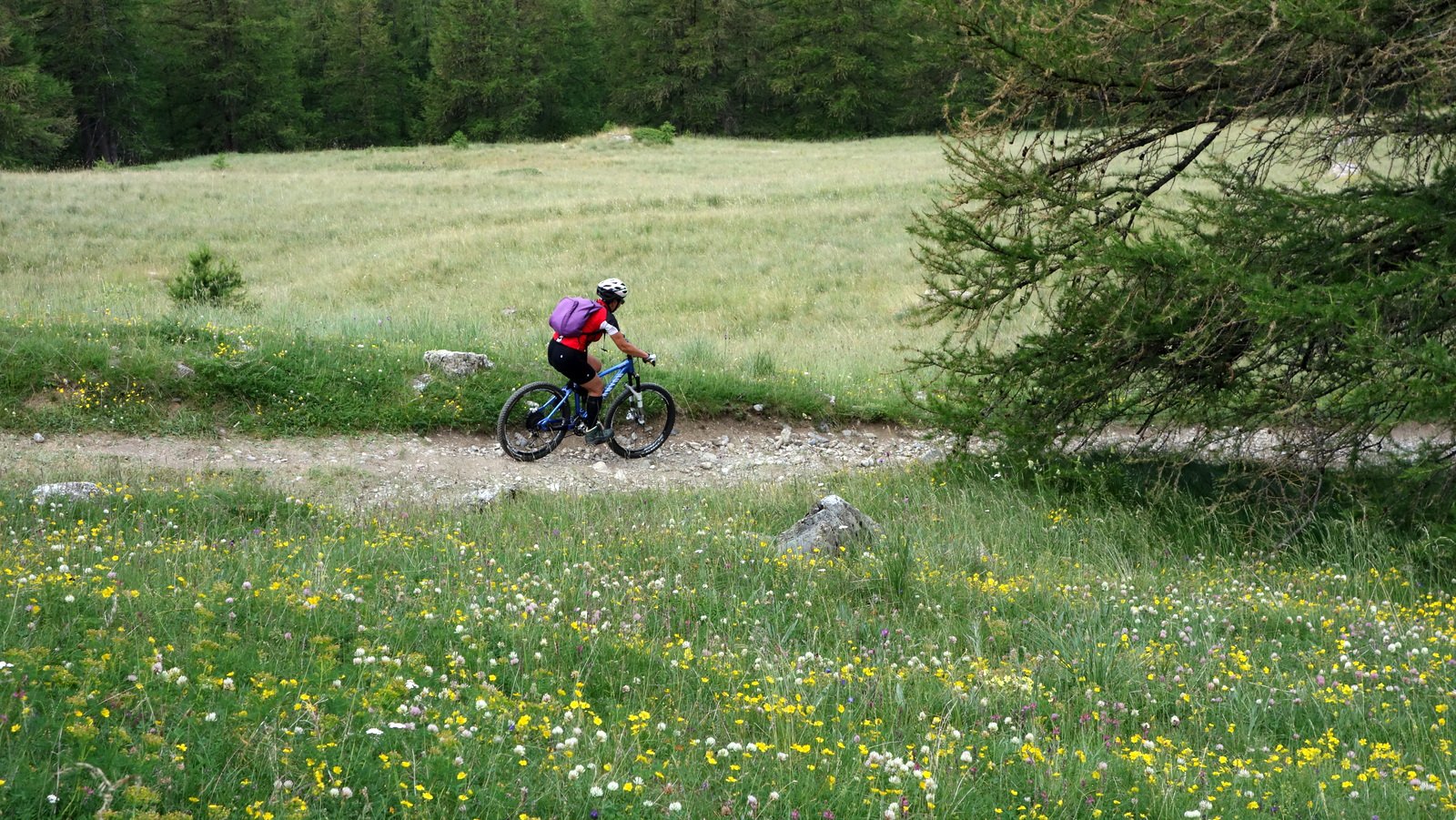 La bella discesa sul versante opposto inizia con alcuni tornantini per poi diventare più scorrevole; prima di entrare nell’abitato di Fouillouse imboccare la strada larga sulla sinistra che,dopo aver attraversato una bellissima pineta, porta ad una malga su un vasto e panoramico pianoro; da qui i tratti ciclabili verso il Col de Mirandol sono pochi e occorre spingere la bici tenendosi sempre sulla sinistra per non perdere quota.