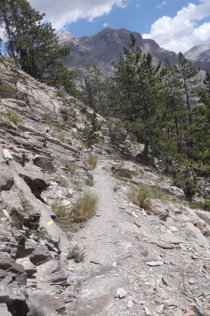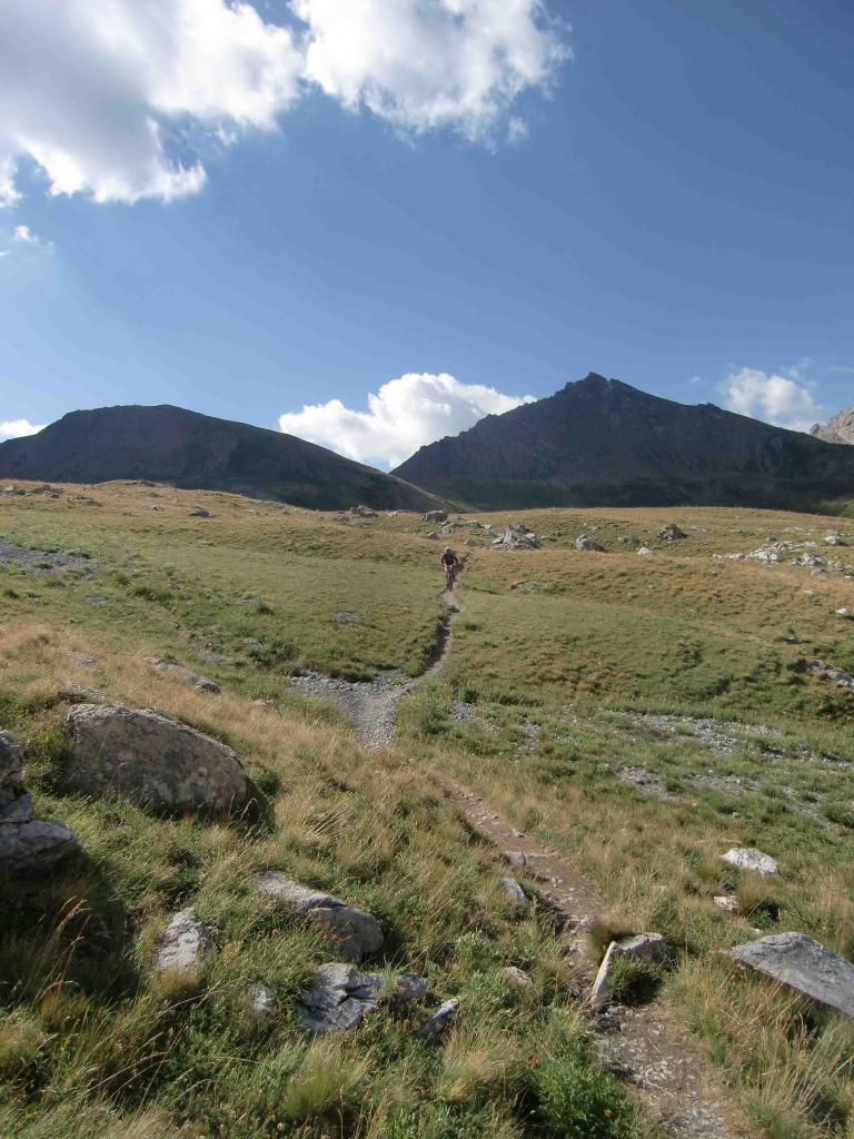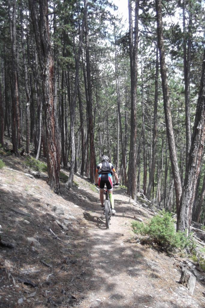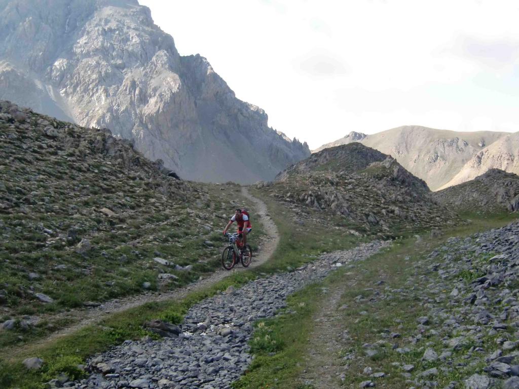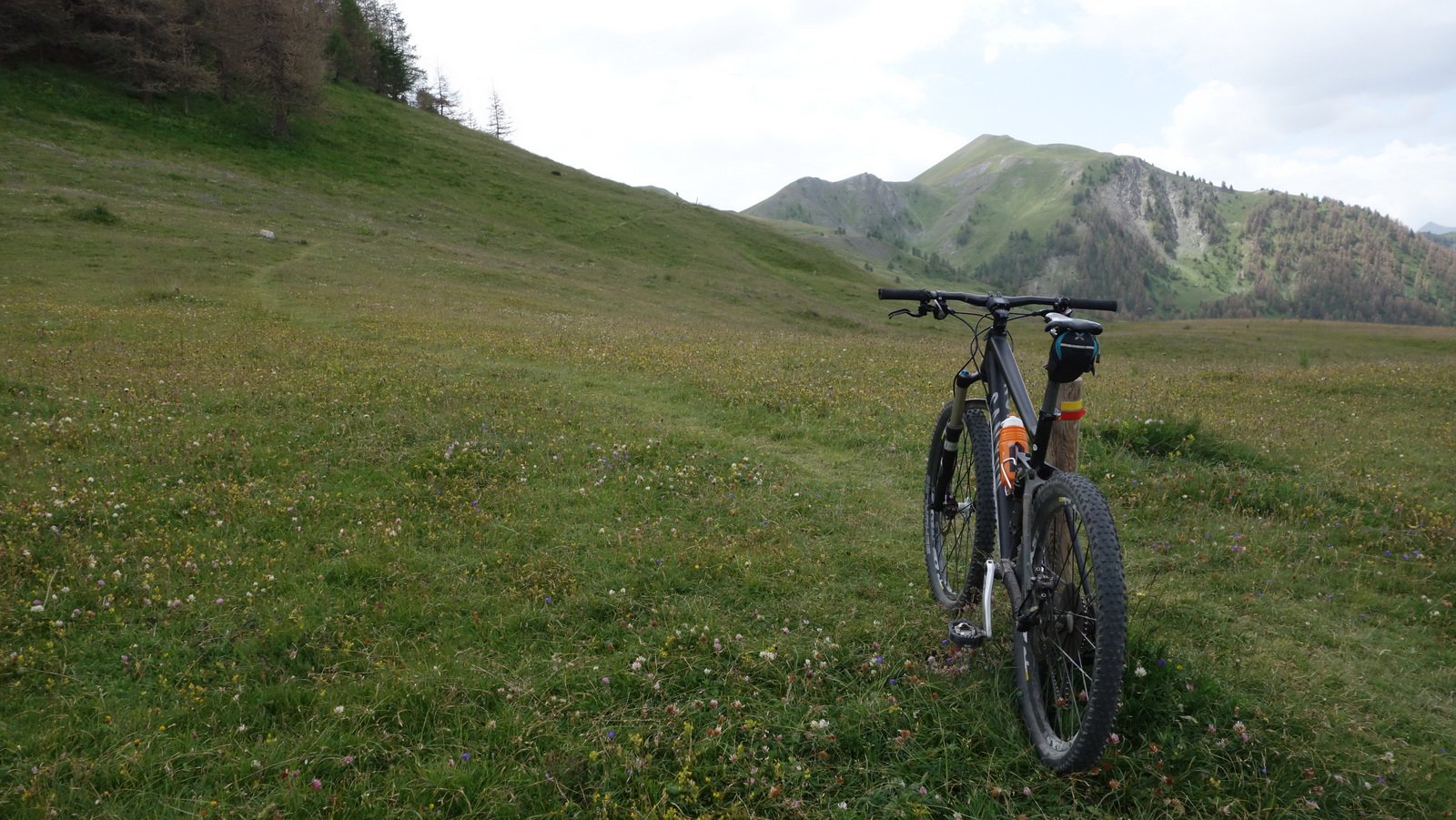 La bella discesa sul versante opposto inizia con alcuni tornantini per poi diventare più scorrevole; prima di entrare nell’abitato di Fouillouse imboccare la strada larga sulla sinistra che,dopo aver attraversato una bellissima pineta, porta ad una malga su un vasto e panoramico pianoro; da qui i tratti ciclabili verso il Col de Mirandol sono pochi e occorre spingere la bici tenendosi sempre sulla sinistra per non perdere quota.