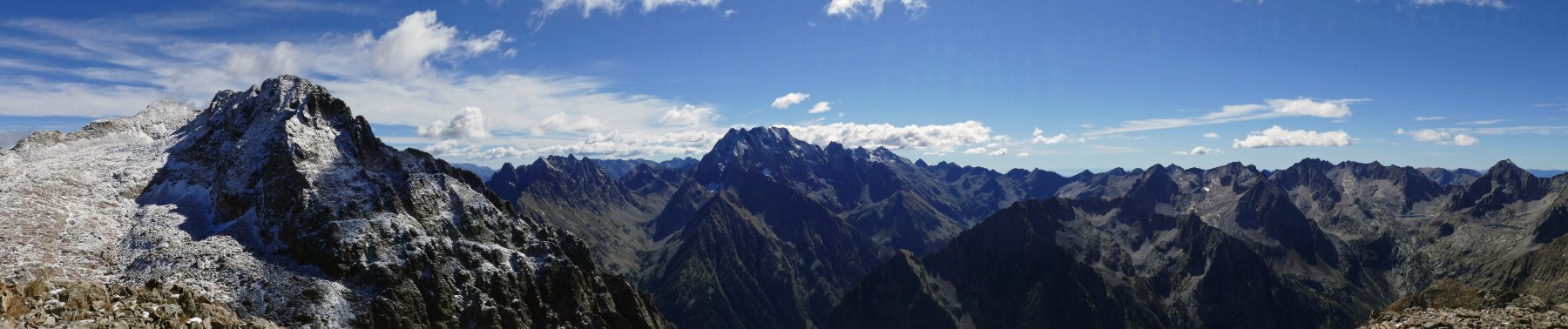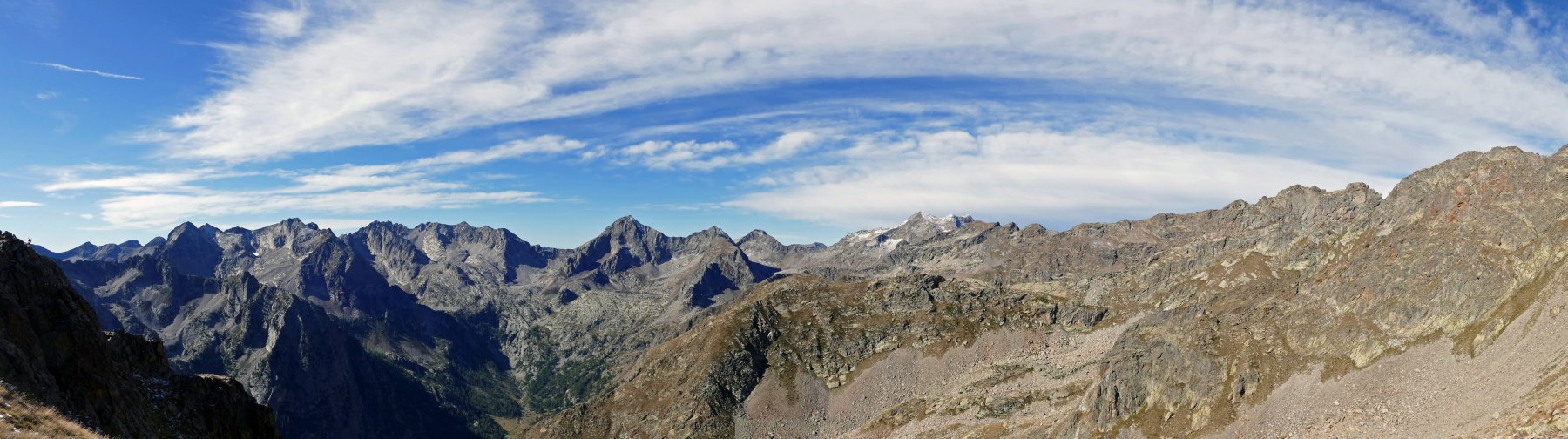 Ampio panorama dal colle, in evidenza il versante settentrionale delle cime del Matto e la Serra dell’ Argentera, entrambi già in veste autunnale, ma la vista oggi spaziava fino al Cervino e al Monte Rosa.