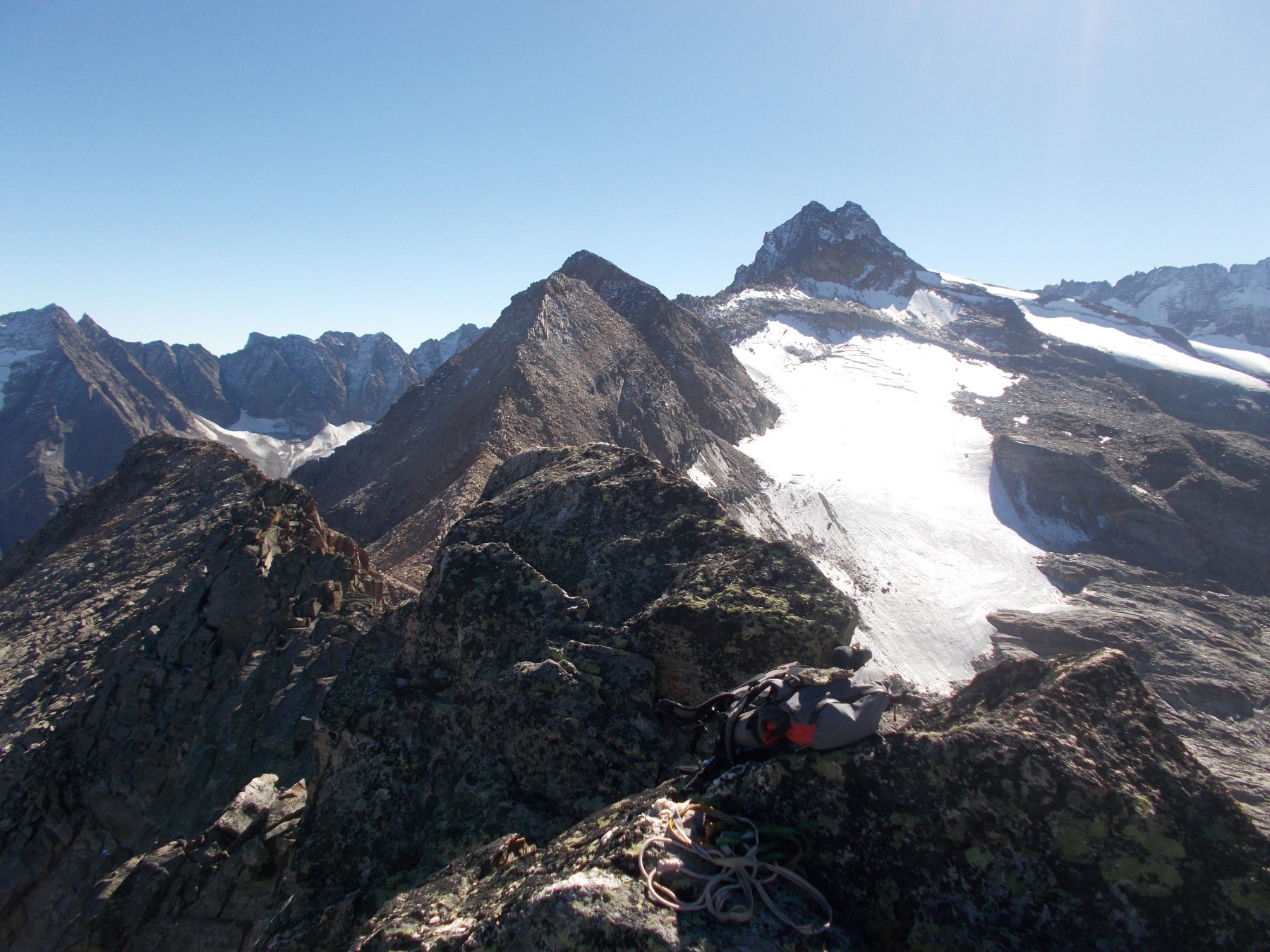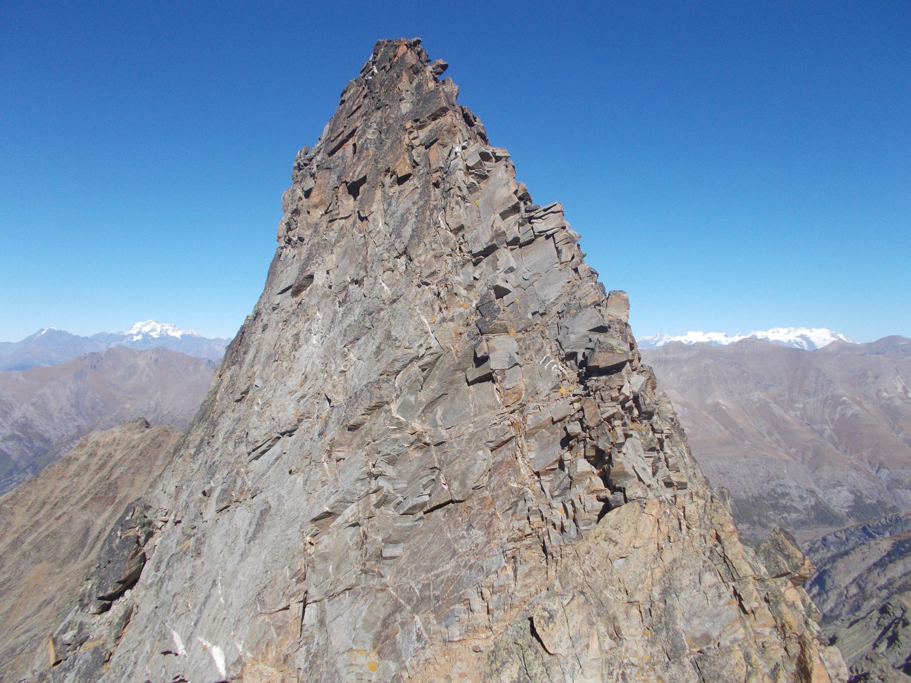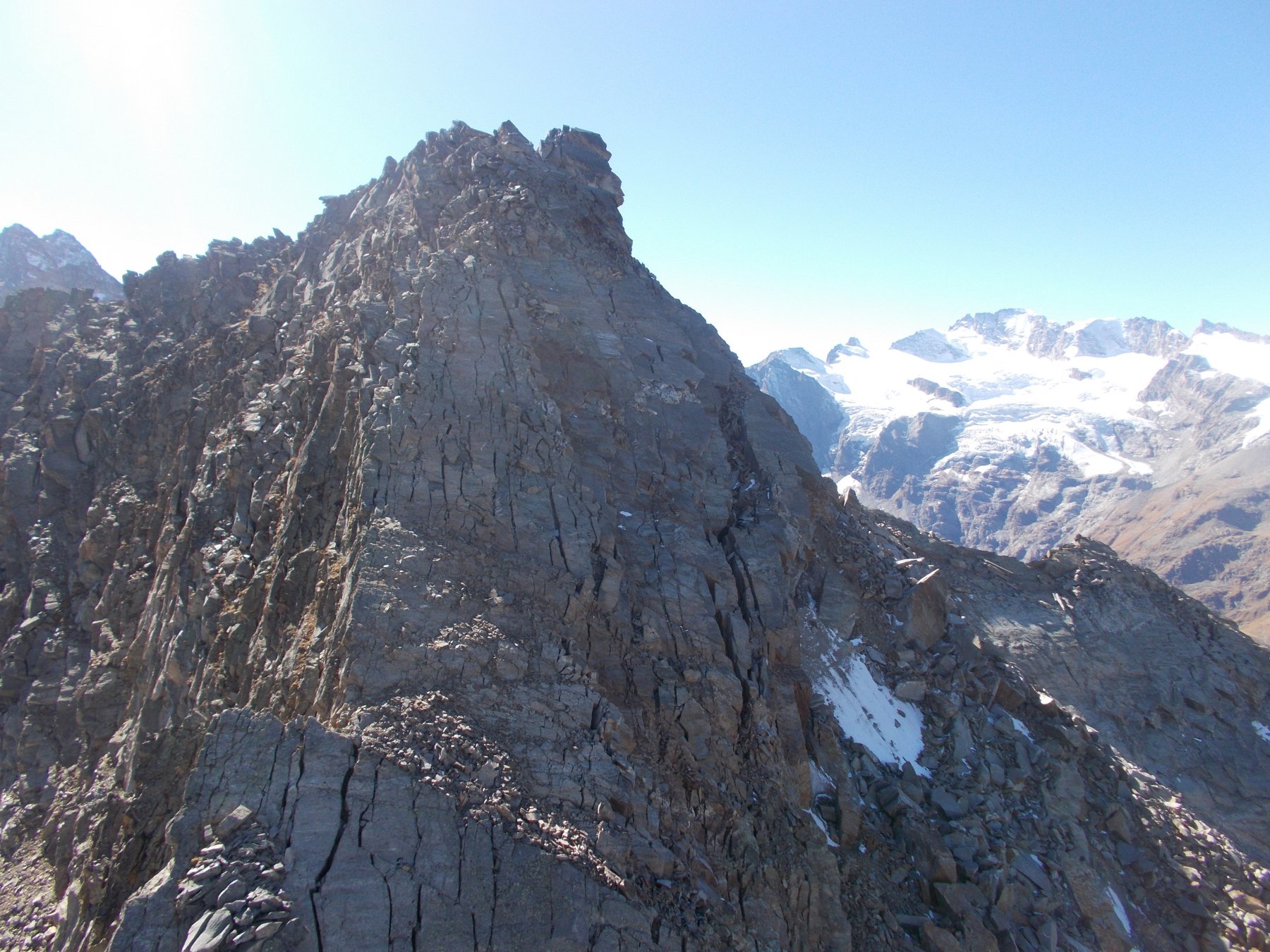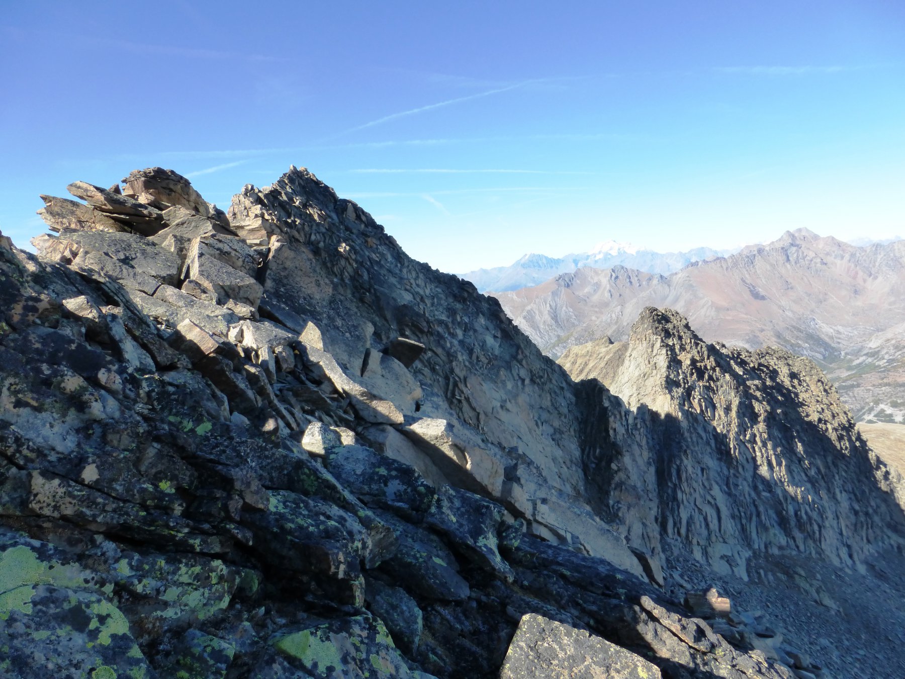 La cresta sulla dx da subito appare difficile specie sul filo che comunque si evita salendo di poco alla su sx, per placche canalini e spigoli vari da aggirare (alcuni passi di III, altrimenti II II+), roccia nel complesso buona in questa fase iniziale. Non sara piu’ cosi per per tutto il resto del tragitto, la parte centrale cosi come quella finale dove ogni pietra muove. Una serie di salti di roccie accatastate, caratterizzano la cresta in questa seconda fase che precede l’arrivo sull’anticima innominata di Valeille (3204m).