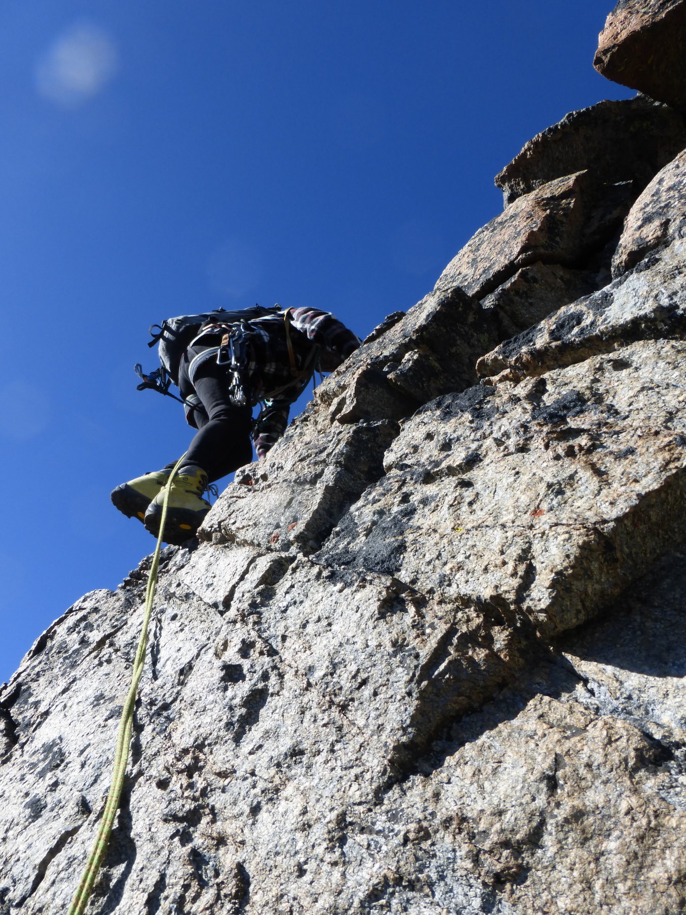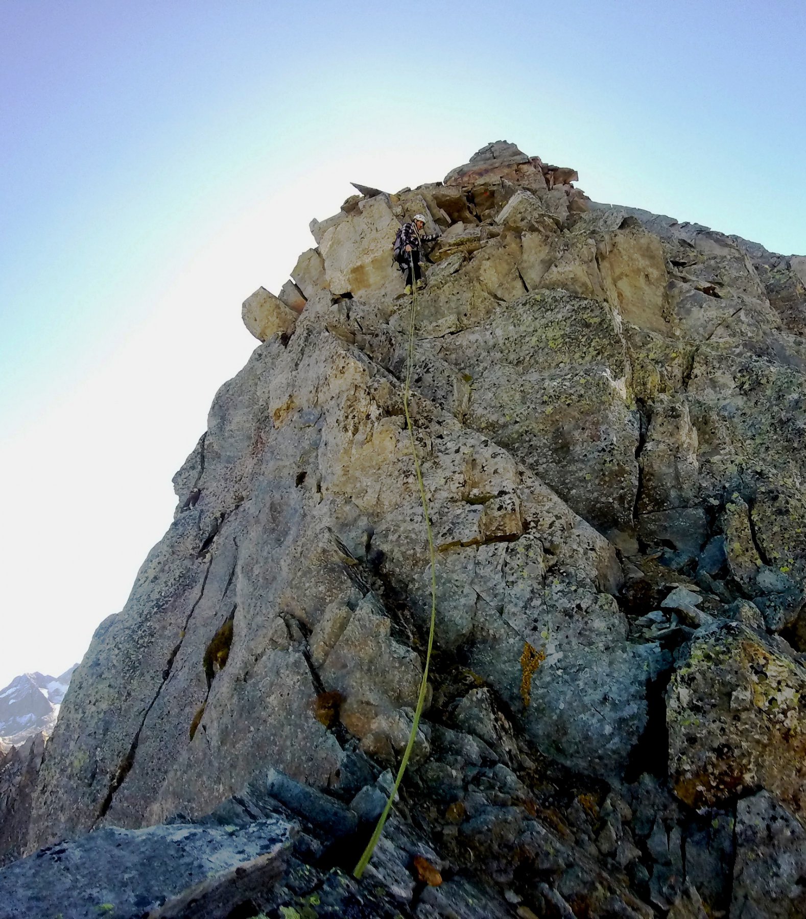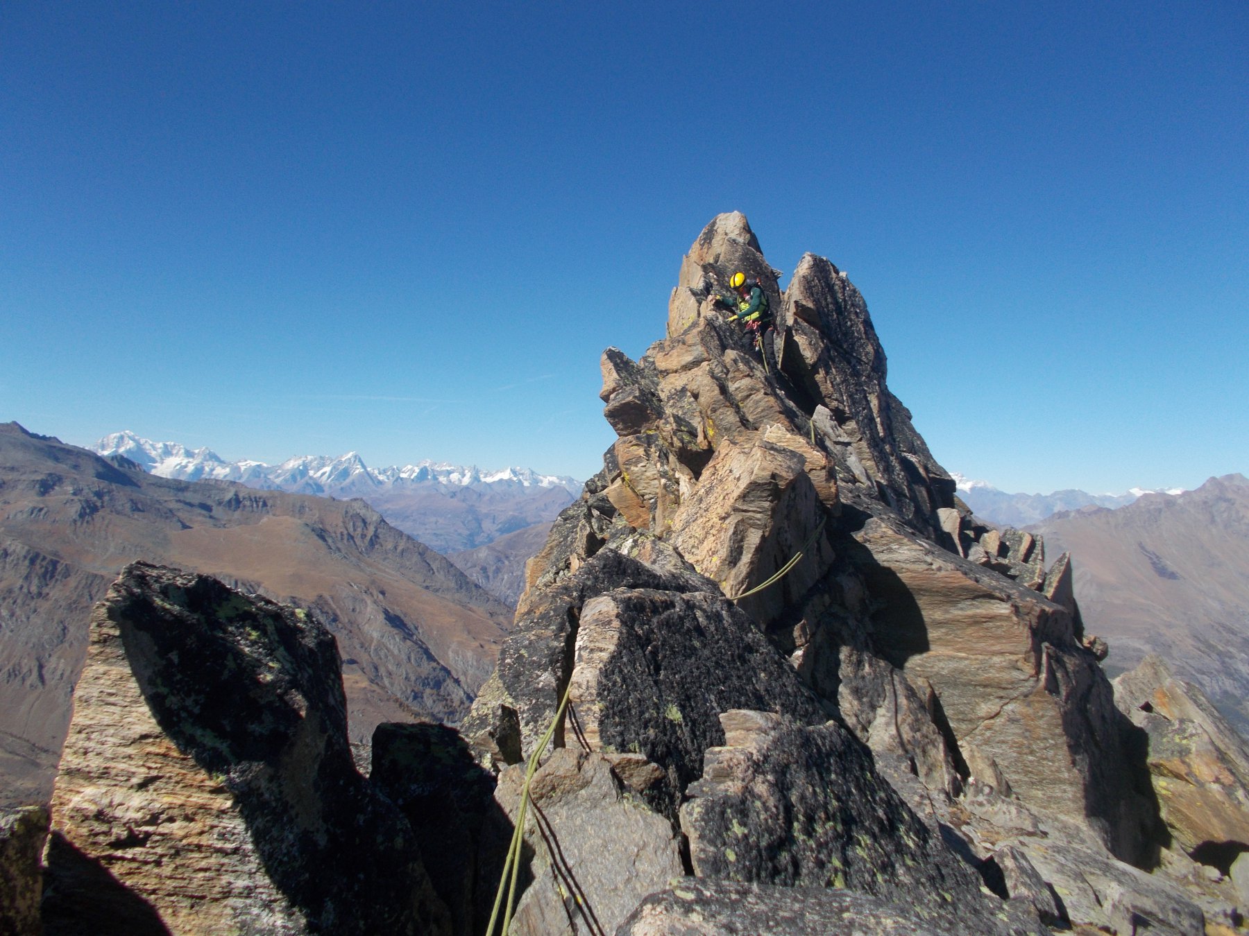 La cresta sulla dx da subito appare difficile specie sul filo che comunque si evita salendo di poco alla su sx, per placche canalini e spigoli vari da aggirare (alcuni passi di III, altrimenti II II+), roccia nel complesso buona in questa fase iniziale. Non sara piu’ cosi per per tutto il resto del tragitto, la parte centrale cosi come quella finale dove ogni pietra muove. Una serie di salti di roccie accatastate, caratterizzano la cresta in questa seconda fase che precede l’arrivo sull’anticima innominata di Valeille (3204m).