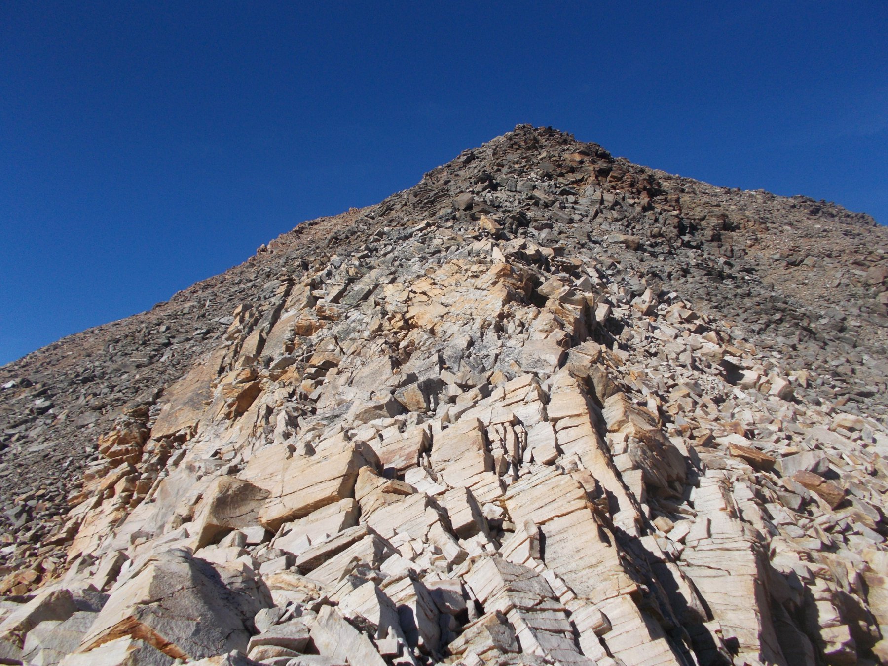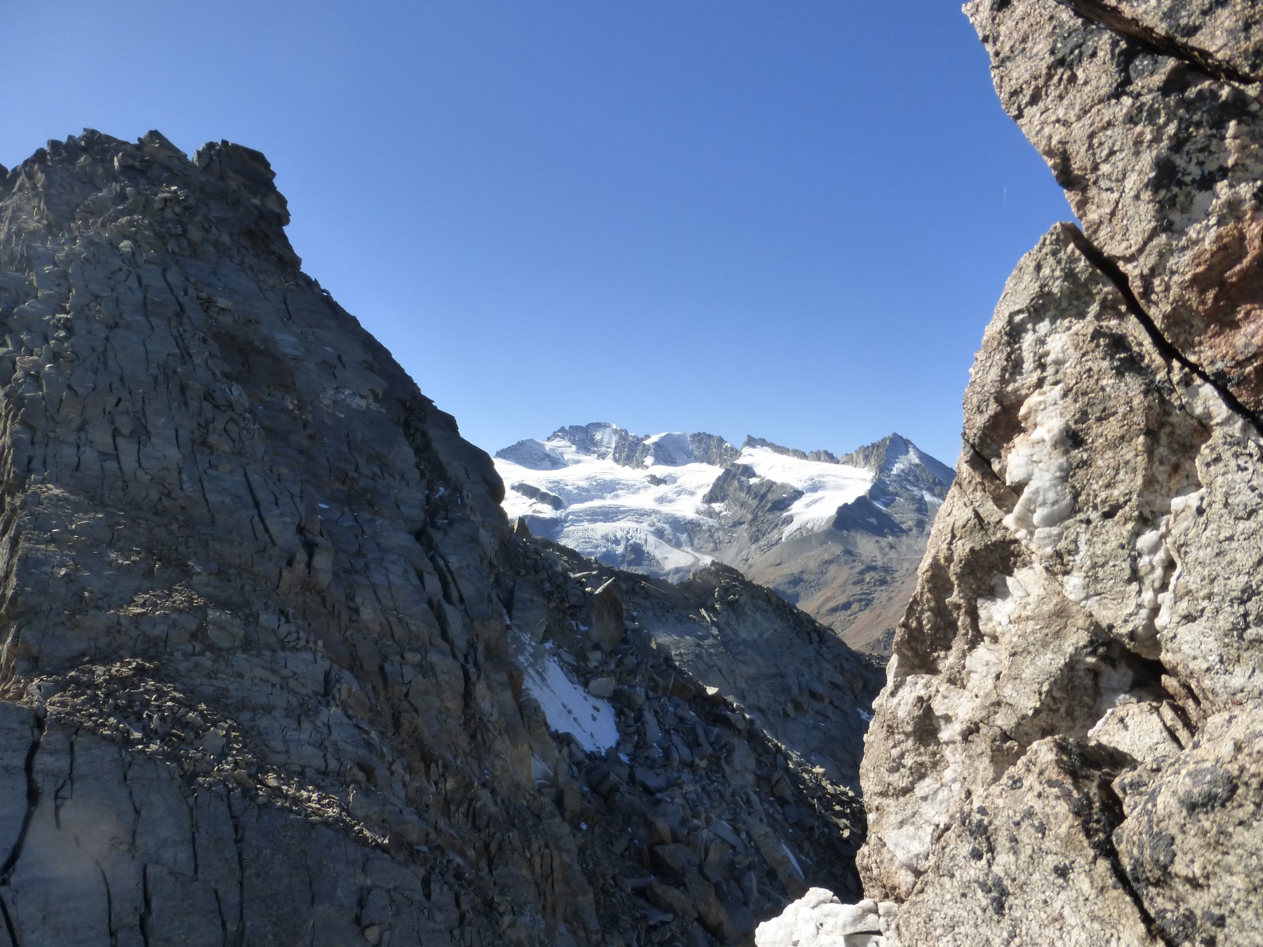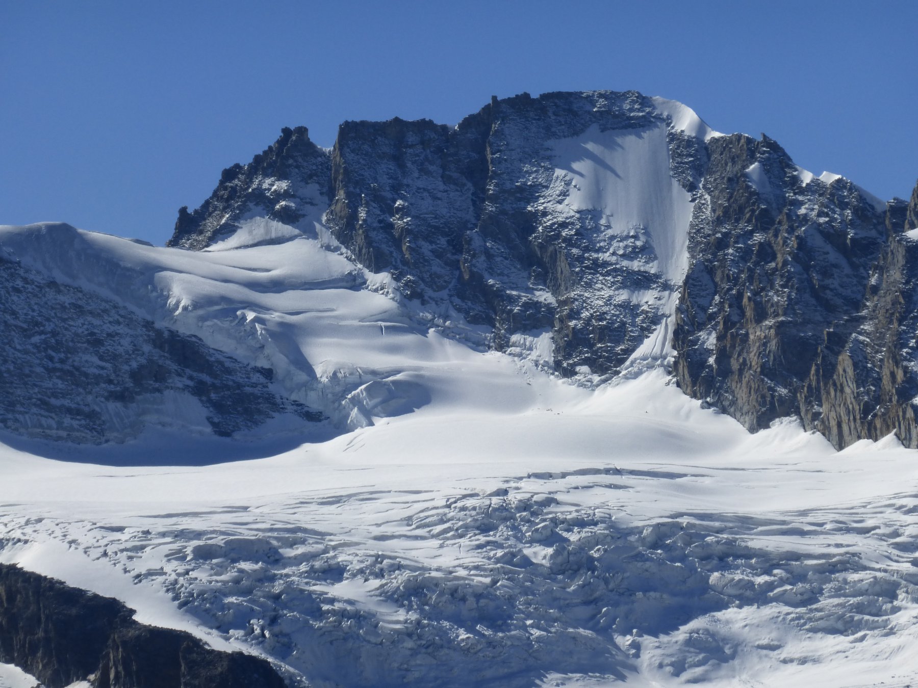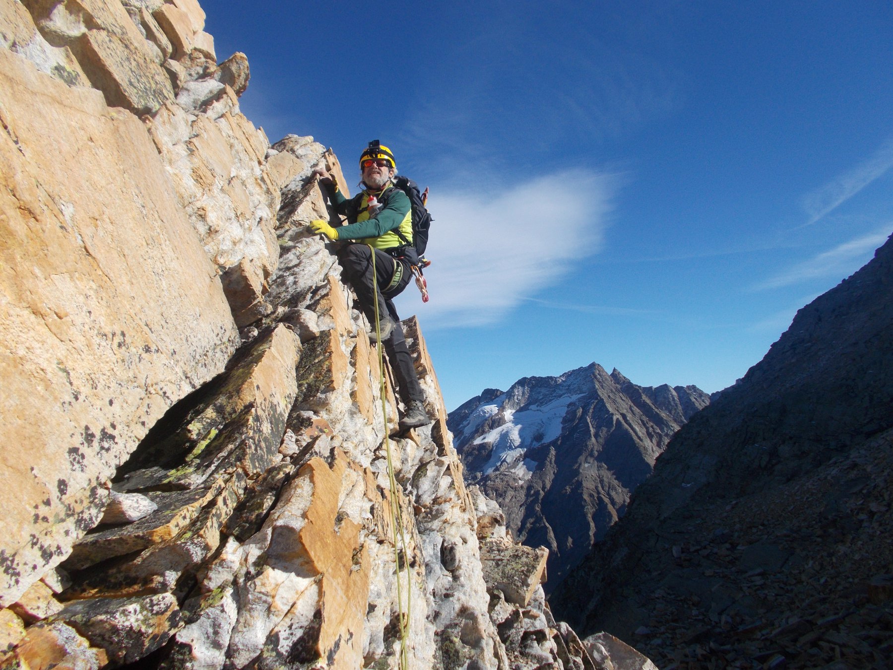 La cresta sulla dx da subito appare difficile specie sul filo che comunque si evita salendo di poco alla su sx, per placche canalini e spigoli vari da aggirare (alcuni passi di III, altrimenti II II+), roccia nel complesso buona in questa fase iniziale. Non sara piu’ cosi per per tutto il resto del tragitto, la parte centrale cosi come quella finale dove ogni pietra muove. Una serie di salti di roccie accatastate, caratterizzano la cresta in questa seconda fase che precede l’arrivo sull’anticima innominata di Valeille (3204m).